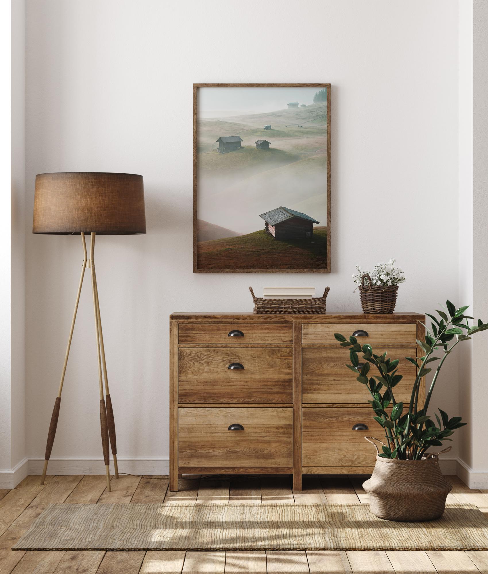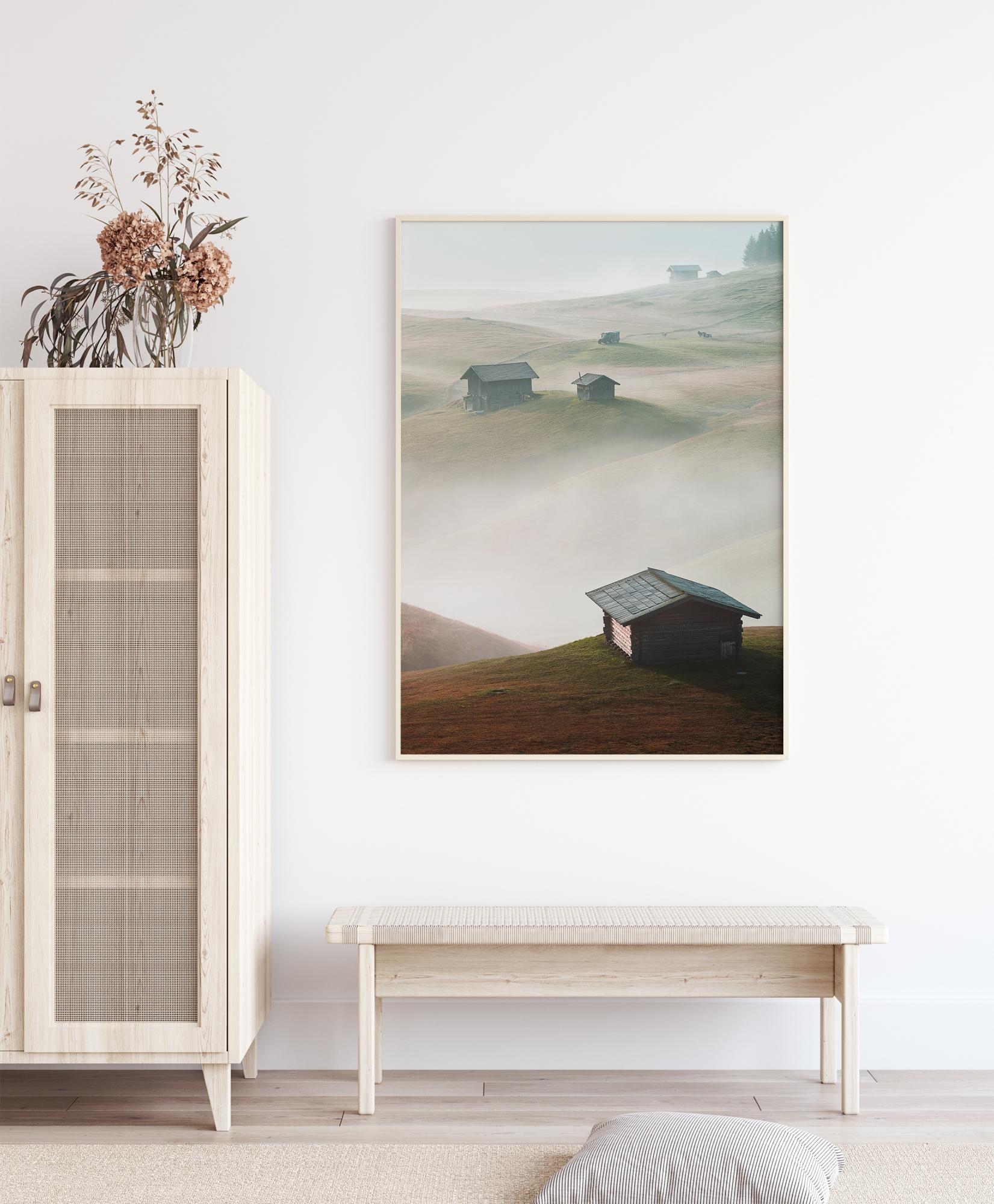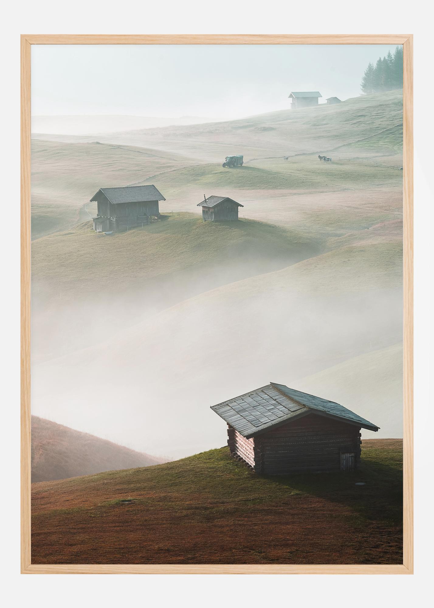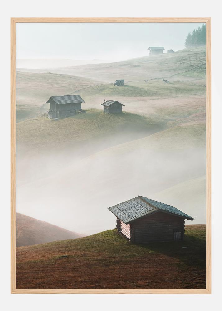 En magisk poster med hus som står på kullar som höjer sig över dimman och molnen nedanför. Varje liten stuga sticker ut på de böljande gröna kullarna. Dimman mellan husen får dem att se ut som om öar skiljer dem från varandra. Förlora dig själv i denna vidsträckta utsikt.