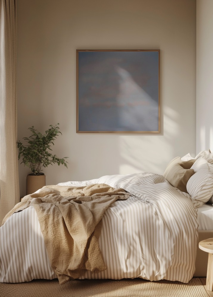 Den här printen har en lugn palett med dova blå toner och inslag av grått som smälter samman med mjuka, krämiga inslag. Idealisk för de som vill ha ett elegant och stilrent motiv på väggen. Affischen kan enkelt integreras i ett modernt eller minimalistiskt hem.