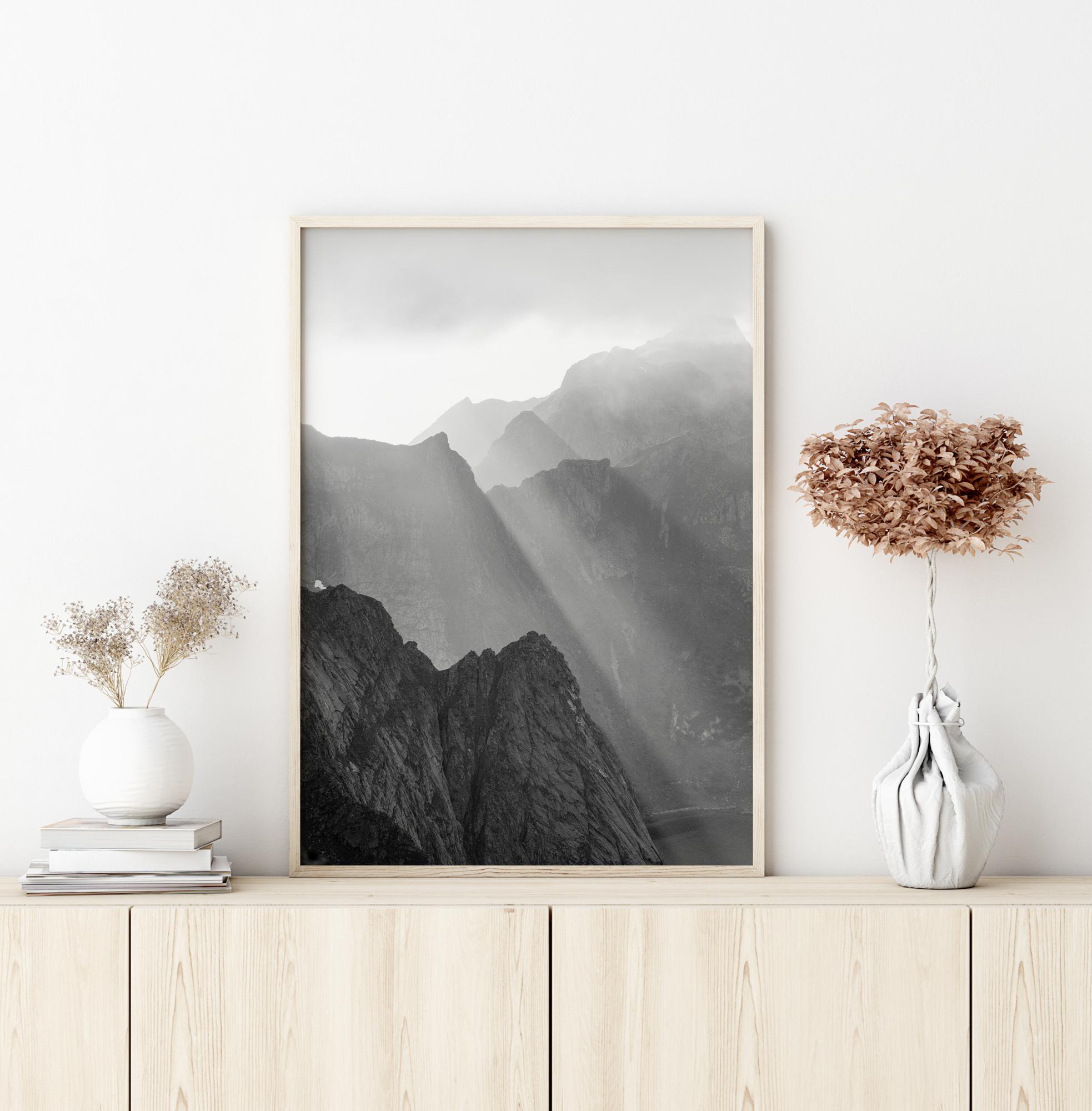 En majestätisk landskapsposter där en kraftig solstråle lyser ner mellan bergen. Bergssidans mörka, kuperade former reser sig upp mot den klart vita himlen där solen lyser igenom. Lägg till den här fantastiska bilden på din vägg för en dramatisk men ändå magisk scen.