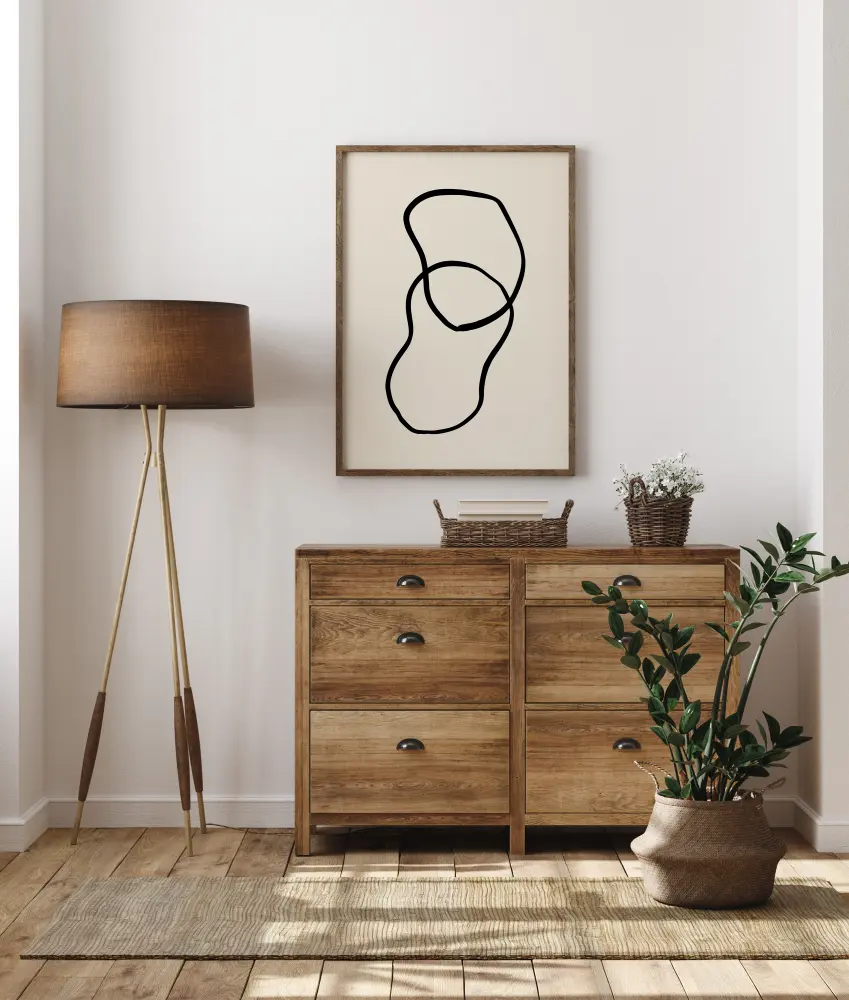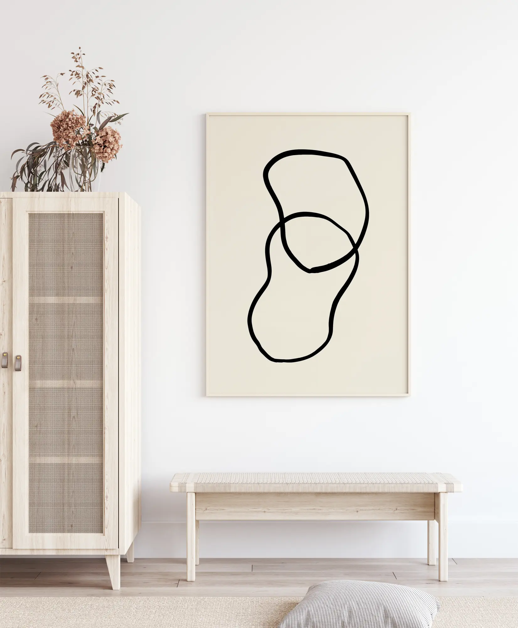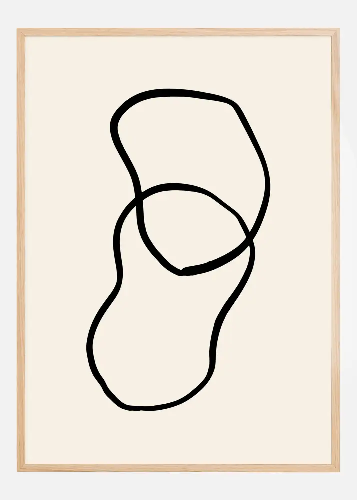 En abstrakt poster med två former vilka flätas samman. Två klumpiga former ritas med kraftiga svarta linjer och korsar varandra för att skapa en tredje form. Häng den här roliga svartvita bilden på en färgstark vägg för att få en modern konstkänsla i hemmet.