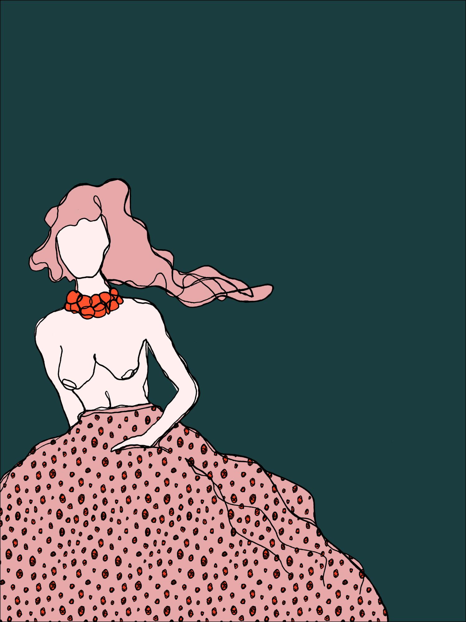 En rolig poster med en flicka mot en grön bakgrund. Kvinnan är topless med en rosa kjol med stora fläckar, vilken böljar ut. Hennes rosaröda hår blåser i sidled i en osynlig vindpust. Ljusa orangefärgade pärlor pryder hennes hals. Med en hand i fickan, ger den här skissen av en kvinna i rörelse en avslappnad känsla, perfekt för en lätt cool väggupphängning.