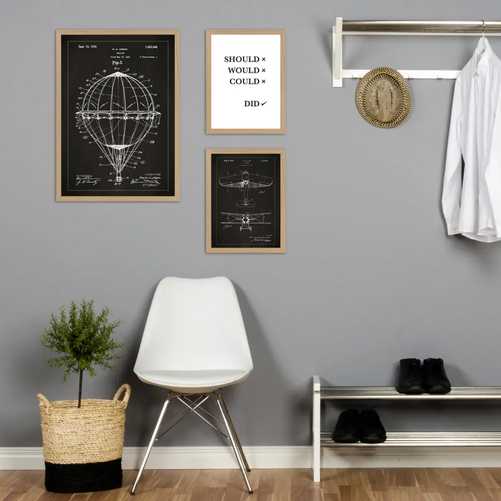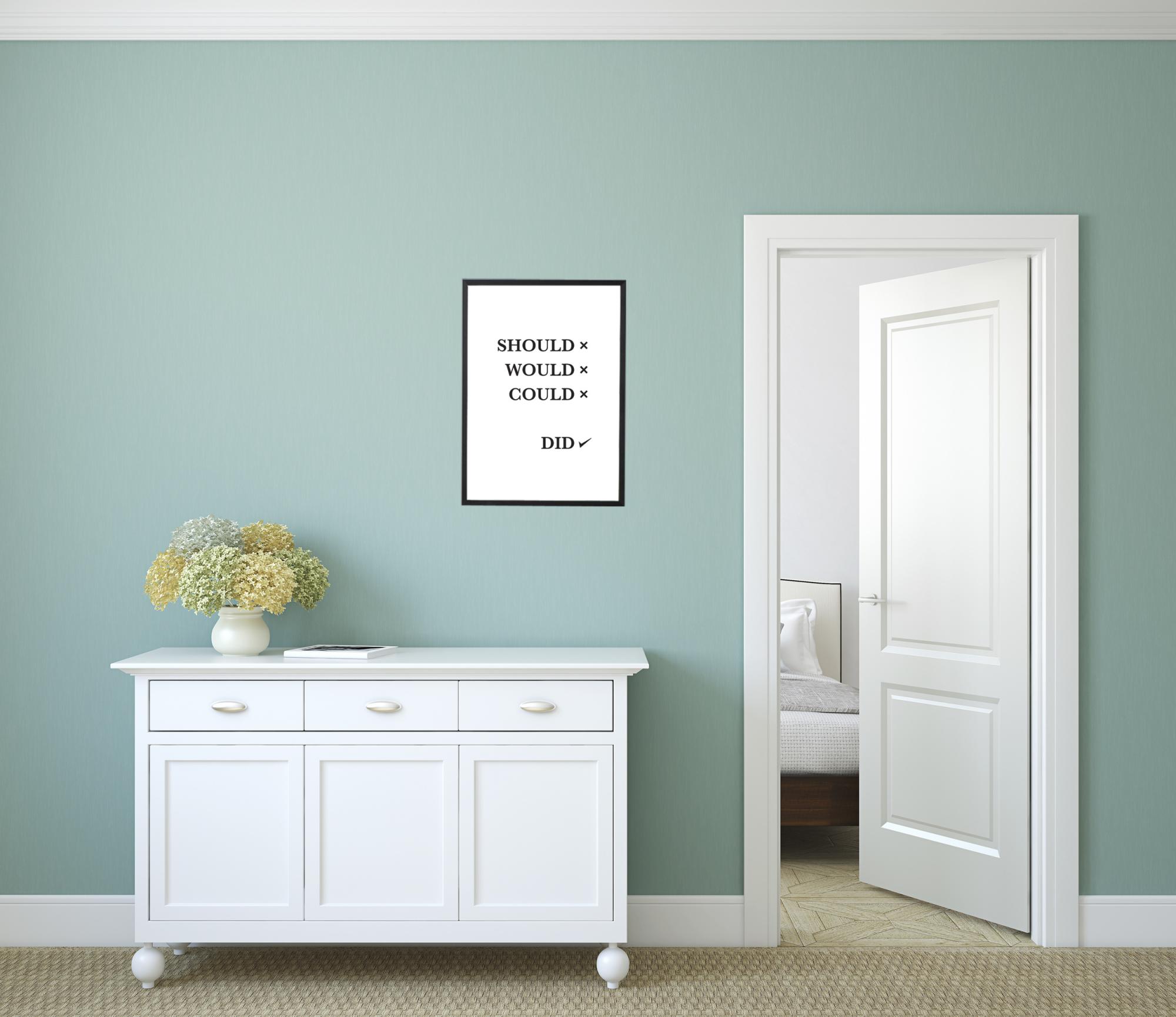 Varför krångla till alla briljanta idéer som du får med hämmande tankar? Det är väl bara att göra det! Med denna poster på väggen finns det inte längre några ursäkter. Affischen är vit med ett svart tryck bestående av en lista med texten "Should Would Could", där varje ord har ett kryss bredvid. Längst ner finns ordet "Did" med en bock bredvid. Den svartvita designen gör sig mycket bra med en färgstark ram. Eftersom postern finns i flera olika storlekar hittar du en såväl för skrivbordet som för väggen.