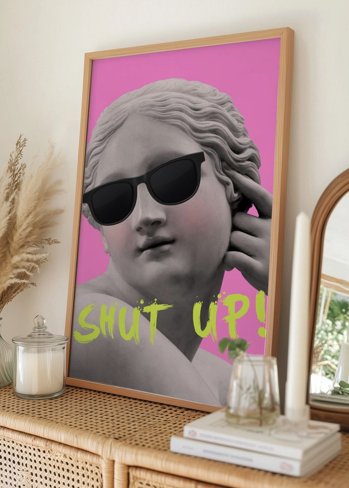 Denna moderna poster kombinerar klassisk konst med en rebellisk twist. Motivet visar en skulptur med en cool attityd, iklädd svarta solglasögon och med texten "SHUT UP!" i en livfull gul färg. Denna unika print är perfekt för dem som vill ge sitt hem en trendig och humoristisk touch. Perfekt för ungdomsrummet eller för den som älskar att bryta normen.