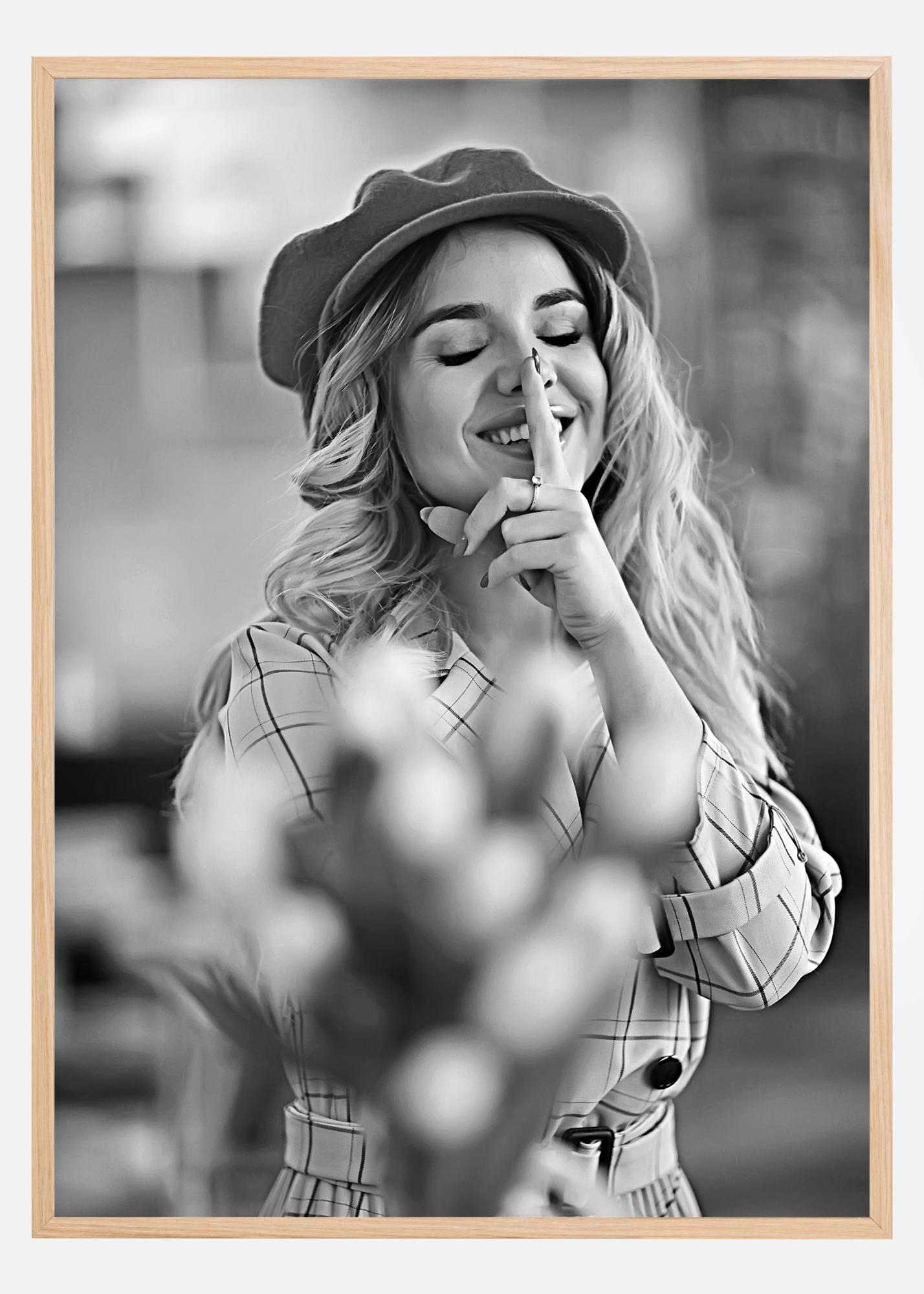 En fräck porträttposter med en flicka med fingret mot läpparna. Det blonda håret faller ner under hennes hatt och den här söta flickan flinar brett när hon höjer ett lugnande finger till läpparna. Det här svartvita verket kommer att förbättra ditt humör varje dag när du vaknar och ser det.