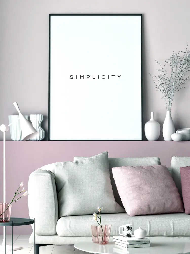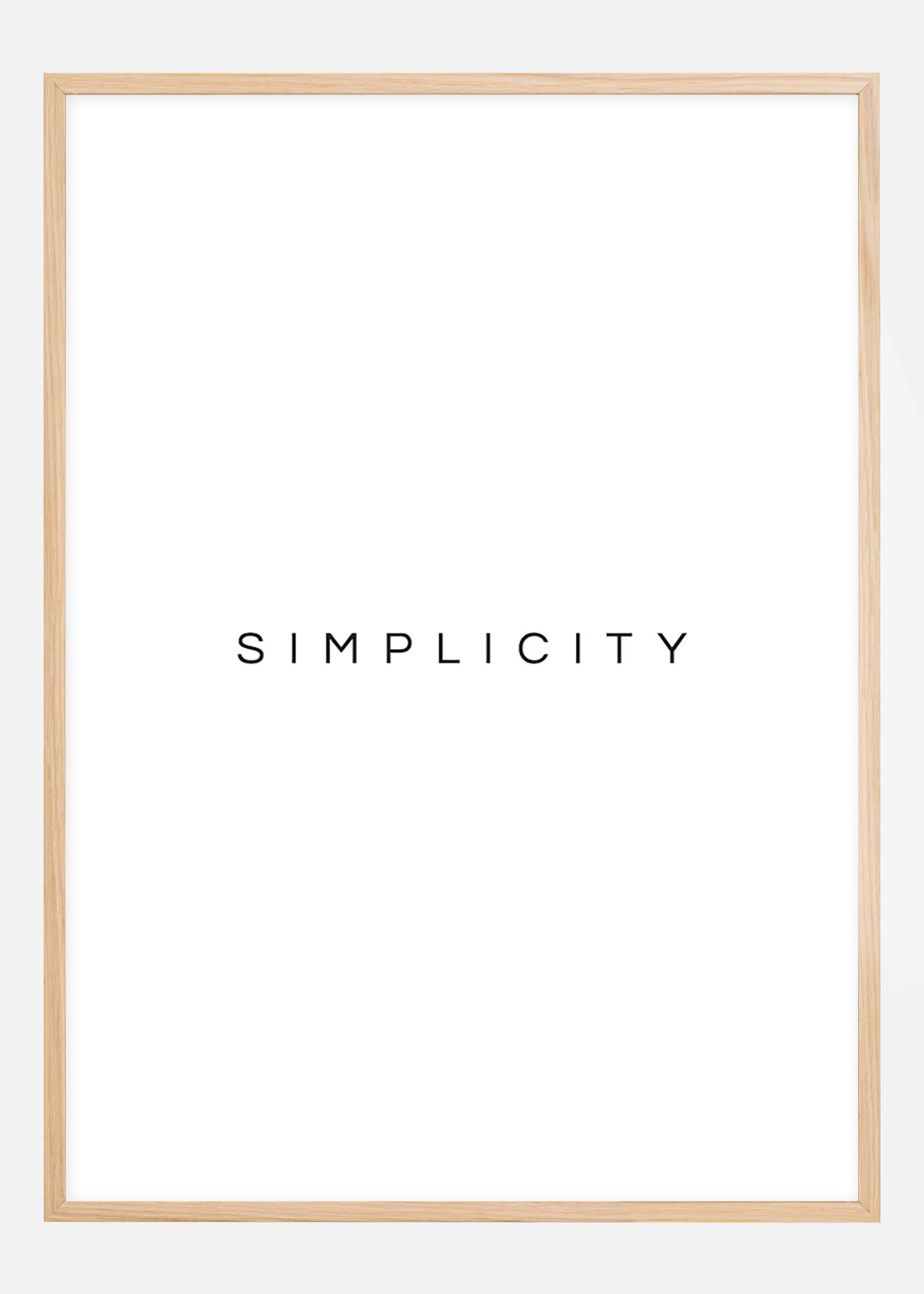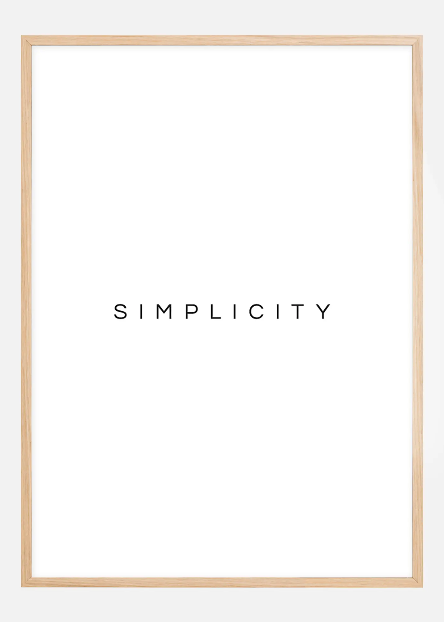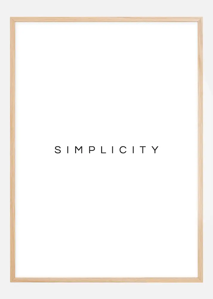 En minimalistisk textposter med ordet Simplicity skrivet i svart i mitten av den vita bilden. Inga tjusiga typsnitt här, som ordet antyder är allting här enkelt. Behåll den minimalistiska stämningen och häng den här på en vanlig vägg för att följa råden i den här bilden.