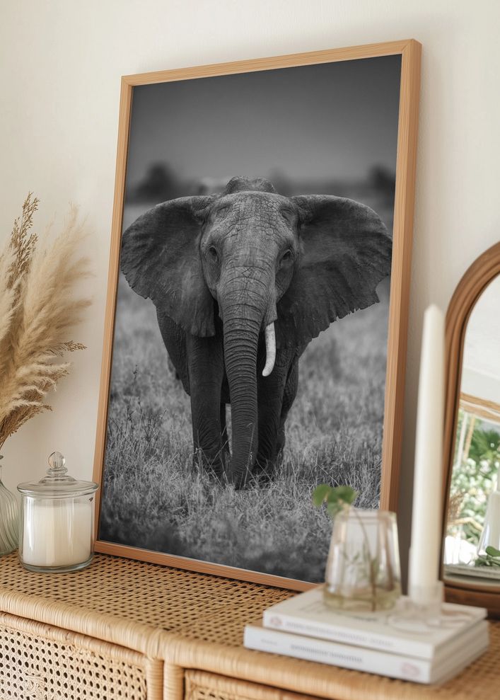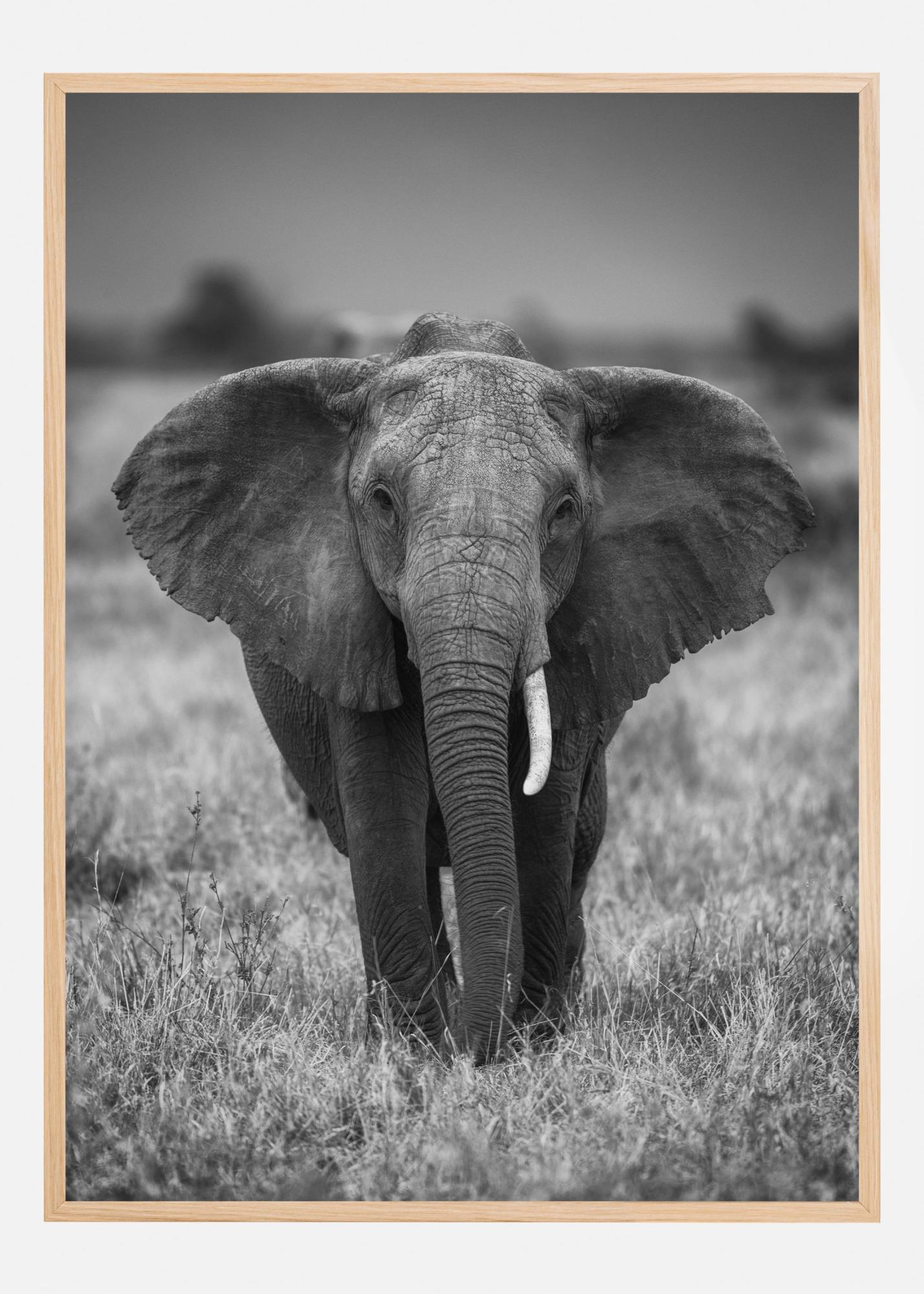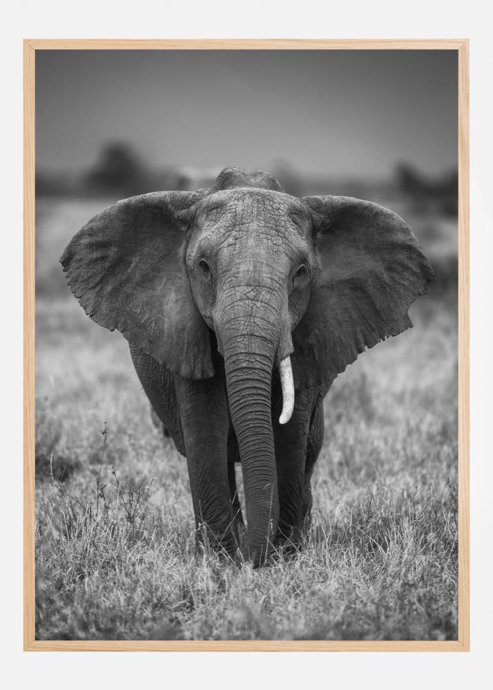 Postern är fotograferad i gråskala, vilket framhäver kontraster och texturer i elefantens skinn och det torra gräset under fötterna. Den monokroma färgsättningen gör den lätt att matcha i både moderna och klassiska inredningar, och passar perfekt för dig som söker en stilren affisch med starkt djurmotiv.