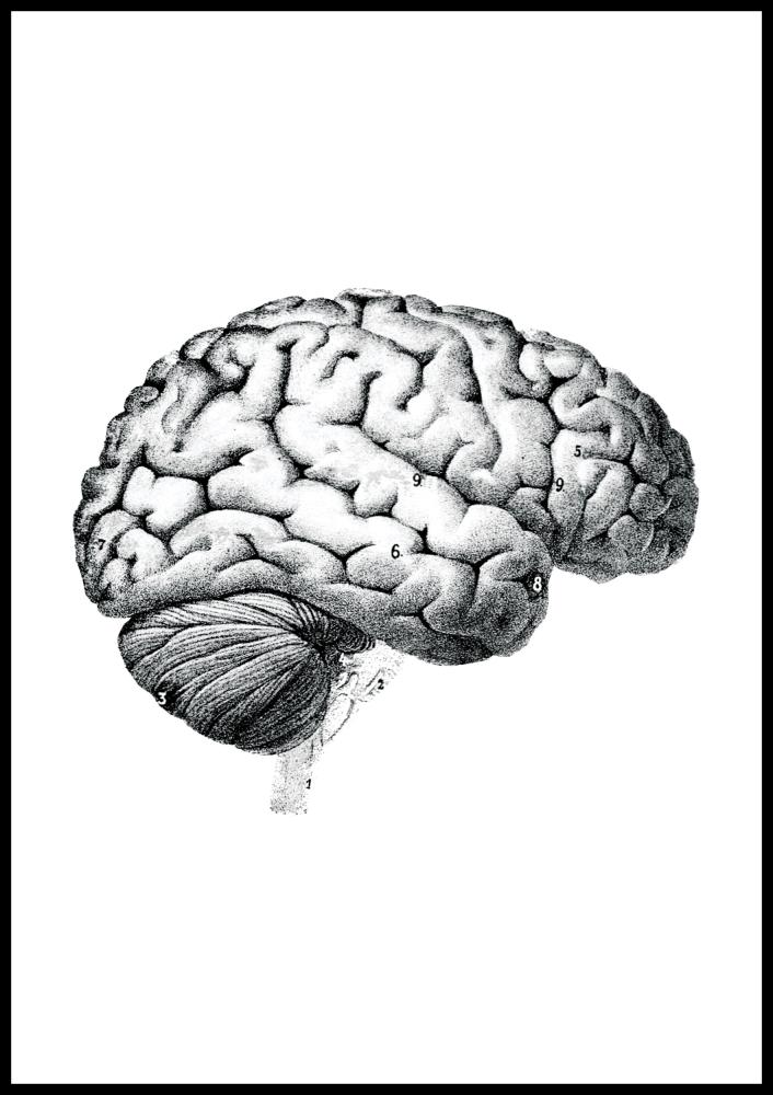 Gör din interiör mer spännande med olika skolplanscher med vintagekänsla! Den här affischen är en kopia av en gammal ritning föreställande en hjärna med nummer vid de olika delarna. Ritningen är hämtad ur en lärobok om anatomi. Eftersom den är svartvit är den enkel att matcha med en ram som går bra ihop med övrig inredning. Affischen finns i en rad olika storlekar så du hittar enkelt en som passar just ditt hem.