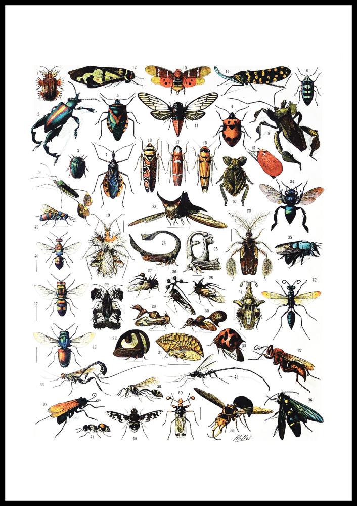 Tänk vad många fascinerande insekter det finns! Denna vackra skolplansch tillför en härlig vintagekänsla till ditt hem. Motivet är hämtat från en gammal bok om entomologi och det föreställer en stor grupp färgglada insekter. Kombinera gärna affischen med andra motiv hämtade från naturen. Eftersom den finns i flera olika format hittar du enkelt en som passar i just ditt hem.