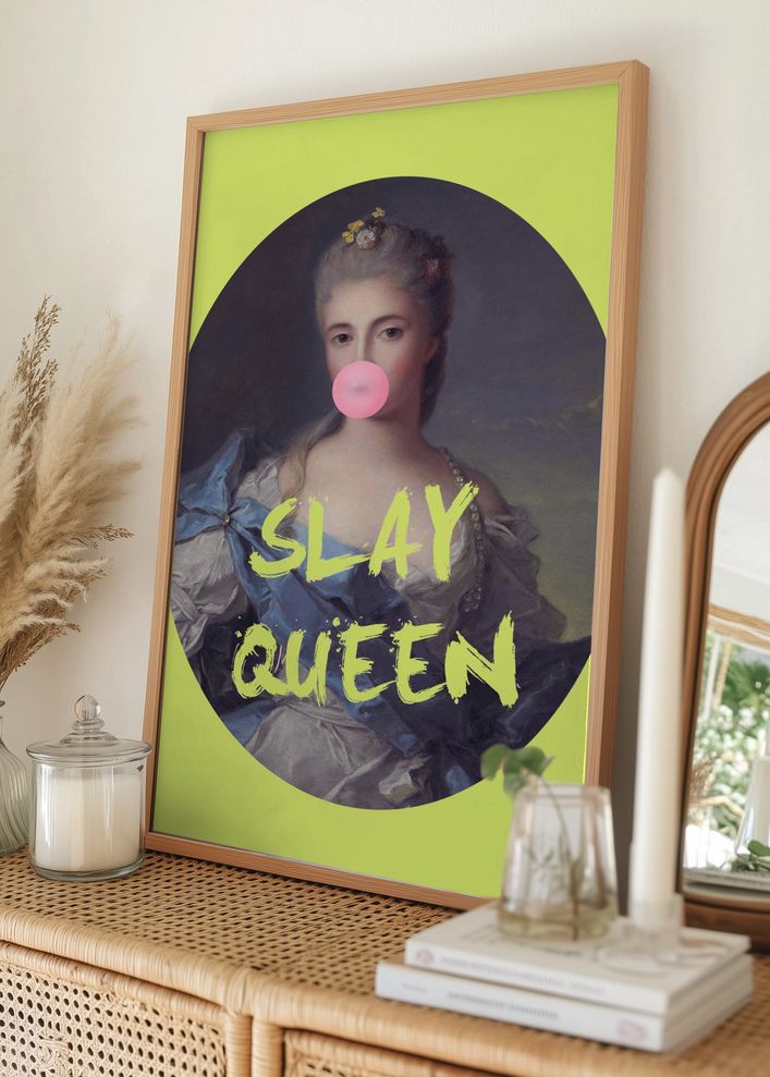 Denna trendiga affisch kombinerar klassiskt konstnärskap med modern humor. En elegant kvinna från en äldre epok, klädd i en vacker blå klänning, får en lekfull twist med en rosa tuggummibubbla i munnen. Texten "SLAY QUEEN" i djärva, gula bokstäver ger motivet en självsäker och modern attityd.