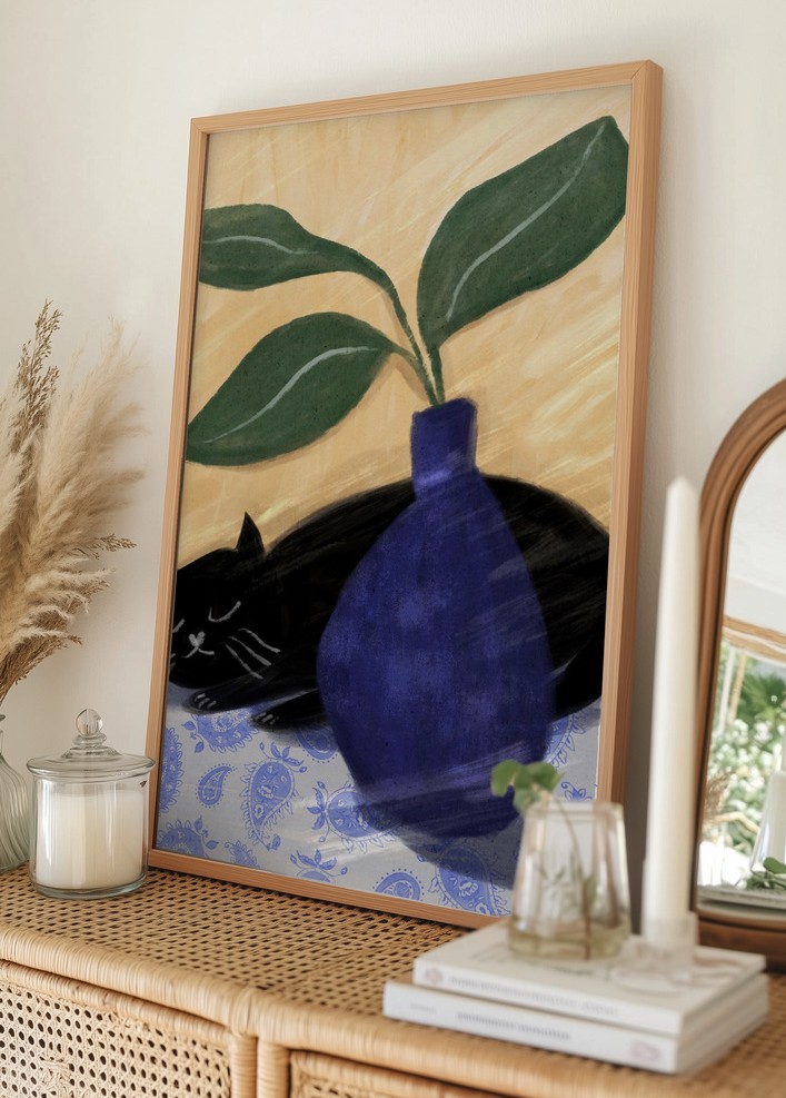 Denna poster fångar en lugn och harmonisk scen med en sovande katt bredvid en djupblå vas med gröna blad. Bakgrunden har en varm gul färgton som ger en mjuk kontrast till kattens och vasens mörkare nyanser. Den avslappnade katten bidrar med en känsla av ro, vilket gör motivet till en perfekt dekoration för att skapa en trivsam atmosfär i vilket rum som helst.