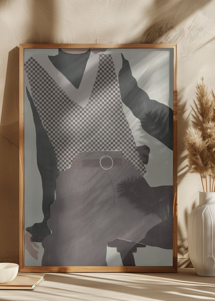 Utforska vår konstnärliga affisch som avbildar en abstrakt figur klädd i en trendig outfit. Denna unika konstverk kombinerar modern stil med en distinkt känsla av mode. Bilden framhäver en person i en överdimensionerad, rutig tröja med en markant V-ringning och en mörkt gråbrun underdel som skapar en stark visuell effekt. De mjuka, jordnära tonerna ger en varm och välkomnande känsla, vilket gör denna print till en perfekt inredningsdetalj för ett samtida hem eller kontor.