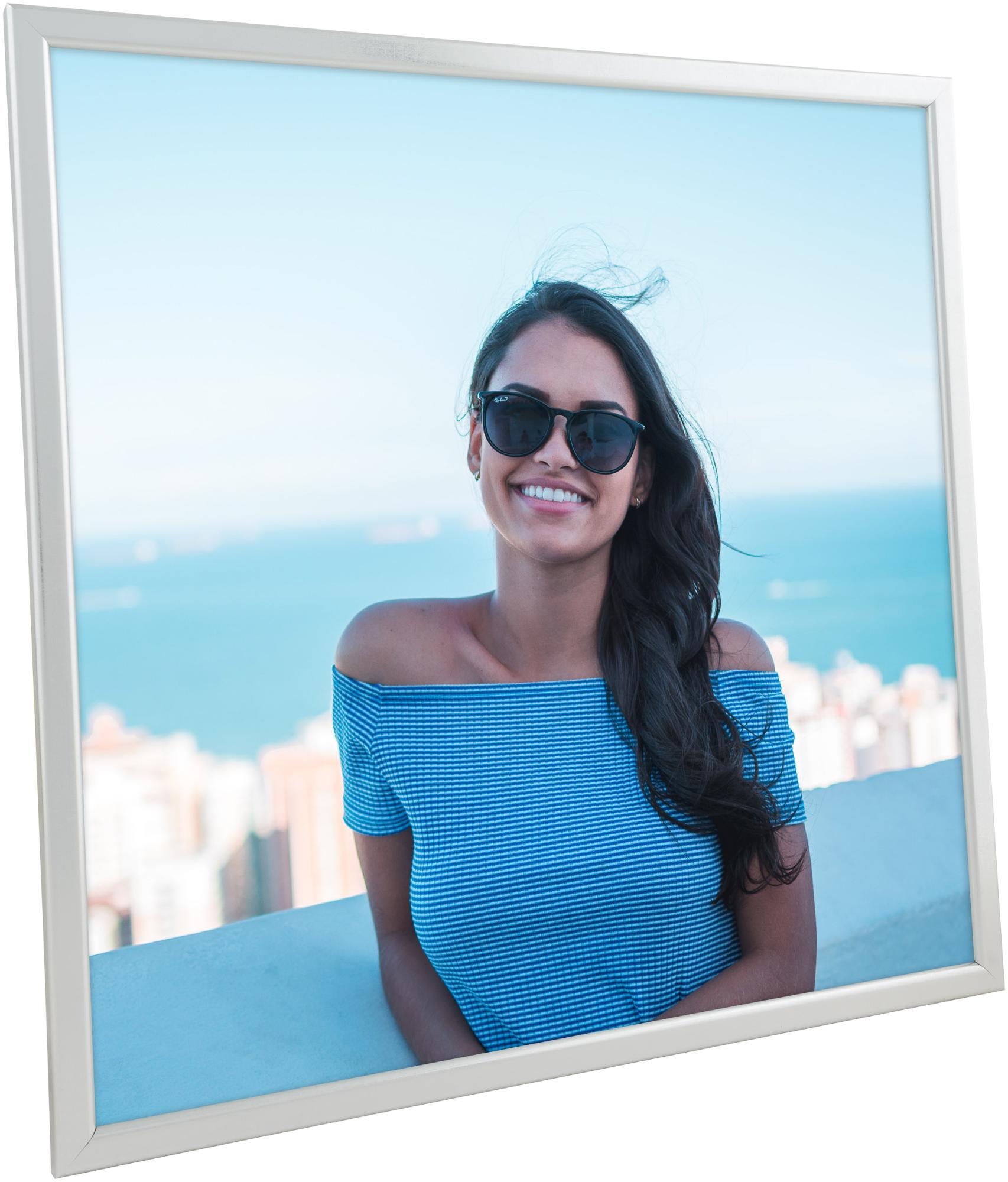 Placera ditt foto, din målning eller din poster i denna stilfulla ram! Ramen är tillverkad av silvermålat trä och har ett antireflexglas. Bakstycket och stödbenet är klädda i svart skinnimitation som ger en extra lyxig känsla.