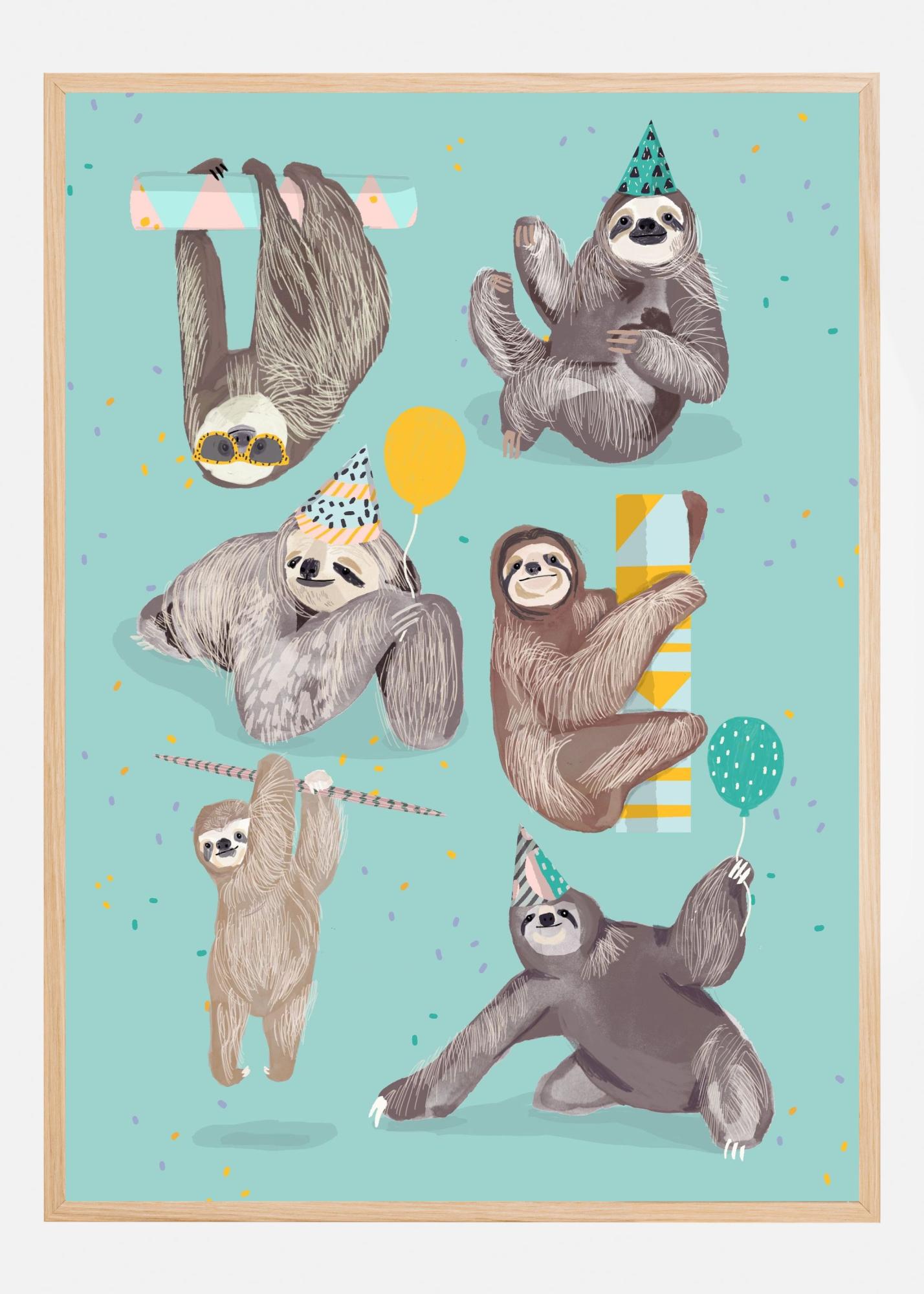 Den bakgrund som omger dessa lugna varelser har en lugnande turkos ton, vilket skapar en harmonisk kontrast mot de mjuka grå och bruna nyanserna av sengångarnas päls. Accenter av gult, grönt, och rosa från de geometriska formerna och partyhattarna adderar liv och varmhet till detta unika print. Omringade av en elegant ekrutig kant, förblir fokus på motivets detaljrika illustration och de genomtänkta färgsättningarna, vilket gör detta till en uppskattad affisch för alla åldrar och inredningsstilar.