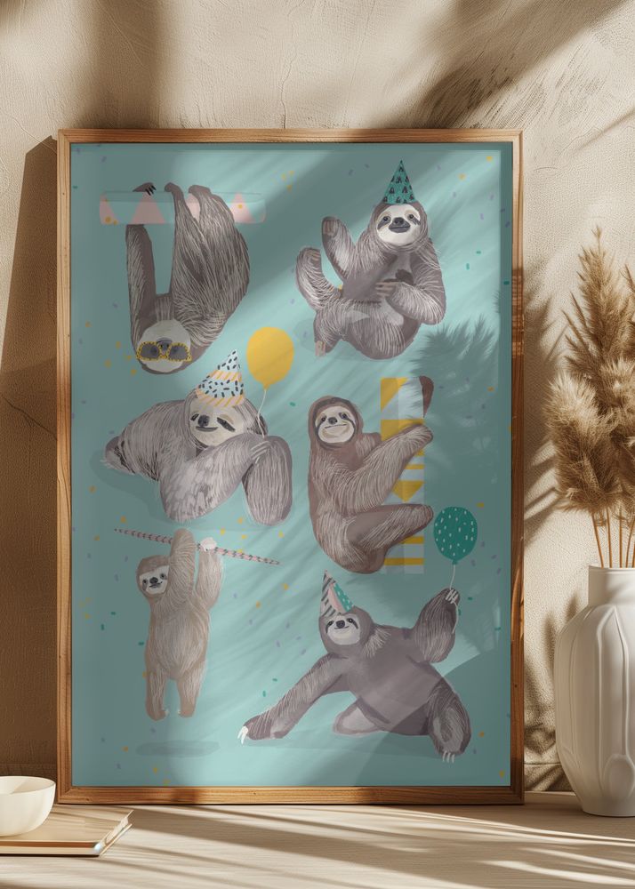 Den bakgrund som omger dessa lugna varelser har en lugnande turkos ton, vilket skapar en harmonisk kontrast mot de mjuka grå och bruna nyanserna av sengångarnas päls. Accenter av gult, grönt, och rosa från de geometriska formerna och partyhattarna adderar liv och varmhet till detta unika print. Omringade av en elegant ekrutig kant, förblir fokus på motivets detaljrika illustration och de genomtänkta färgsättningarna, vilket gör detta till en uppskattad affisch för alla åldrar och inredningsstilar.