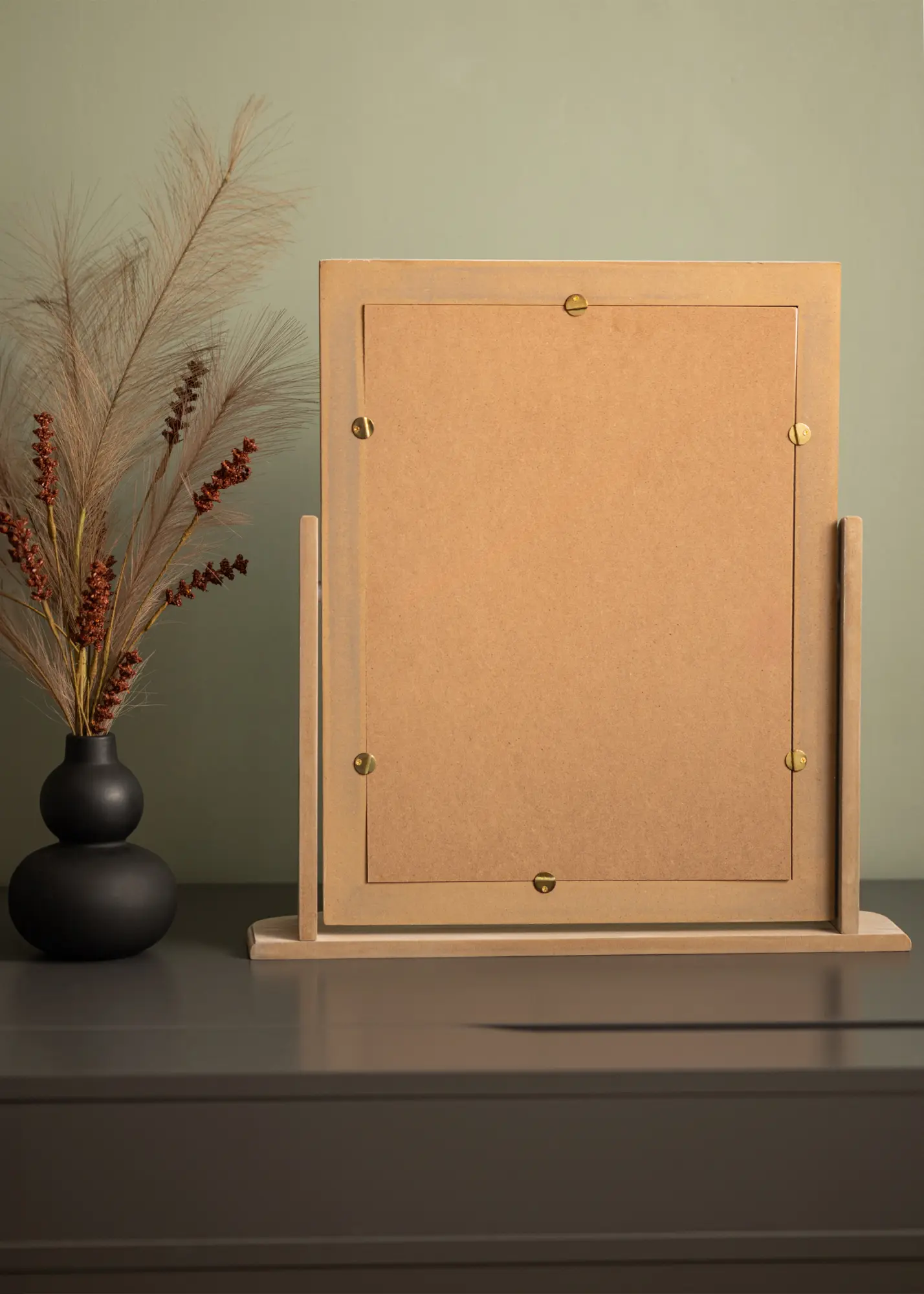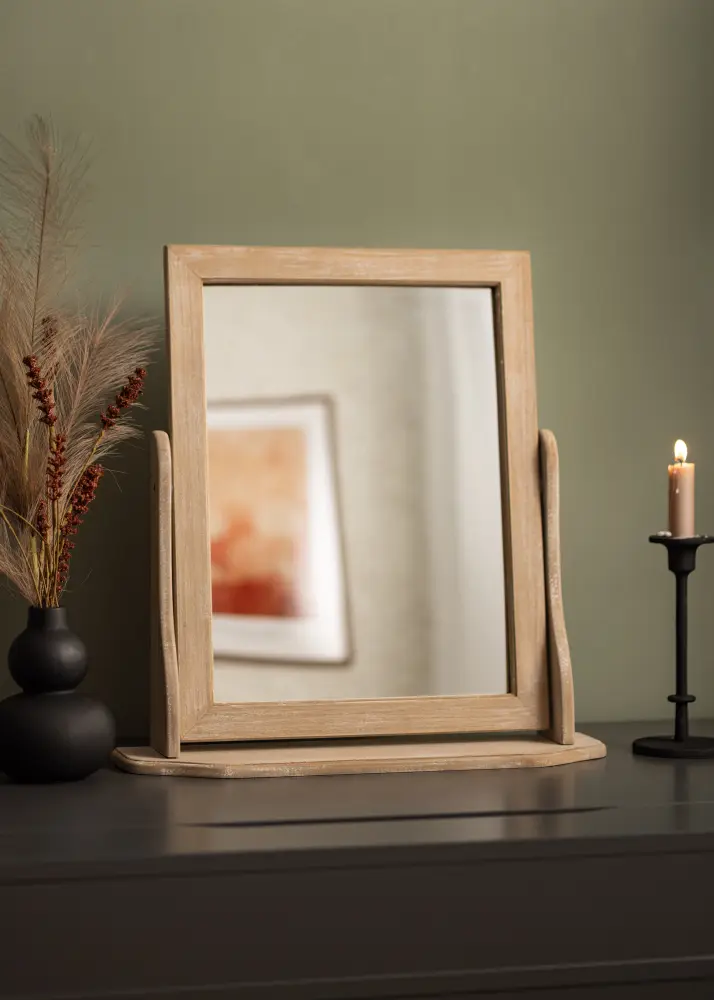 Spegeln står stadigt på en robust fot, designad för att placeras på ett sminkbord eller en byrå. Den rektangulära formen är klassisk och tillför en mjuk touch till rummet, samtidigt som den klara reflektionen säkerställer att du ser dig själv i bästa möjliga ljus.