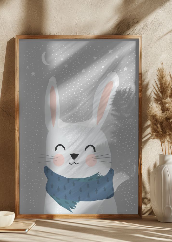 Denna charmiga poster föreställer en bedårande vit kanin som blickar framåt med ett vänligt leende. Kaninens mjuka vita päls står i kontrast till dess rosa kinder och öronens inre yta, vilket ger en känsla av värme och vänlighet i motivet. Printen är inramad av en nattfylld himmel full av små stjärnor som skapar en drömlik atmosfär. En fin detalj är den mörkgröna stickade halsduken som kaninen bär, vilket tillför en känsla av mysighet och stil.