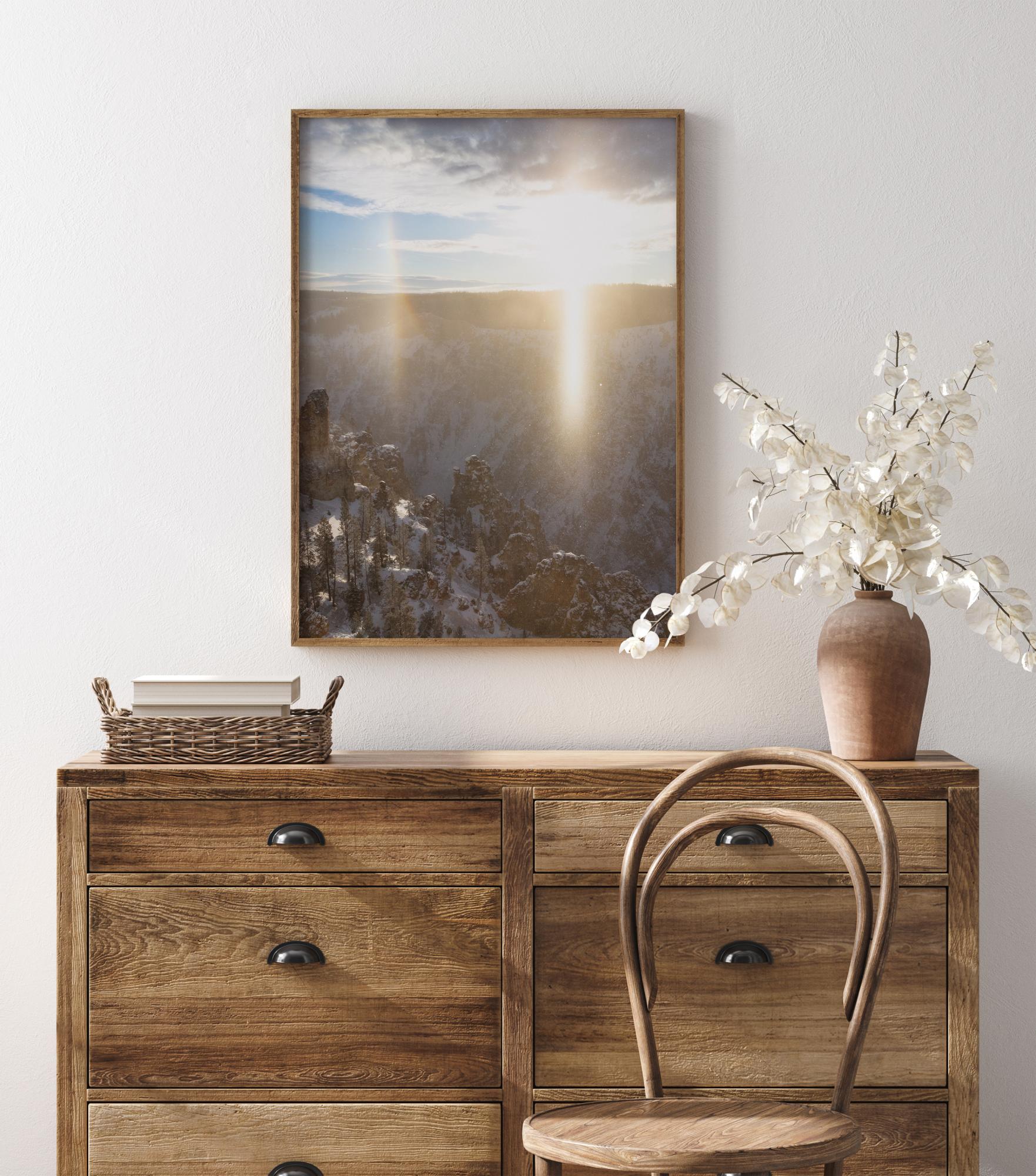En naturskön poster med snöiga bergstoppar. Solen står högt på himlen och lyser starkt över bergen för att skapa ett starkt sken med överstrålningar över klipporna. Molnen rullar över himlen när solen träffar de snötäckta topparna och ger en dramatisk, men ändå vinterlugn bild.