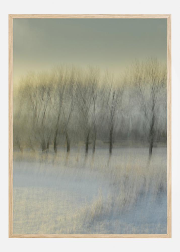 En fantastisk poster i motion blur-stil med träd på en vinterbakgrund. Vit snö täcker allt i den här mjuka, ofokuserade bilden. Träden är suddiga, bara höga svarta stammar syns och ett mjukt gult band flyter över trädtopparna. Magin formligen ligger i luften.