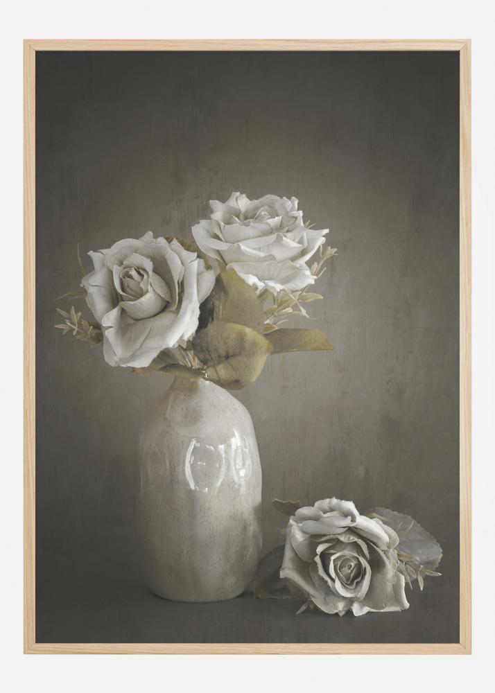 En enkel poster med målade rosor i en vas. Två vita rosor står i en vit vas, en tredje ros är placerad på hyllan bredvid. Varje ros lyser med ett osynligt ljus mot en mjuk, mörkgrå bakgrund vilket skapar en elegant men ändå teatralisk bild.