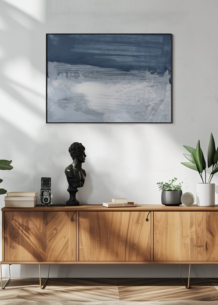 Färgpaletten i denna print består av nyanser av blått och vitt, vilket ger en lugn och fridfull atmosfär. Den djupblå tonen smälter vackert ihop med de ljusare vita partierna, vilket skapar en balans och kontrast som är både elegant och sofistikerad. Denna affisch är ett utmärkt val för den som vill lyfta sitt utrymme med tidlös konst.