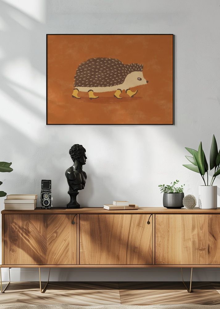Färgerna i denna affisch är en harmonisk blandning av jordnära toner, med en djup orange bakgrund som framhäver igelkottens bruna och vita nyanser. De gula detaljerna i igelkottens stövlar ger en livfull kontrast, vilket säkerligen kommer att dra blickar till detta unika print.
