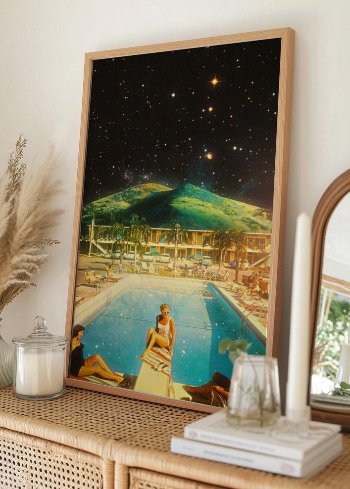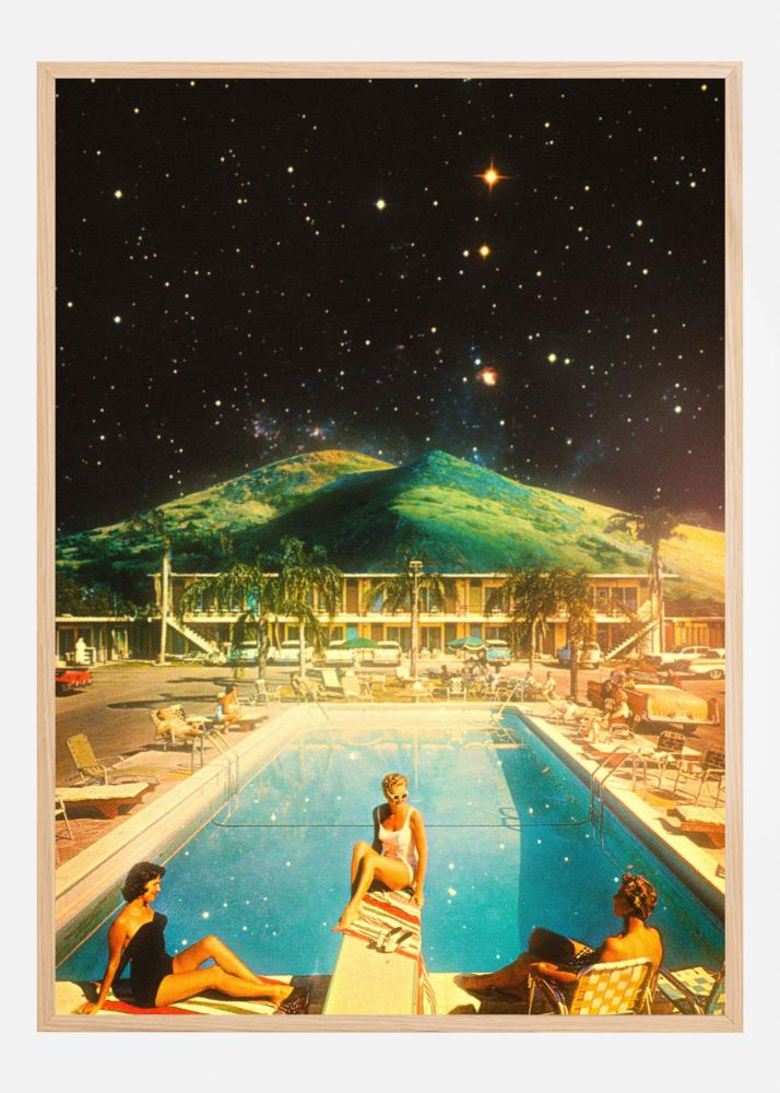 Denna poster fångar en drömlik scen vid en pool i natten, där en stjärnklar himmel möter en frodig bergssiluett i bakgrunden. Tre personer njuter av en avslappnad kväll vid poolen, omgivna av ett landskap som inspirerar till både äventyr och stillhet. Affischen skapar en känsla av ro och mystik, vilket gör den perfekt för att ge ditt hem en unik och modern touch.