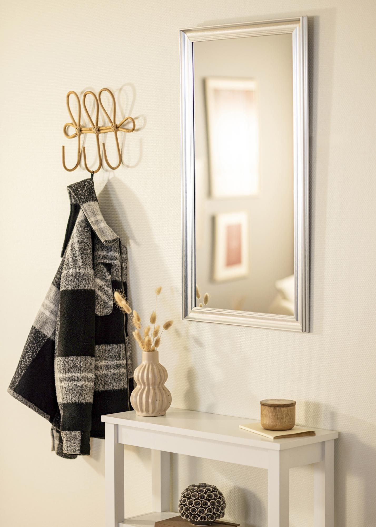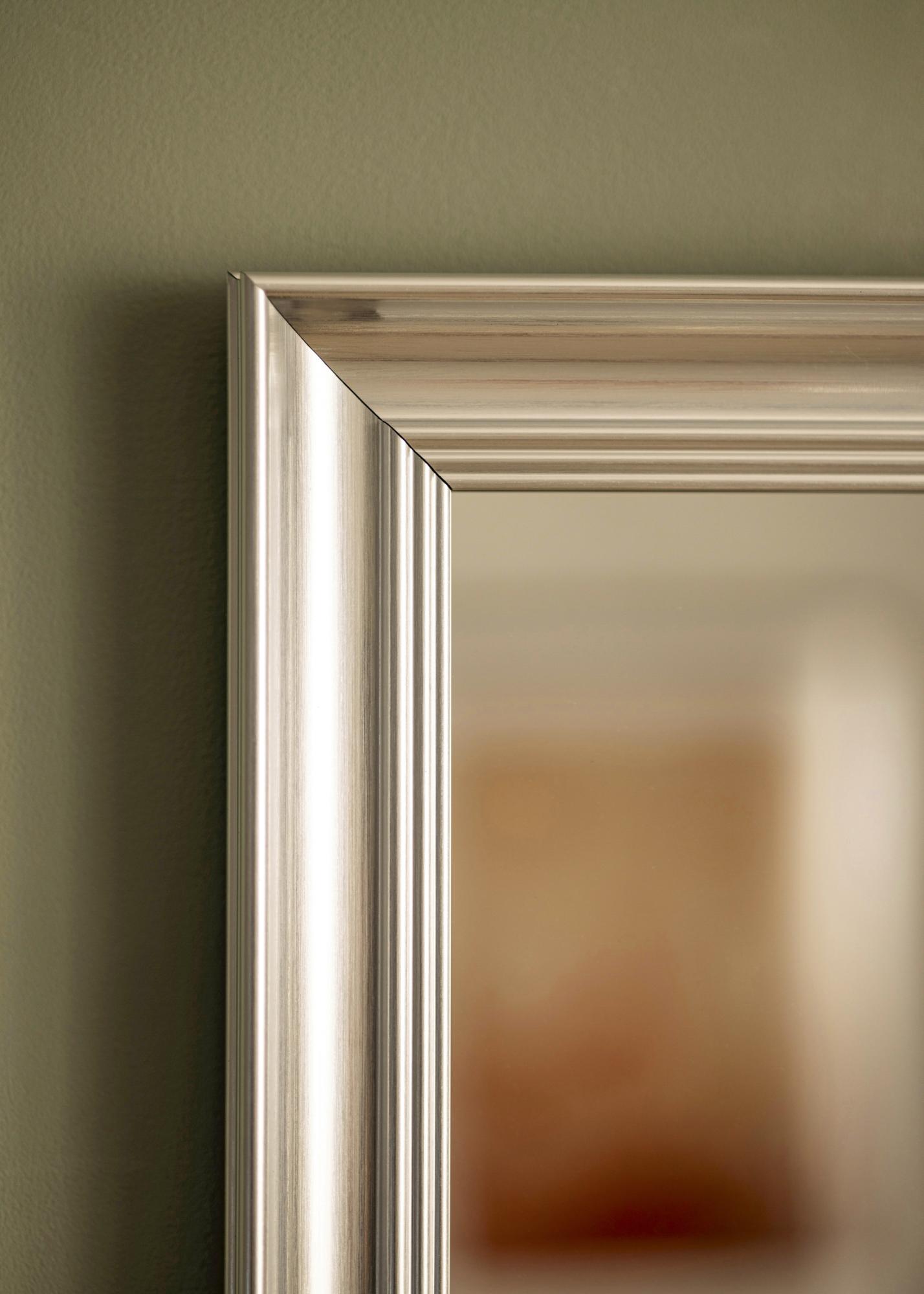 Starta ramväljaren »Alice Silver är en spegel vars ram har en klassisk stram utformning med raka linjer som byggts upp för att lägga fokus på motivet.