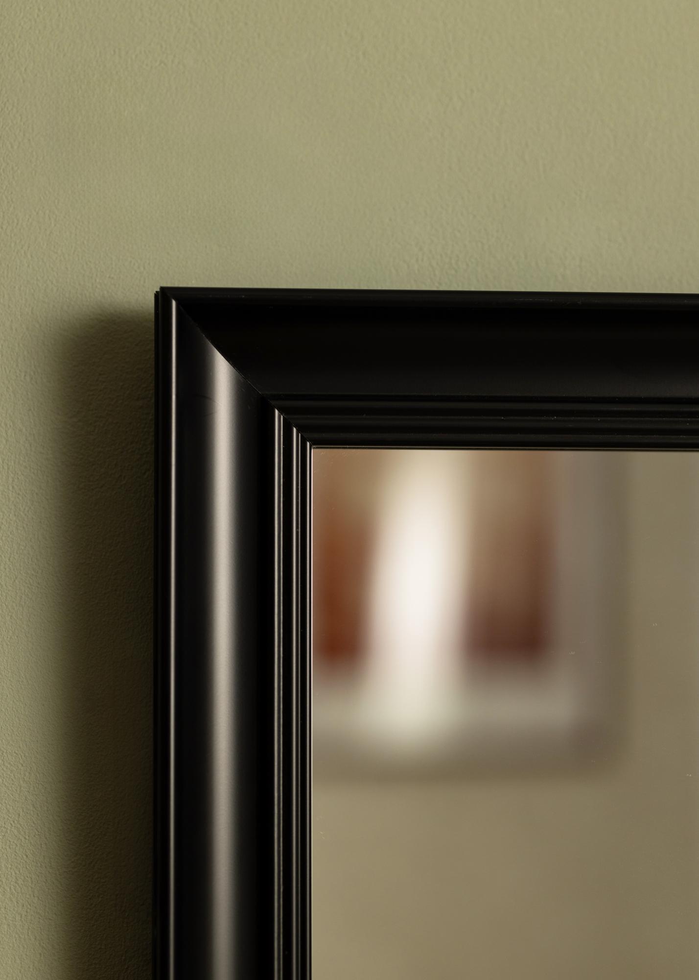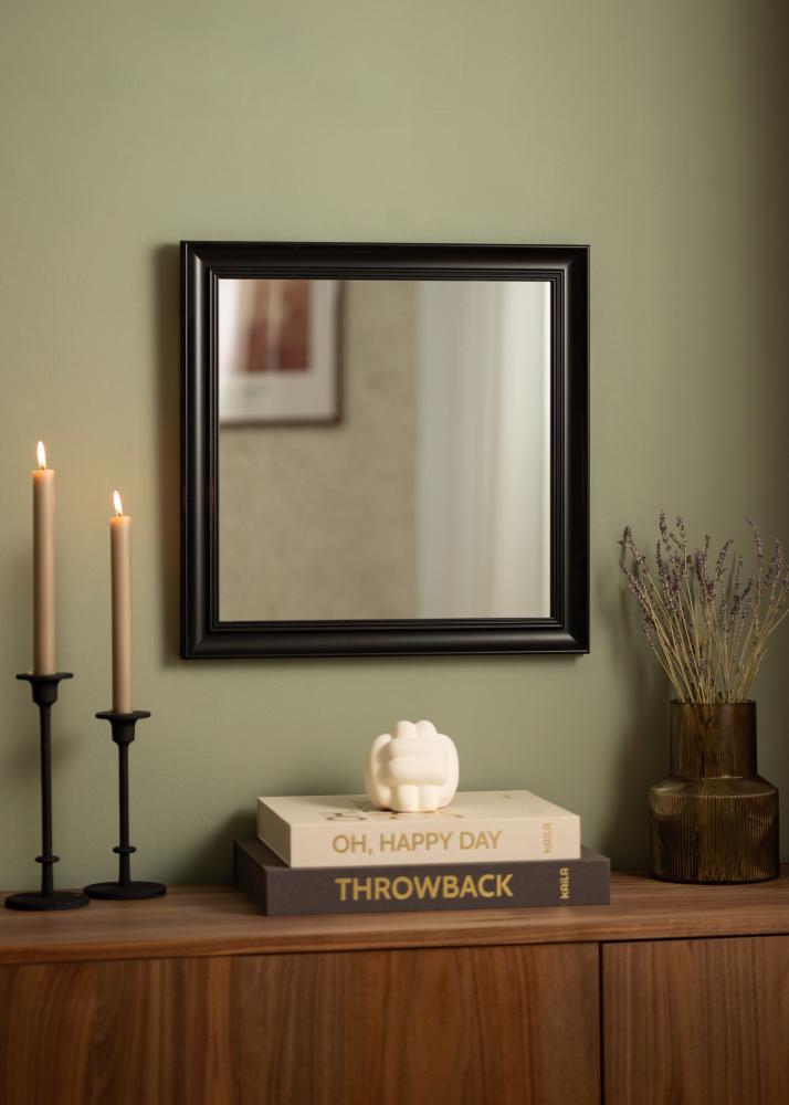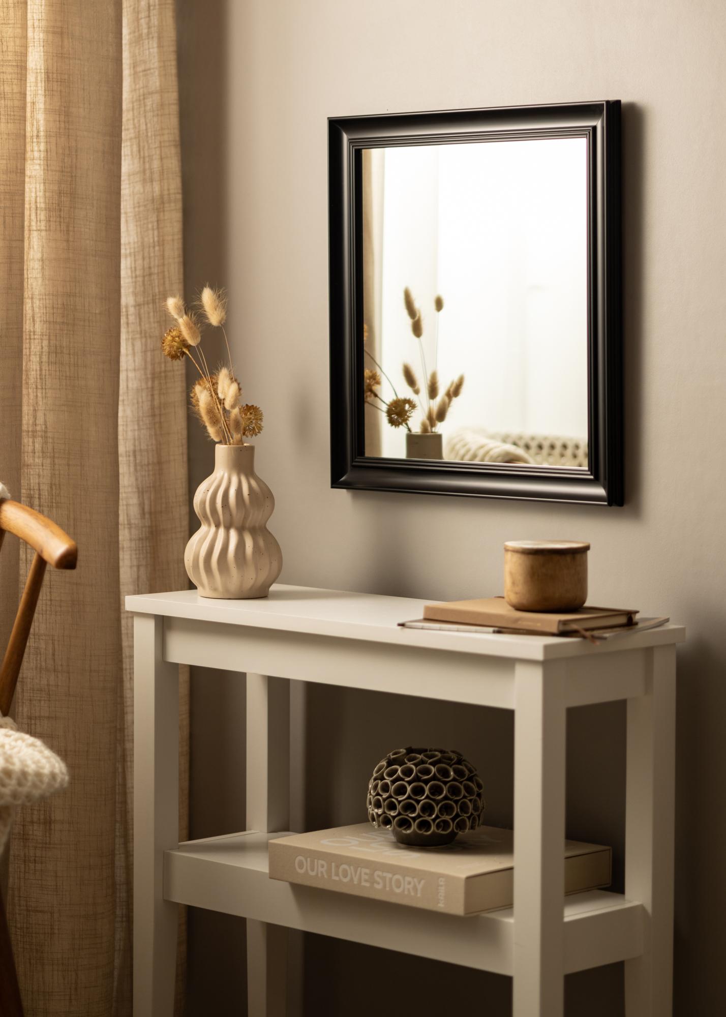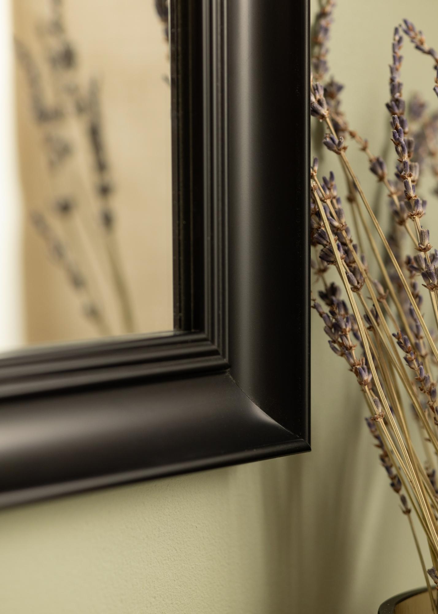 Starta ramväljaren »Alice Svart är en spegel vars ram har en klassisk stram utformning med raka linjer som byggts upp för att lägga fokus på motivet.