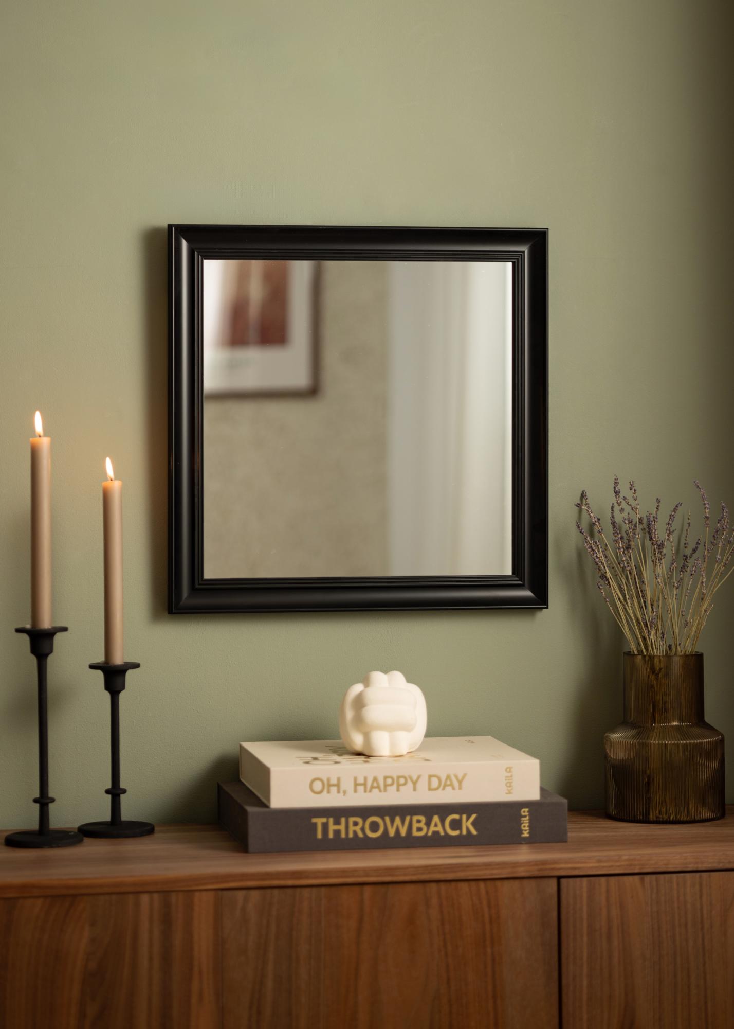 Alice Svart är en spegel vars ram har en klassisk stram utformning med raka linjer som byggts upp för att lägga fokus på motivet.