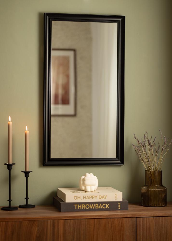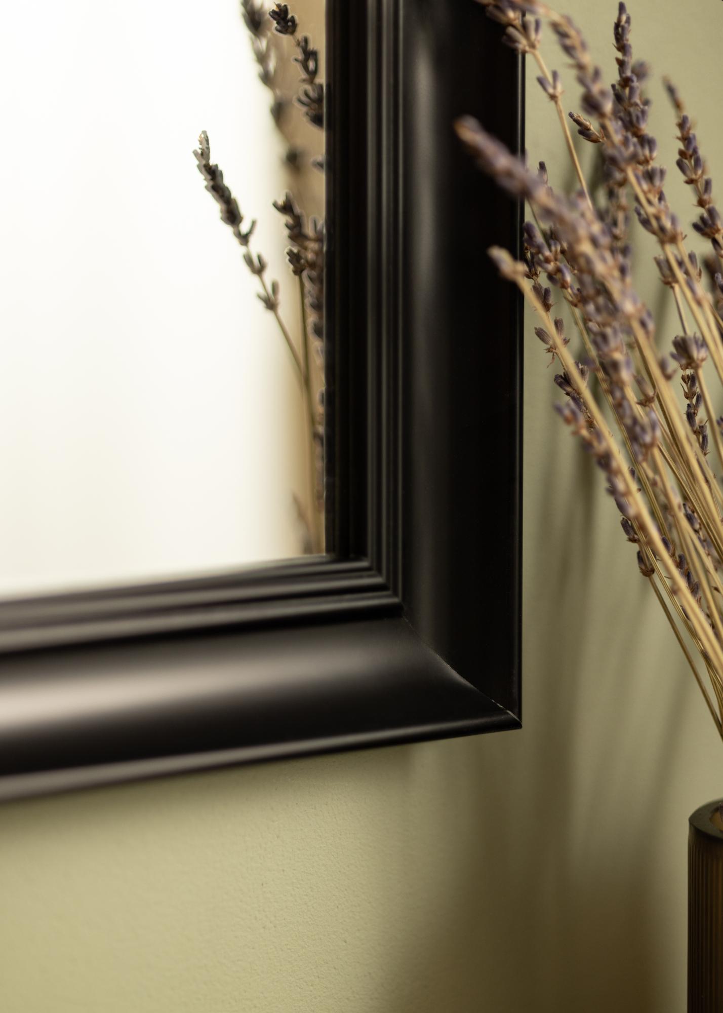 Starta ramväljaren »Alice Svart är en spegel vars ram har en klassisk stram utformning med raka linjer som byggts upp för att lägga fokus på motivet.