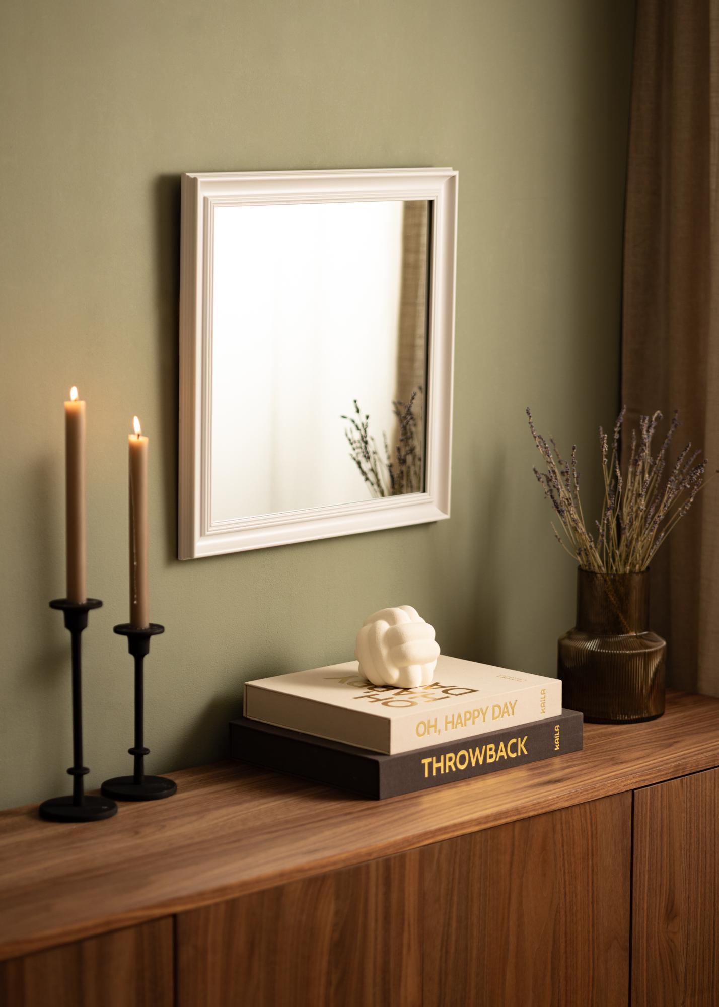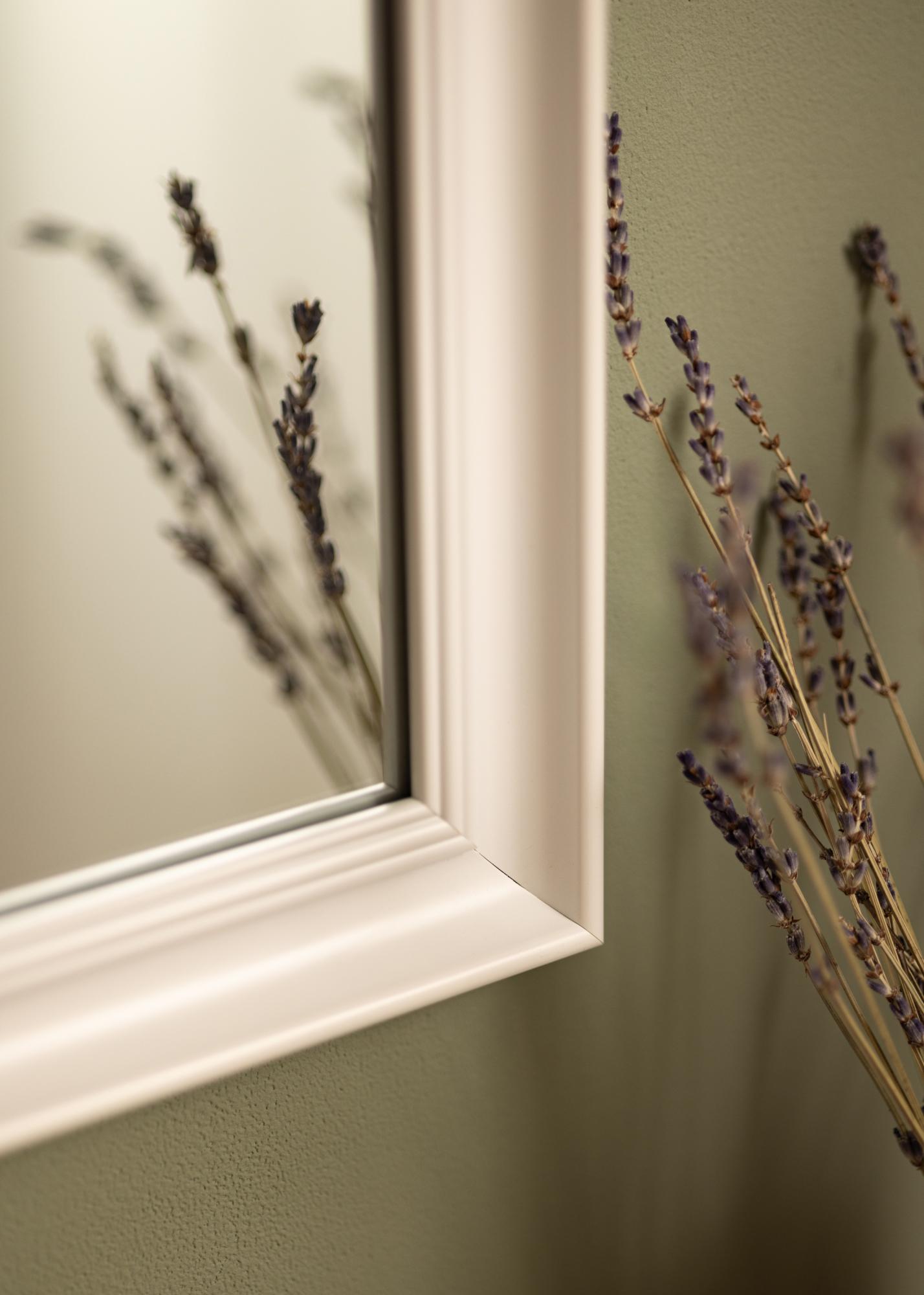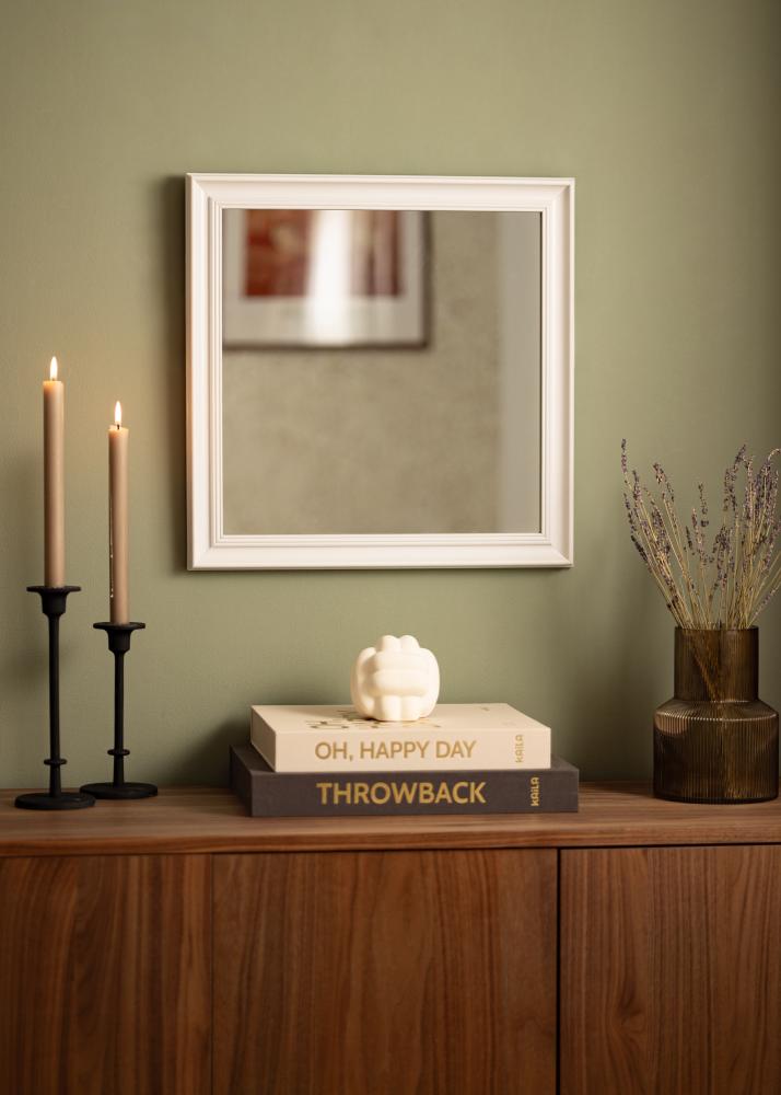 Starta ramväljaren »Alice Vit är en spegel vars ram har en klassisk stram utformning med raka linjer som byggts upp för att lägga fokus på motivet.