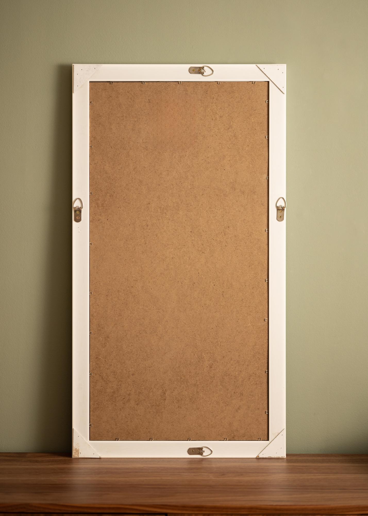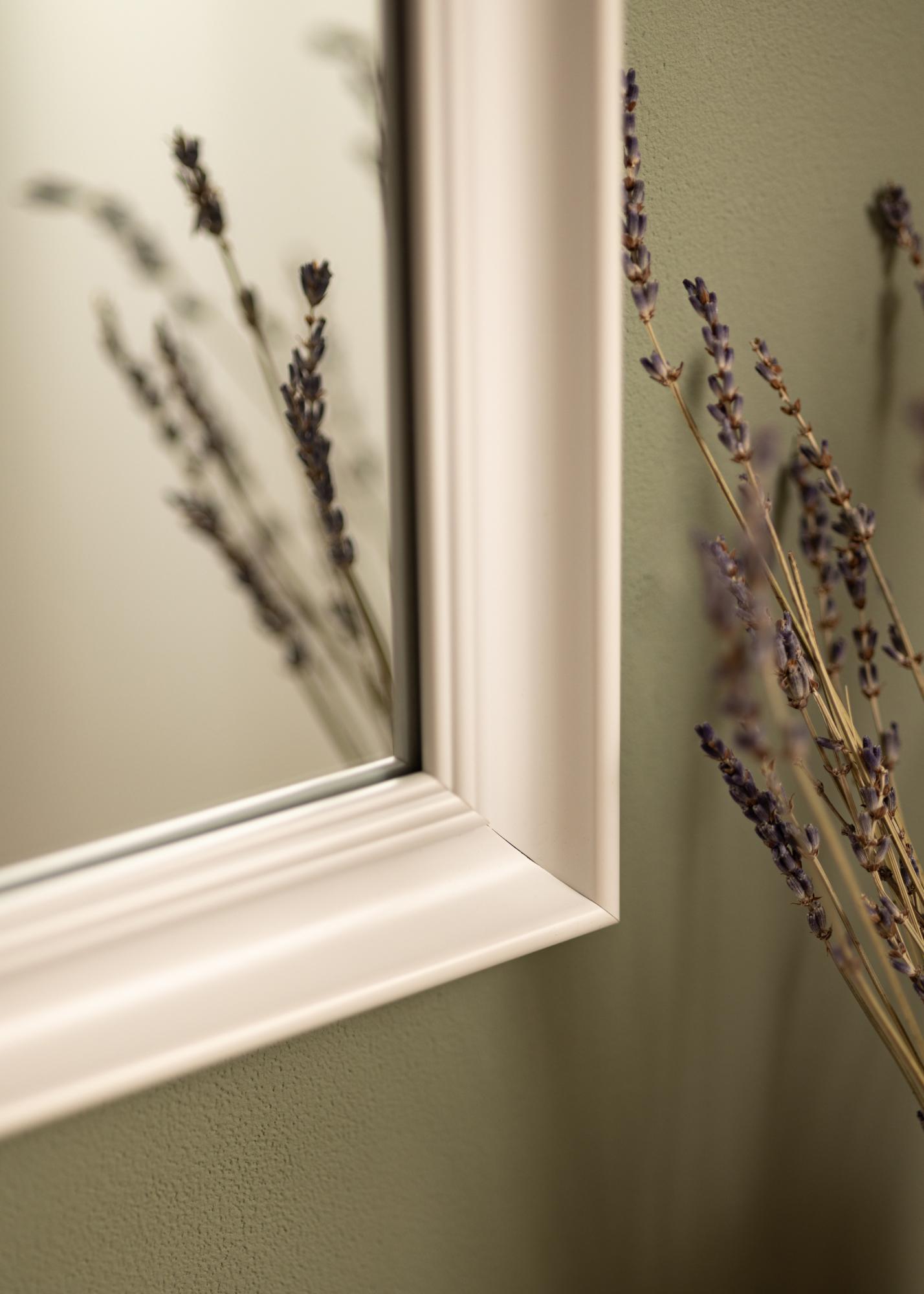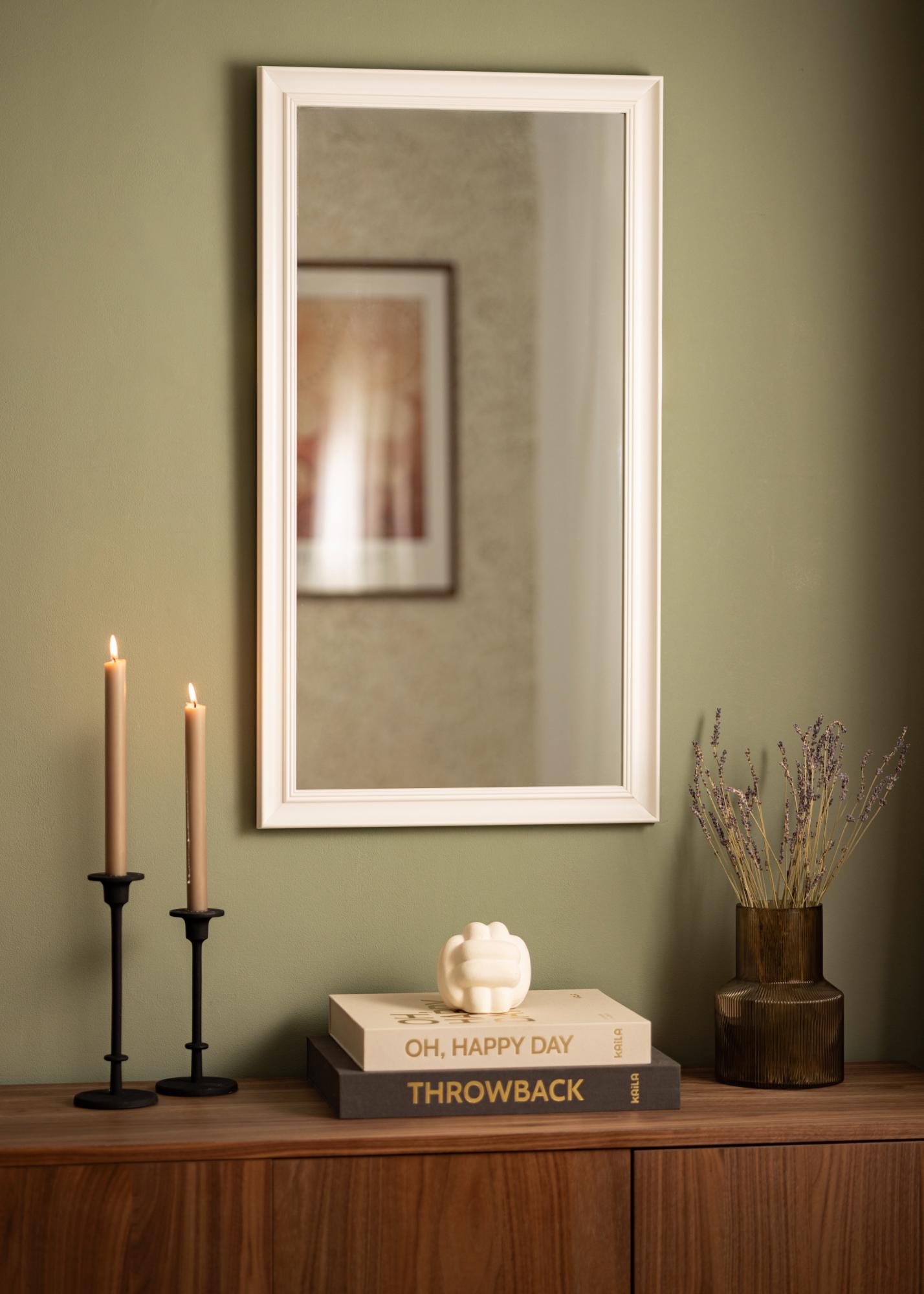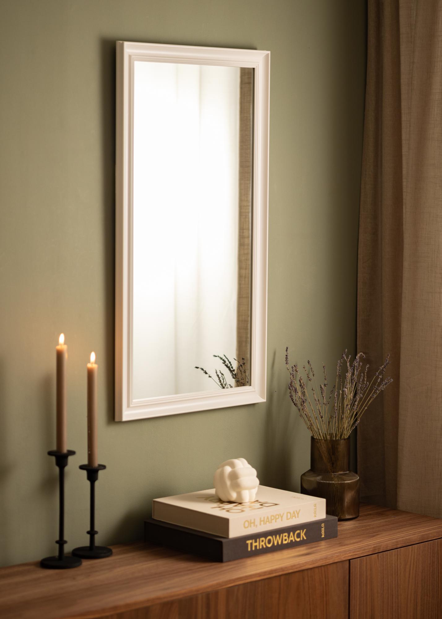 Starta ramväljaren »Alice Vit är en spegel vars ram har en klassisk stram utformning med raka linjer som byggts upp för att lägga fokus på motivet.