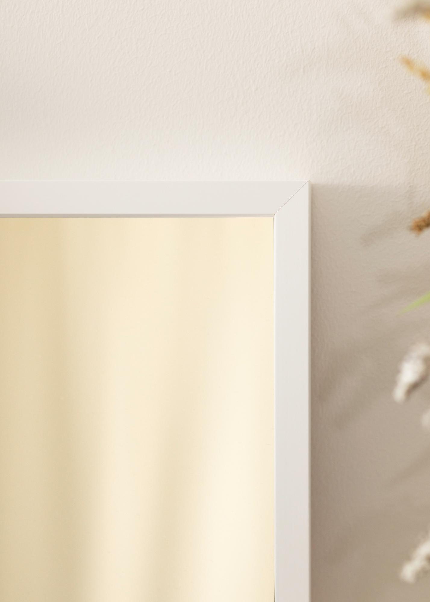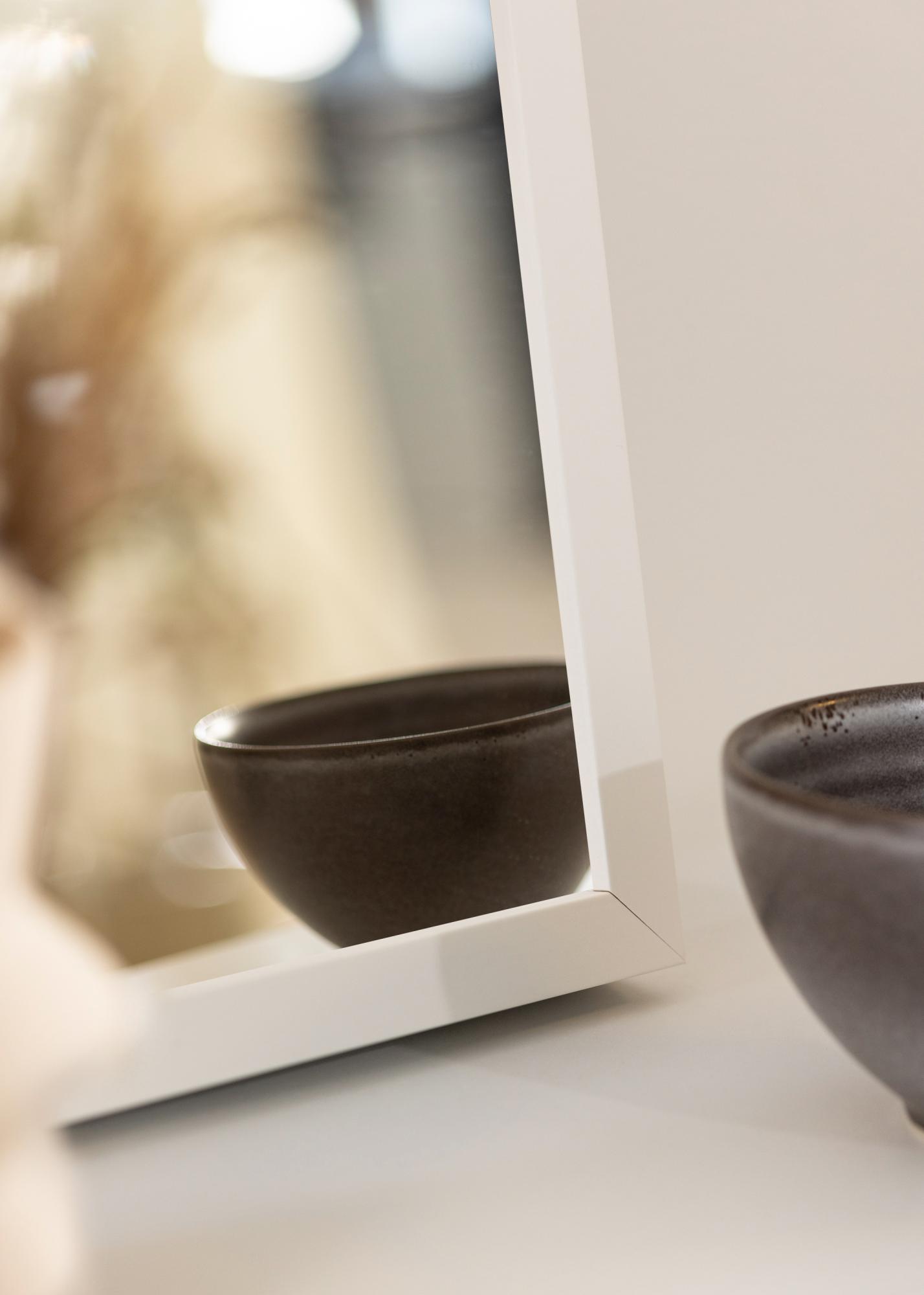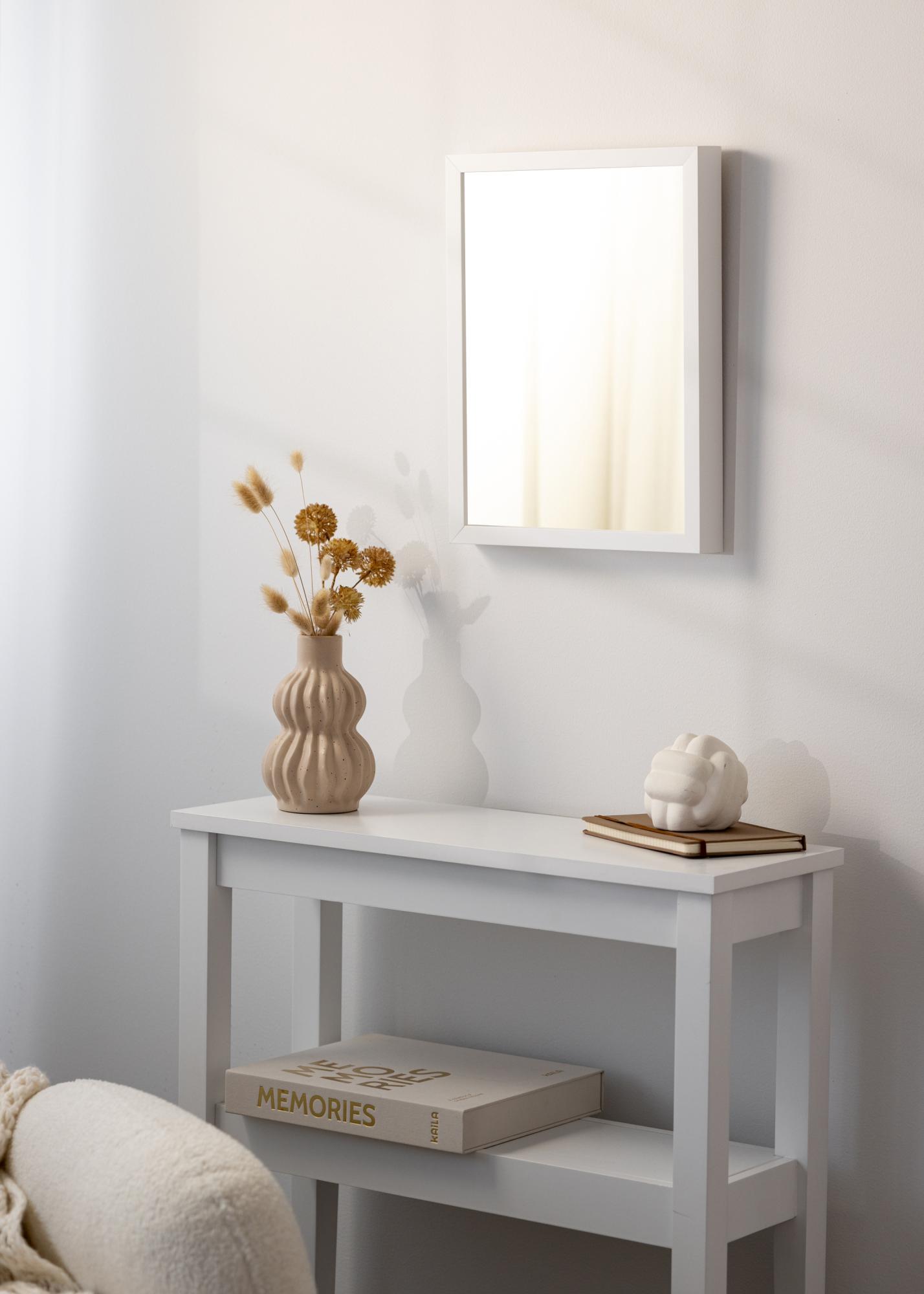 Ramen på Spegel Balder Vit är 20 mm bred och tillverkad av furu, vilket ger en stabil och hållbar konstruktion. Djupet på spegeln är 45 mm, vilket gör att den känns gedigen utan att ta upp för mycket plats. Den smala ramlisten bidrar till en minimalistisk design som låter spegelglaset stå i fokus.