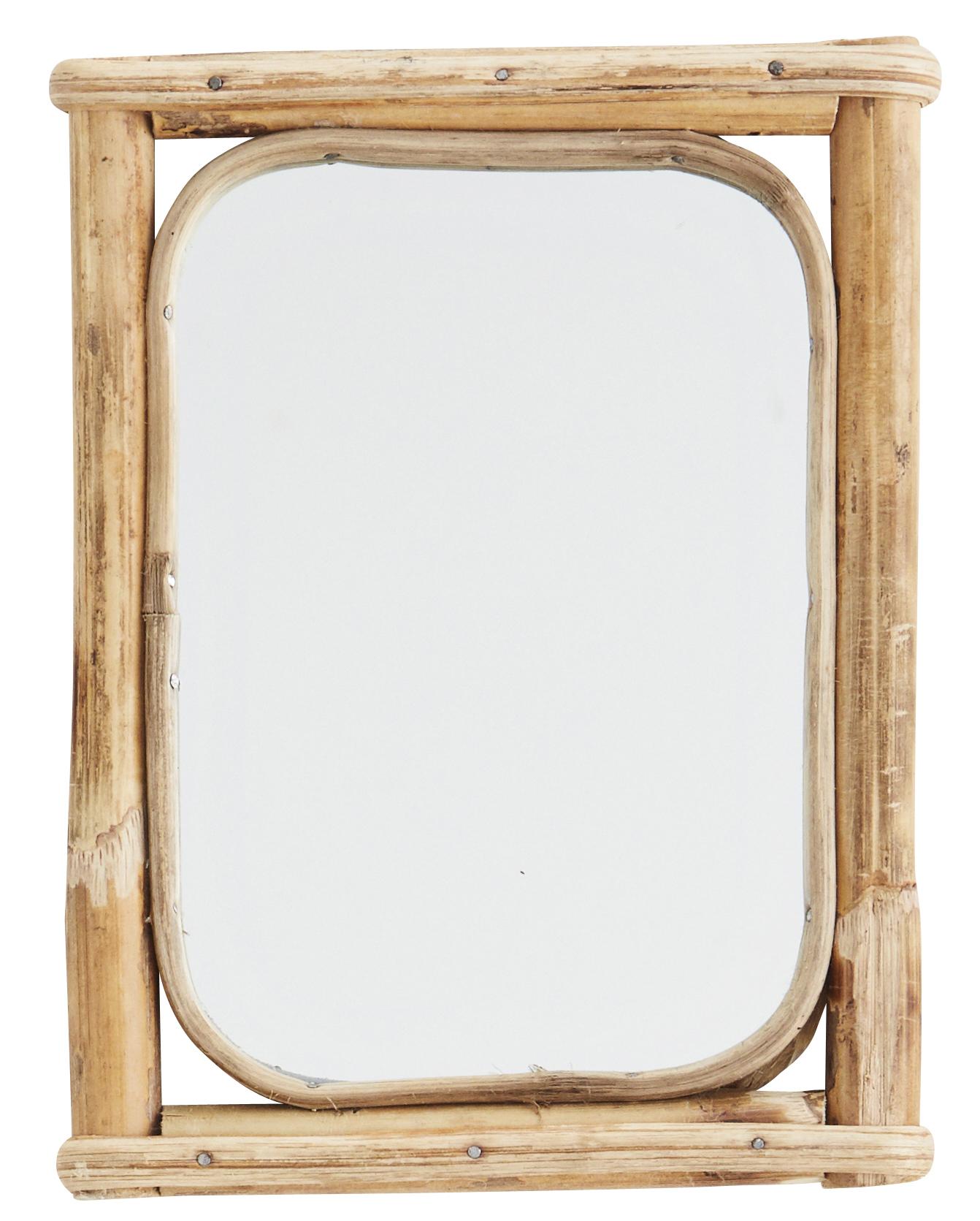 Fin spegel från Madam Stoltz, med rustik ram i bambu. Spegeln har ett bohemiskt utseende som passar lika bra i traditionella som okonventionellt inredda hem. Väggspegeln har fyrkantig form och mäter 15x20,5 cm. Den nätta storleken gör att väggspegeln är supersnygg att matcha tillsammans med andra spegelmodeller. Spegeln är handtillverkad vilket gör att varje enskild artikel kan variera något i utseende.