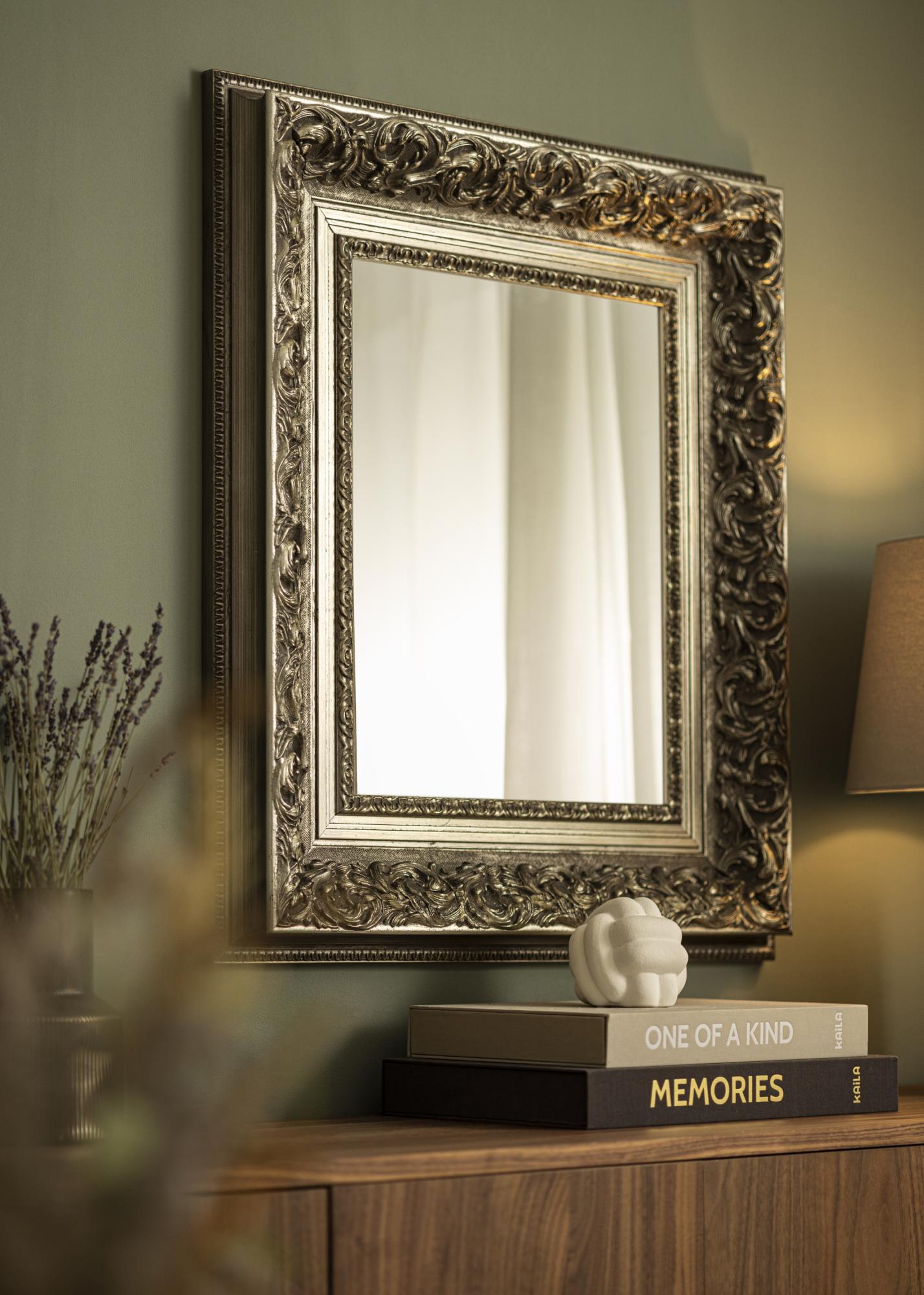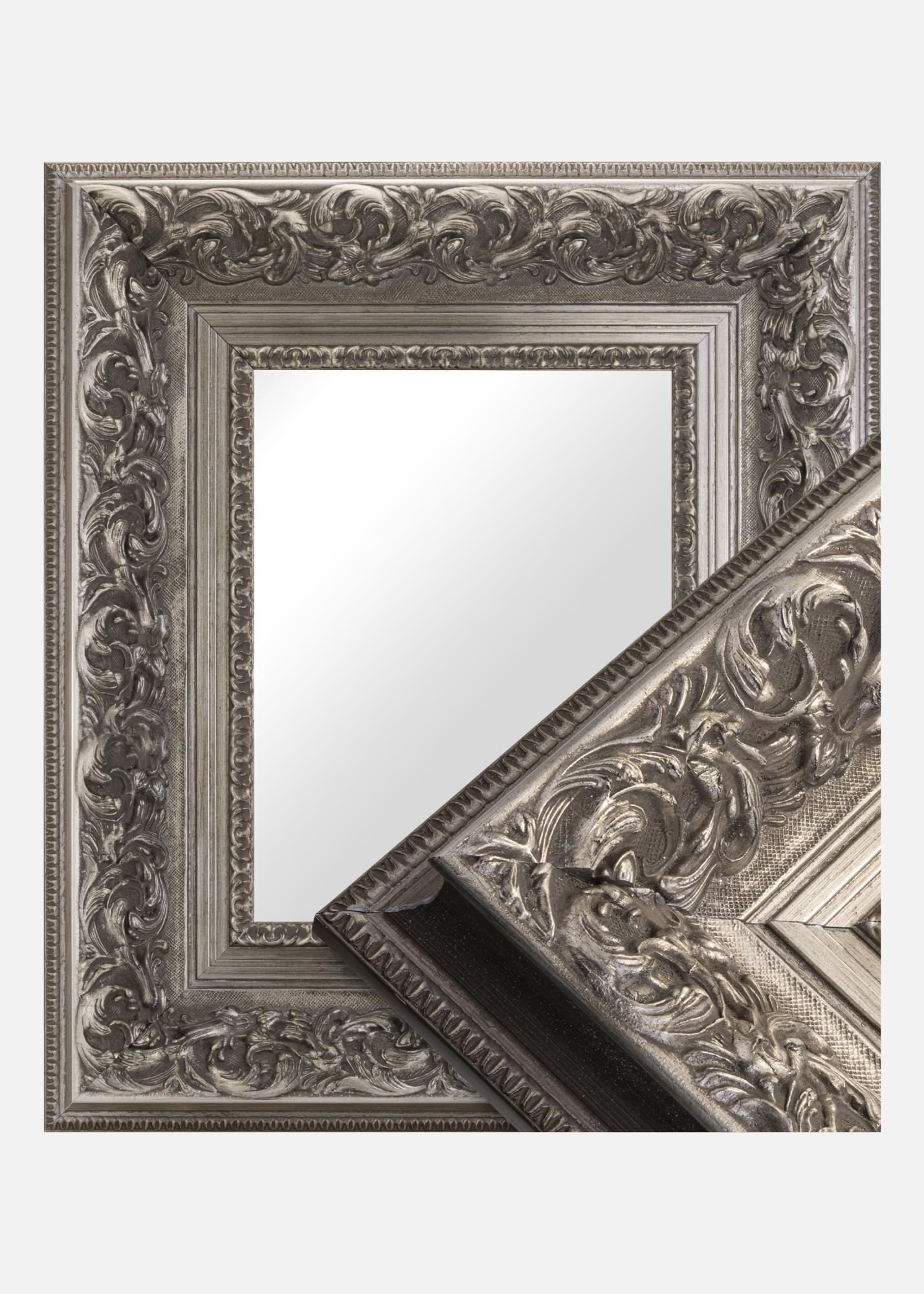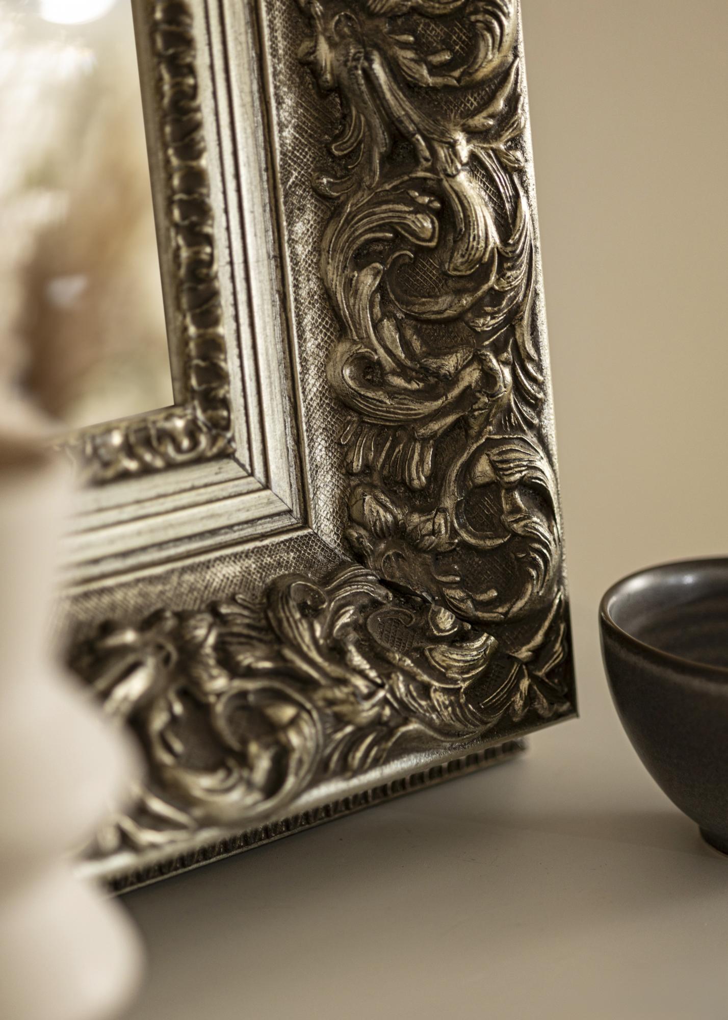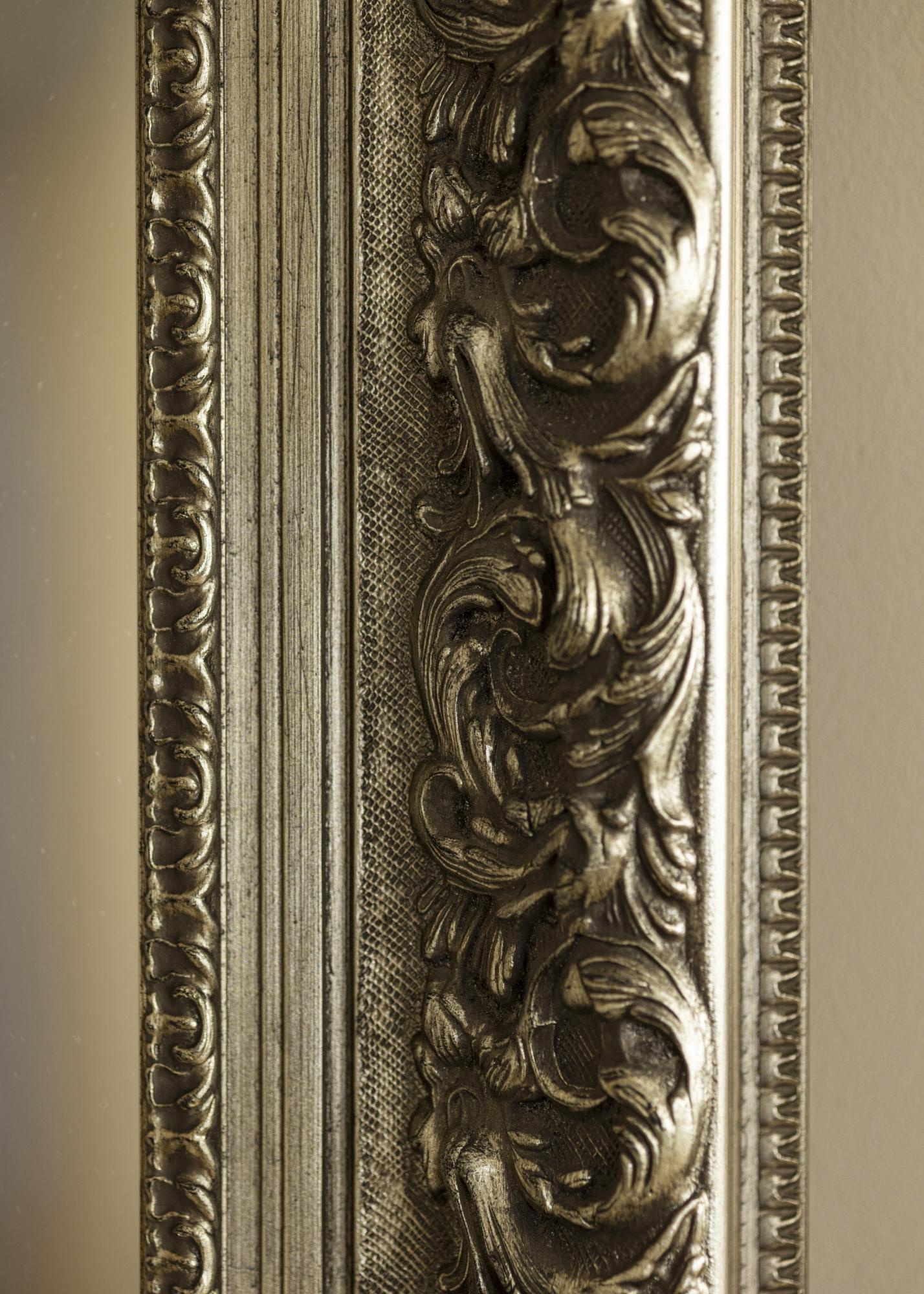 Spegel Birmingham Silver är en måttbeställd spegel som tillverkas av oss, vilket ger dig möjlighet att få den i precis de mått du önskar. Med sin imponerande 152 mm breda ramlist och ett djup på 74 mm, blir denna spegel en iögonfallande detalj i vilket rum den än placeras. Ramen är tillverkad av furu och har en rikt ornamenterad design i antiksilver, vilket ger spegeln en unik karaktär.