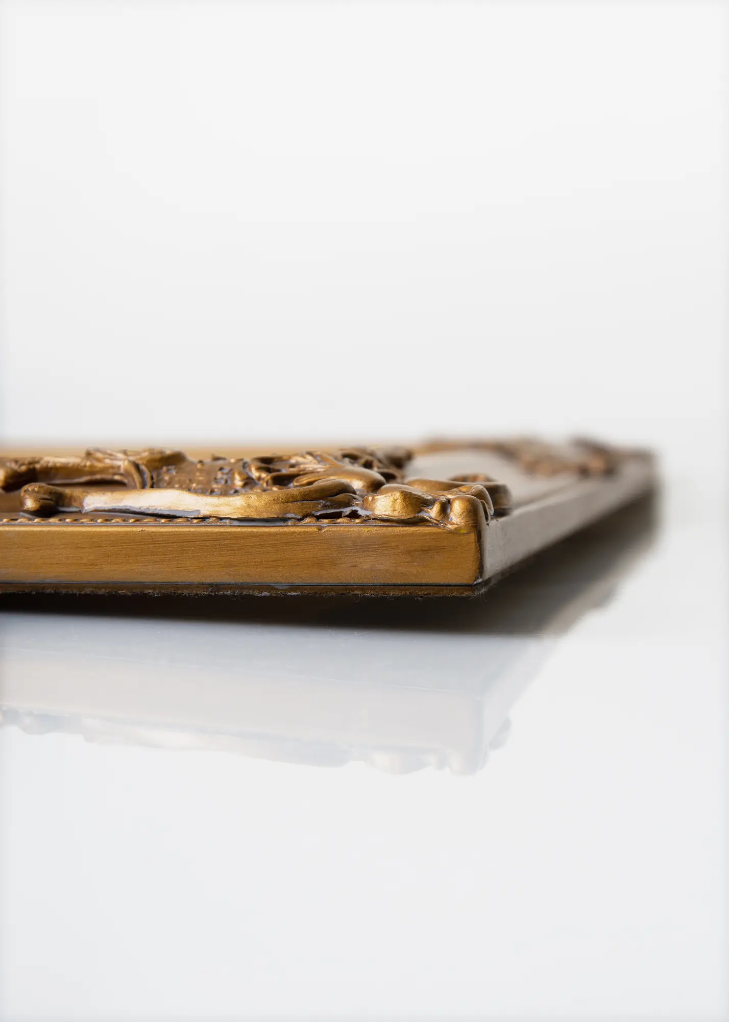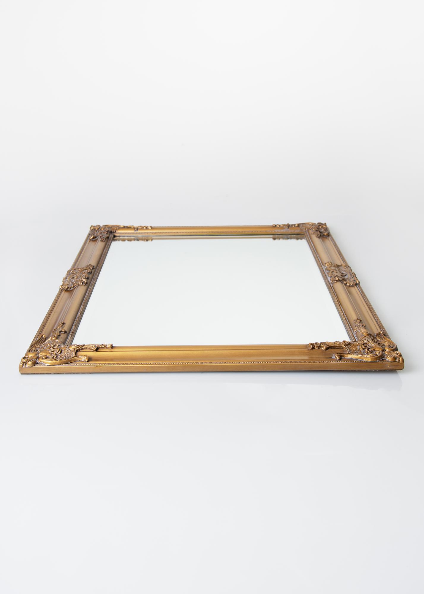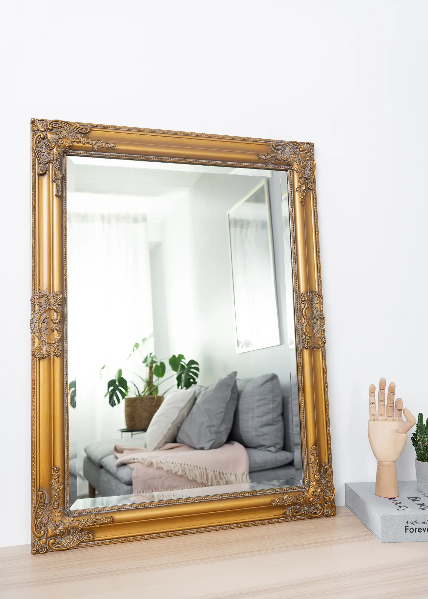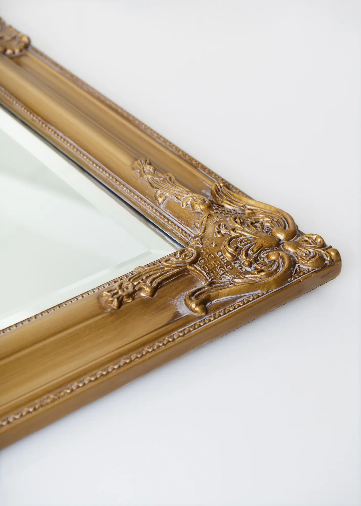 Spegelserien Bologna Guld har latinsk utformning med riklig dekor i hörn och vid ramsidornas mittpunkter. Lite smalare ram än många andra speglar i den här stilen. Ramen är tillverkad i trä, och dekoren har gjutits i gips innan den applicerats på ramen. Passar perfekt som badrumsspegel.