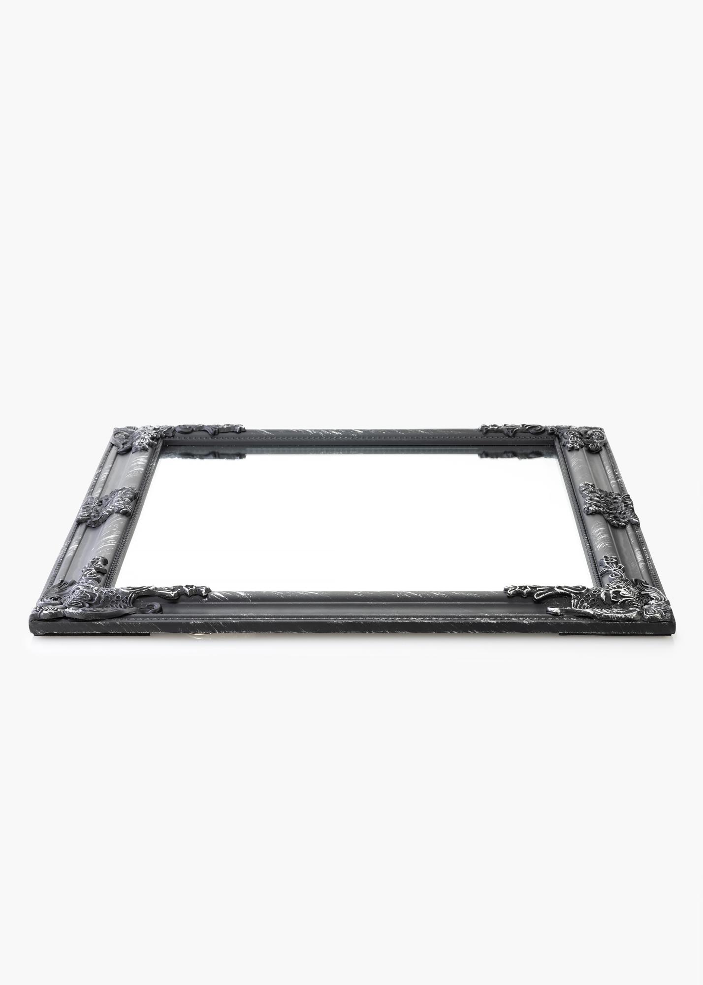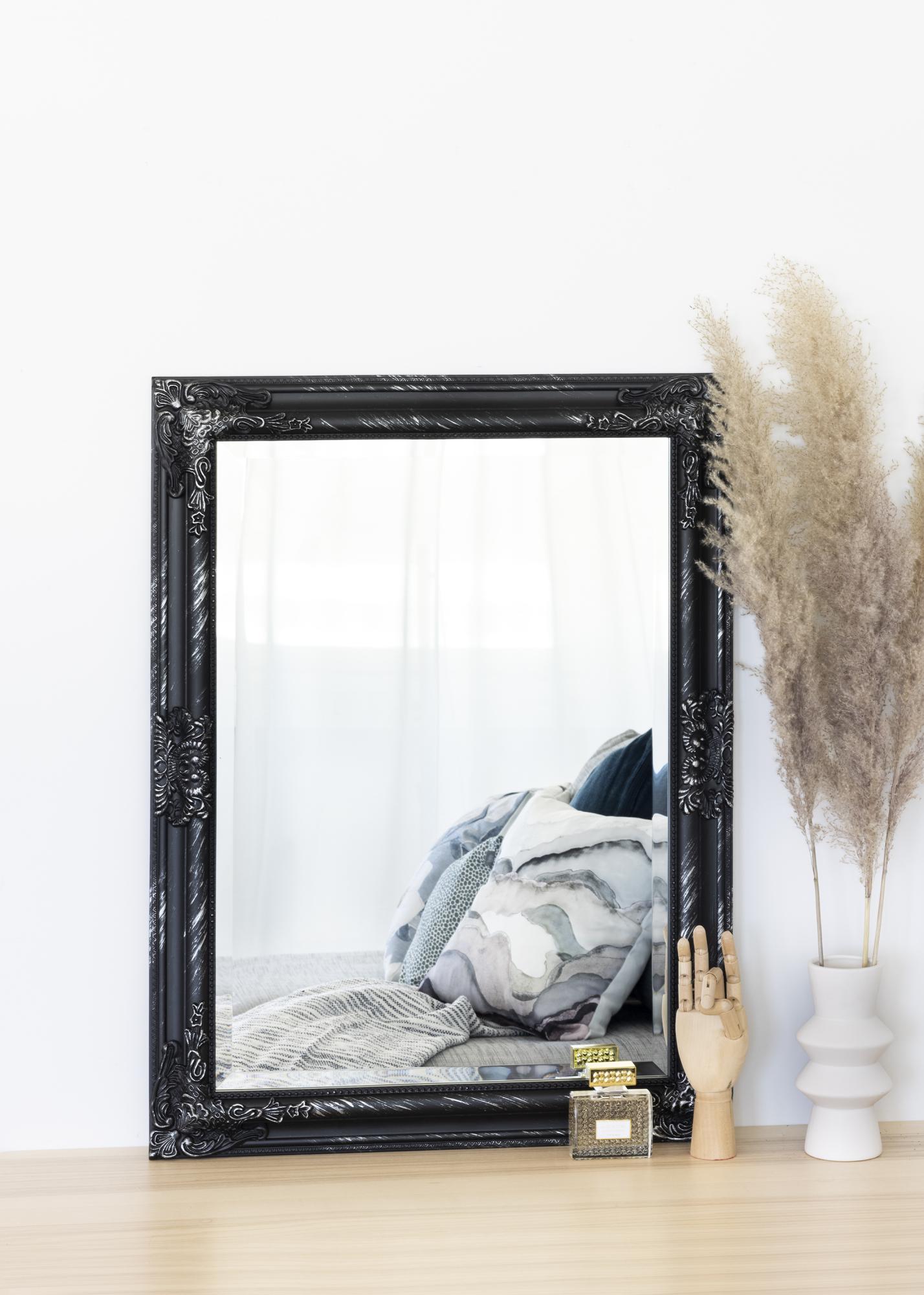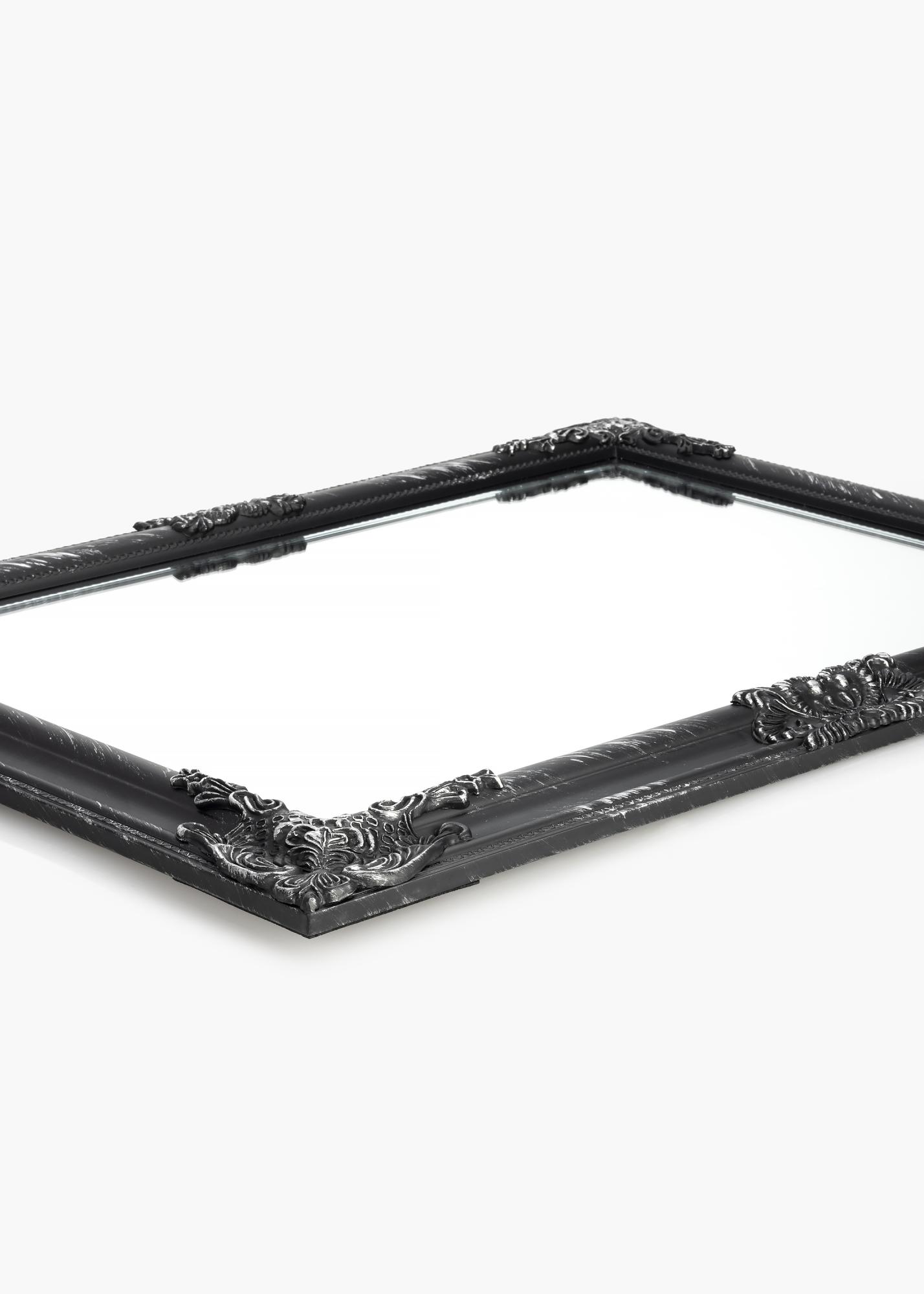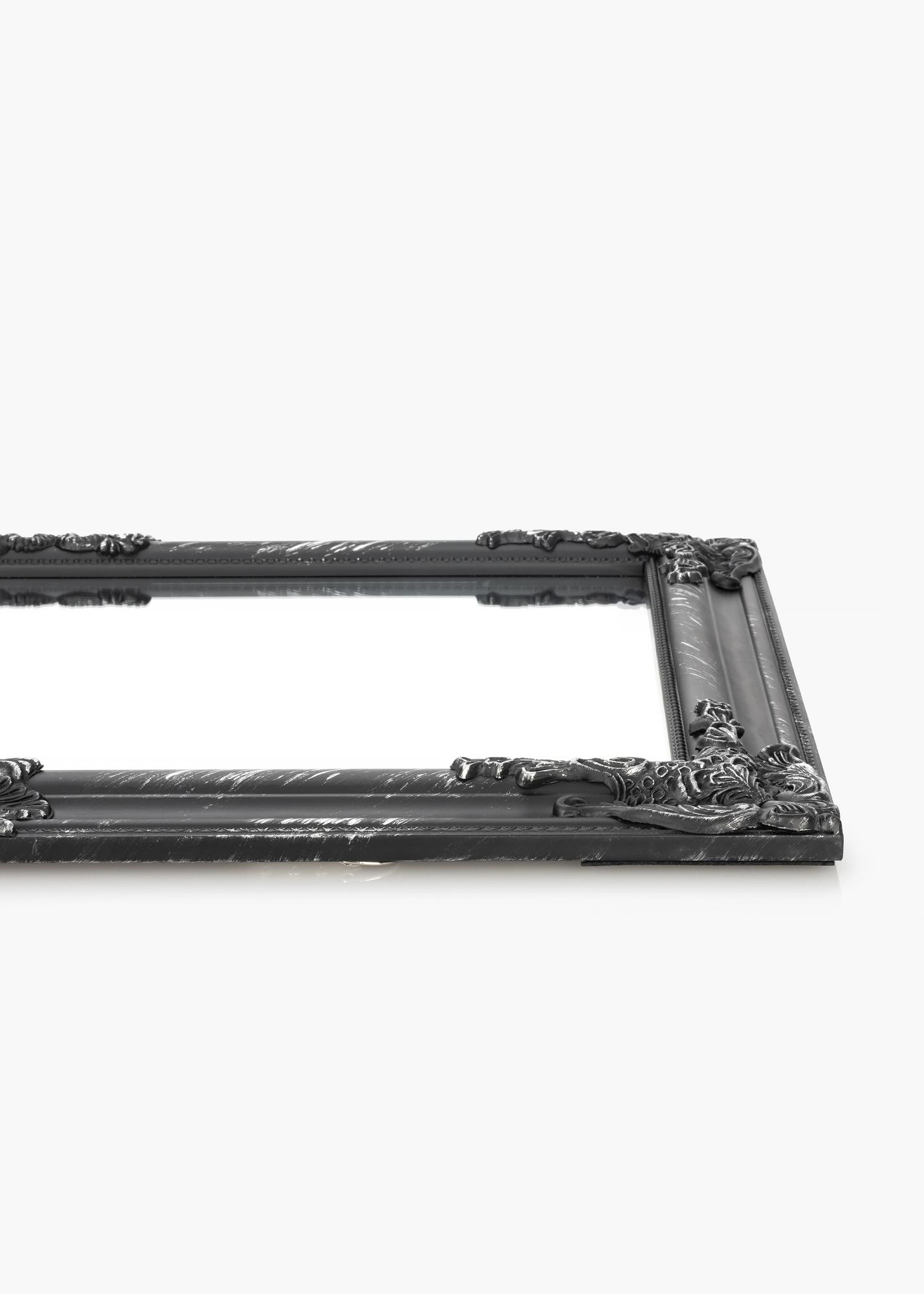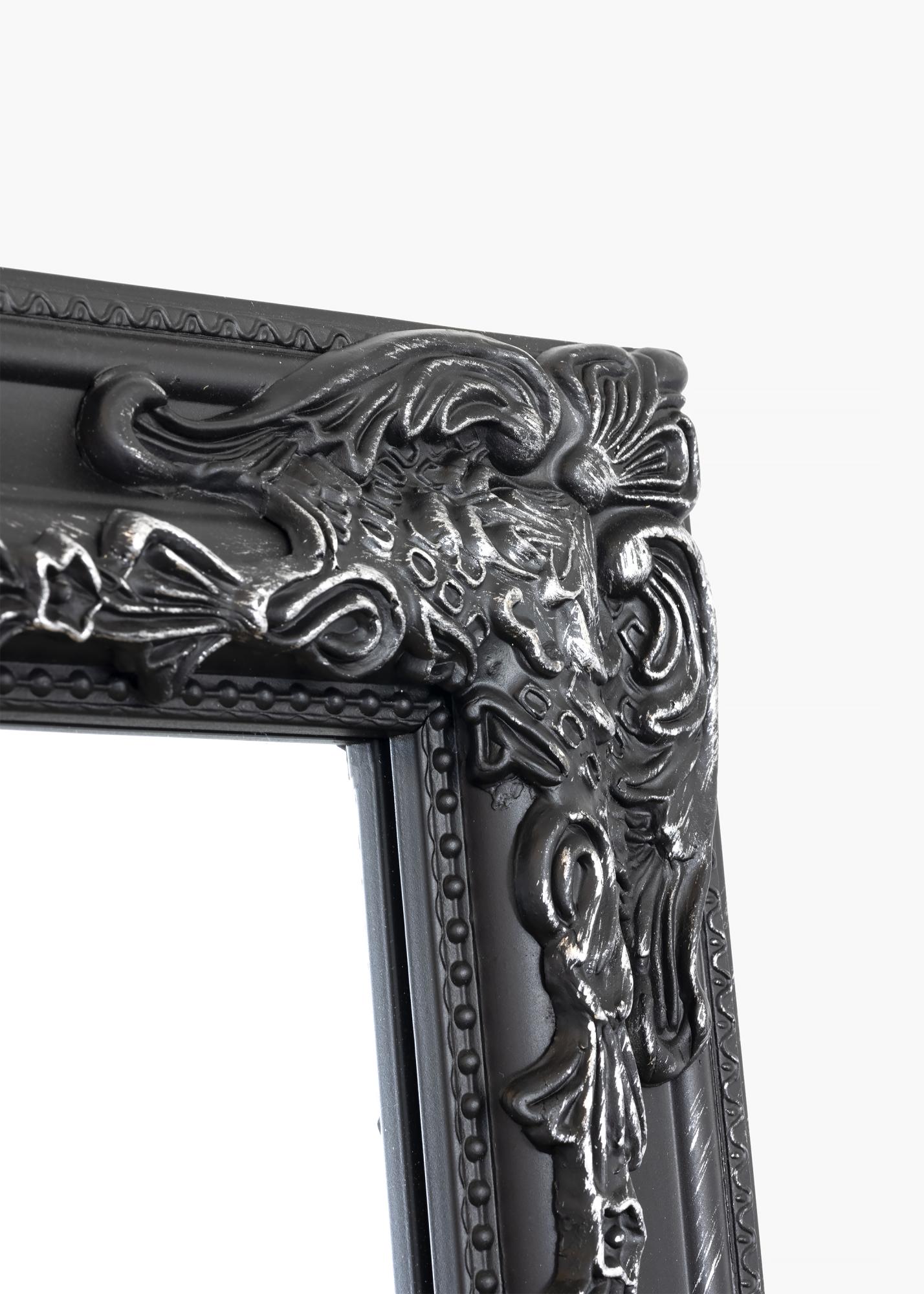 Spegelserien Bologna Svart har latinsk utformning med riklig dekor i hörn och vid ramsidornas mittpunkter. Lite smalare ram än många andra speglar i den här stilen. Ramen är tillverkad i trä, och dekoren har gjutits i gips innan den applicerats på ramen.