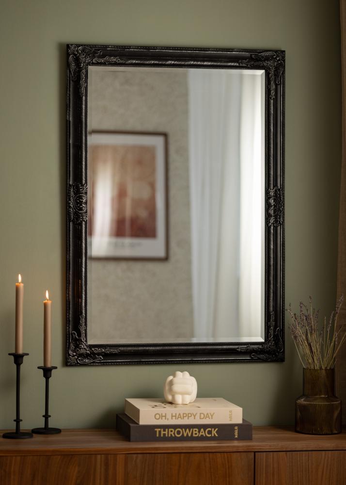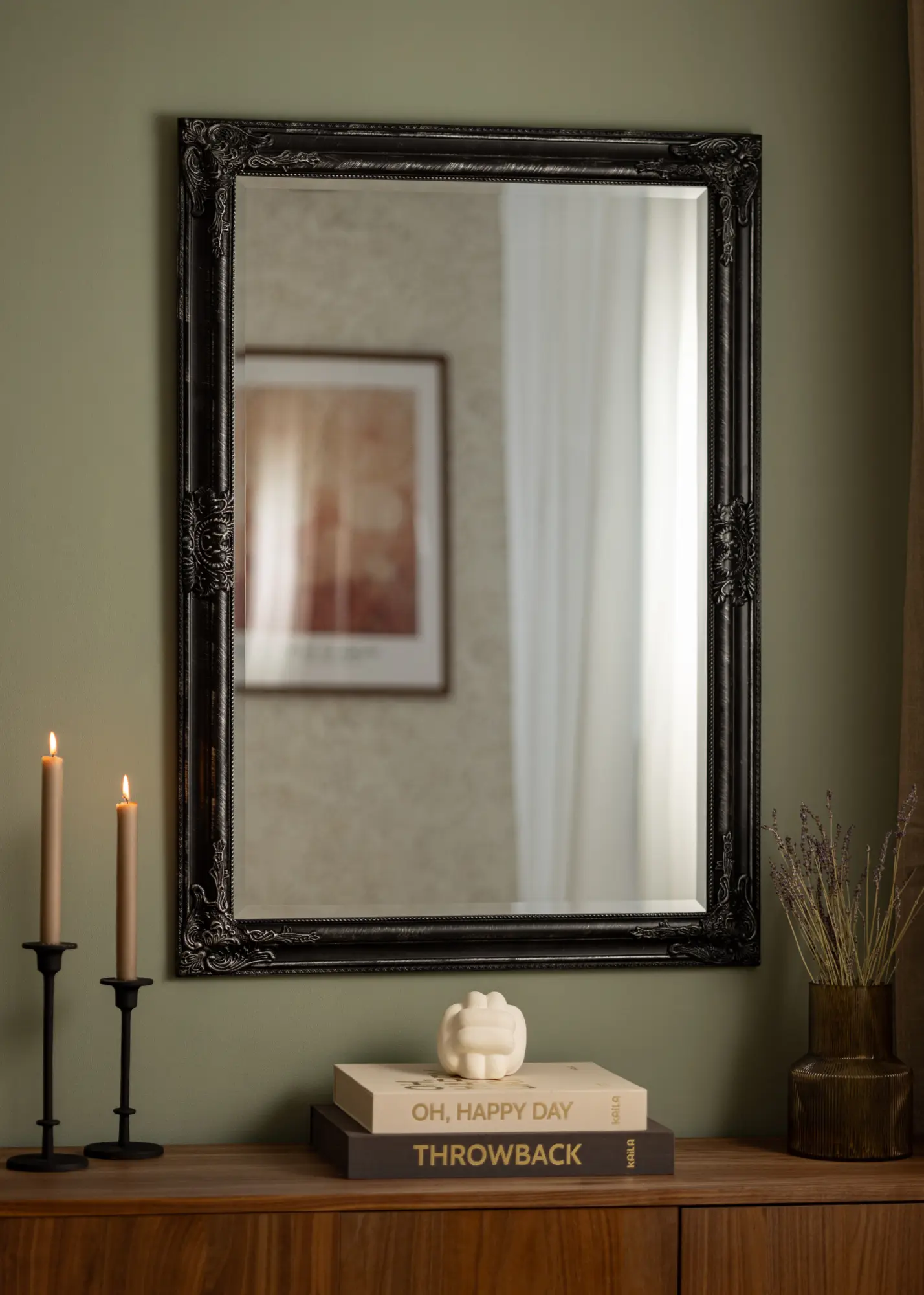 Spegelserien Bologna Svart har latinsk utformning med riklig dekor i hörn och vid ramsidornas mittpunkter. Lite smalare ram än många andra speglar i den här stilen. Ramen är tillverkad i trä, och dekoren har gjutits i gips innan den applicerats på ramen.