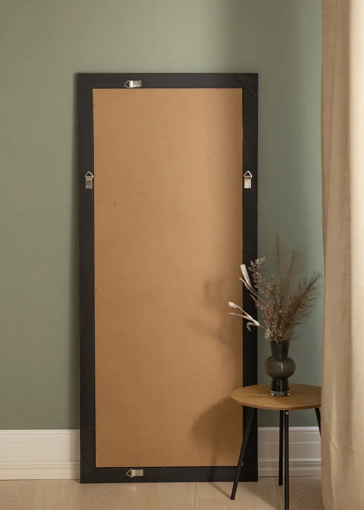 Den djupa svarta färgen på ramen skapar en dramatisk kontrast mot det klara spegelglaset, vilket förstärker ljuset och rymden i ditt hem. Denna spegel är inte bara en praktisk föremål utan också en konstnärlig inredningsdetalj som fångar blicken och ger karaktär till din vägg. Dess rektangulära form och stående orientering gör den idealisk för sovrum, hallar eller vardagsrum där du vill lägga till ett element av stil och funktion.
