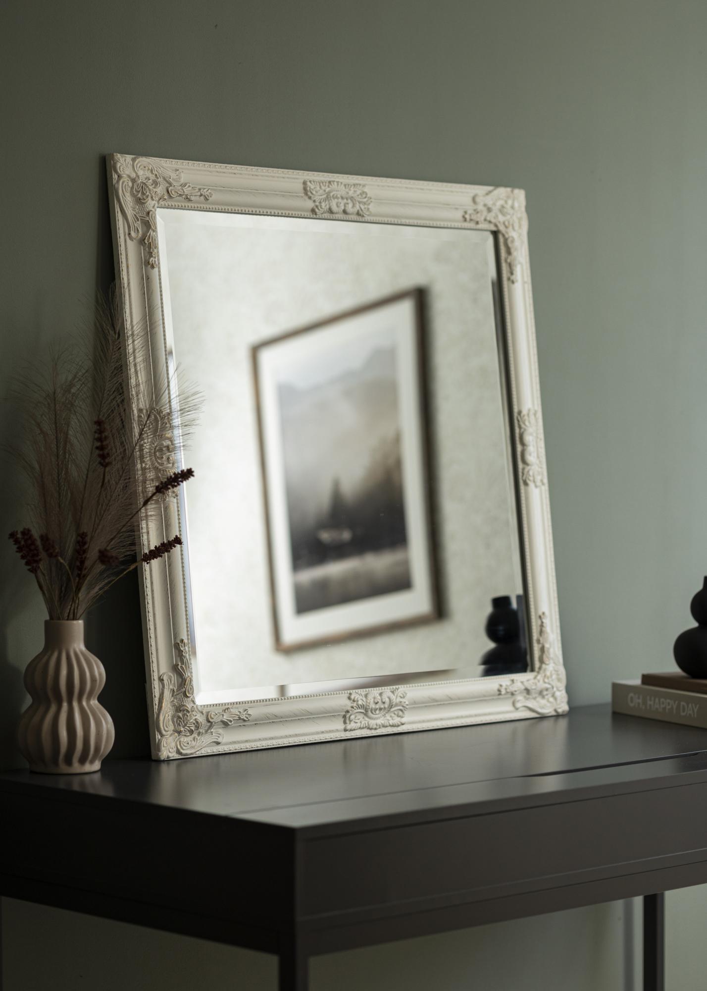 Upptäck den eleganta kvadratiska spegeln som mäter 80x80 cm, en perfekt storlek för att både vara funktionell och dekorativ i ditt hem. Denna spegel har en kvadratisk form som ger en symmetrisk och balanserad känsla, vilket gör den till ett iögonfallande inslag i vilket rum som helst. Den vita ramen är rikt utsmyckad med klassiskt inspirerade detaljer, vilket skapar en tidlös elegans och charm.