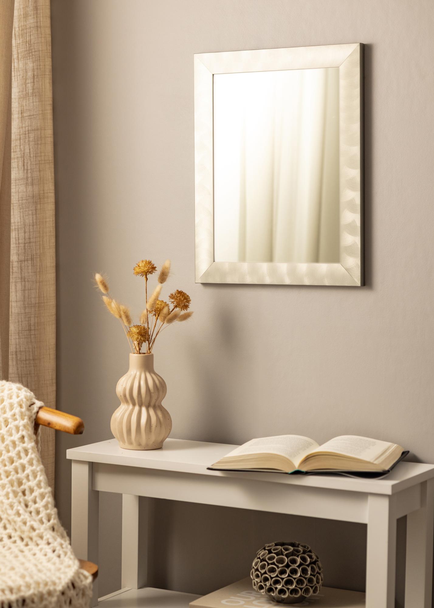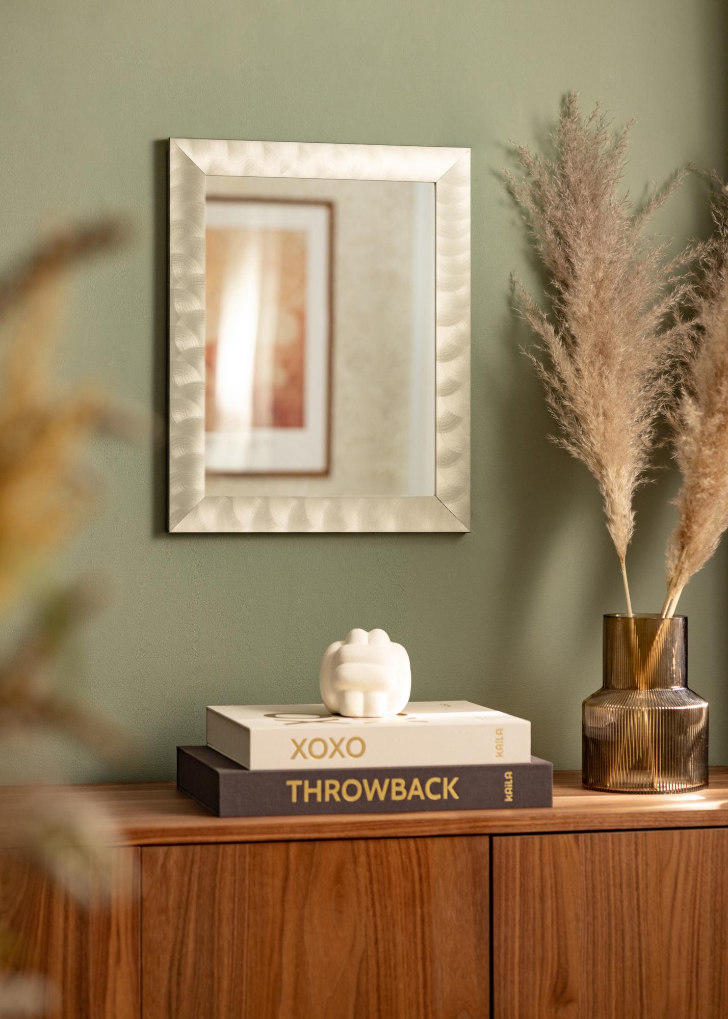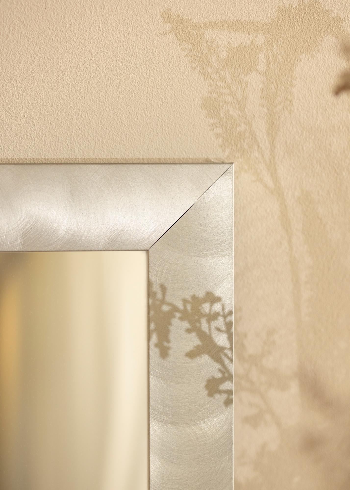 Diskret spegel med en slät bred ram tillverkad i Tyskland i aluminium av hög kvalité. Ramen har ett utseende av ljust levande stål och med sitt rena designspråk gör sig spegeln bra i så väl det minimalistiska som det lantliga hemmet och passar in i alla typer av rum. Häng spegeln i ett rum med tavlor som har ramar i silver eller svart och kombinera med inredningsaccessoarer i gråskalan för att hålla ihop inredningen.