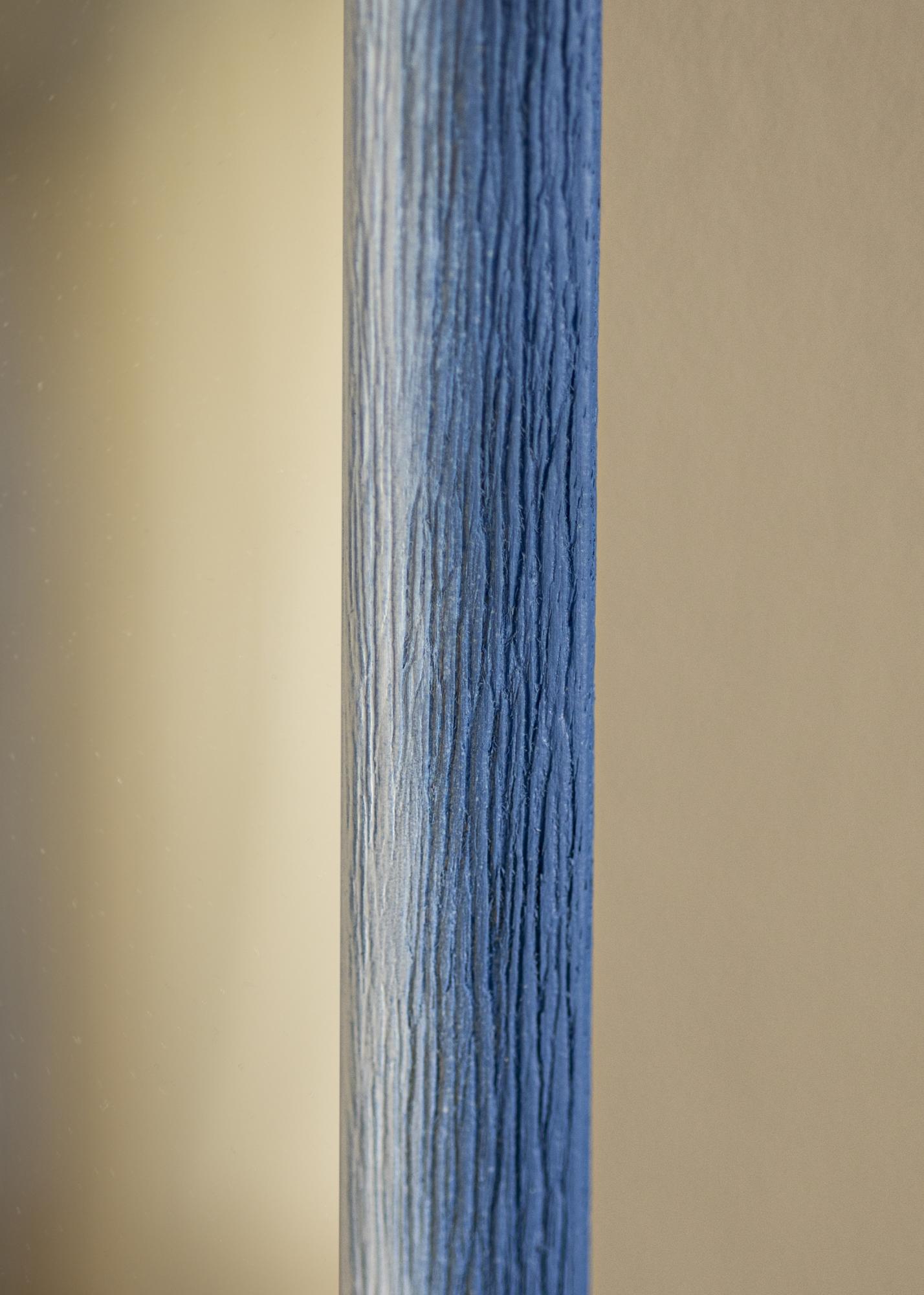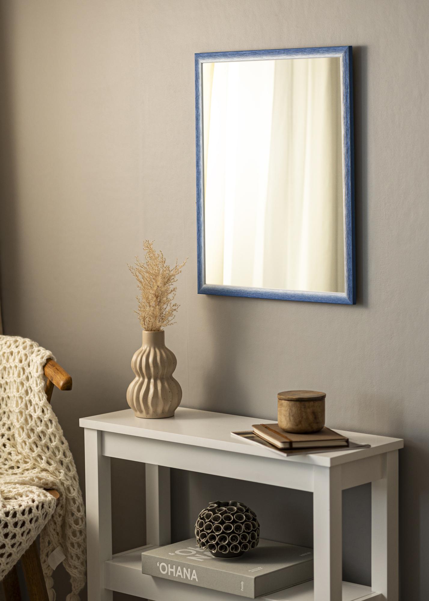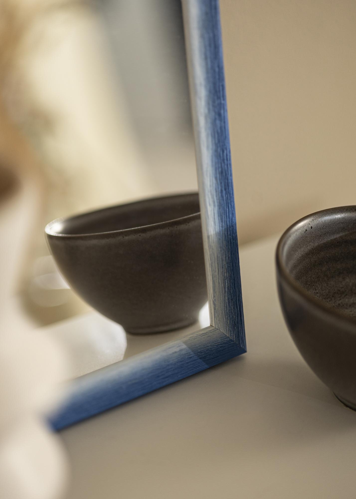 Denna spegel har en levande färgskala som skiftar från en ljus, nästan vit ton till en djupare blå. Denna variation i färg ger spegeln ett dynamiskt utseende som kan förändras beroende på ljuset i rummet. Ytan har en tydlig trästruktur med vertikala ådringar, vilket ger en naturlig och taktil känsla. Övergången mellan de olika nyanserna är mjuk och ger ramen ett handmålat, unikt uttryck.