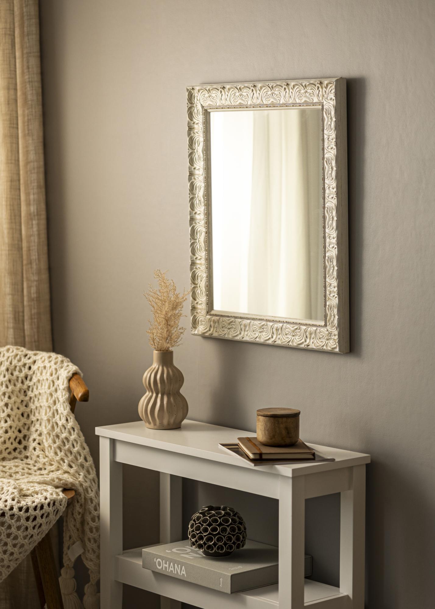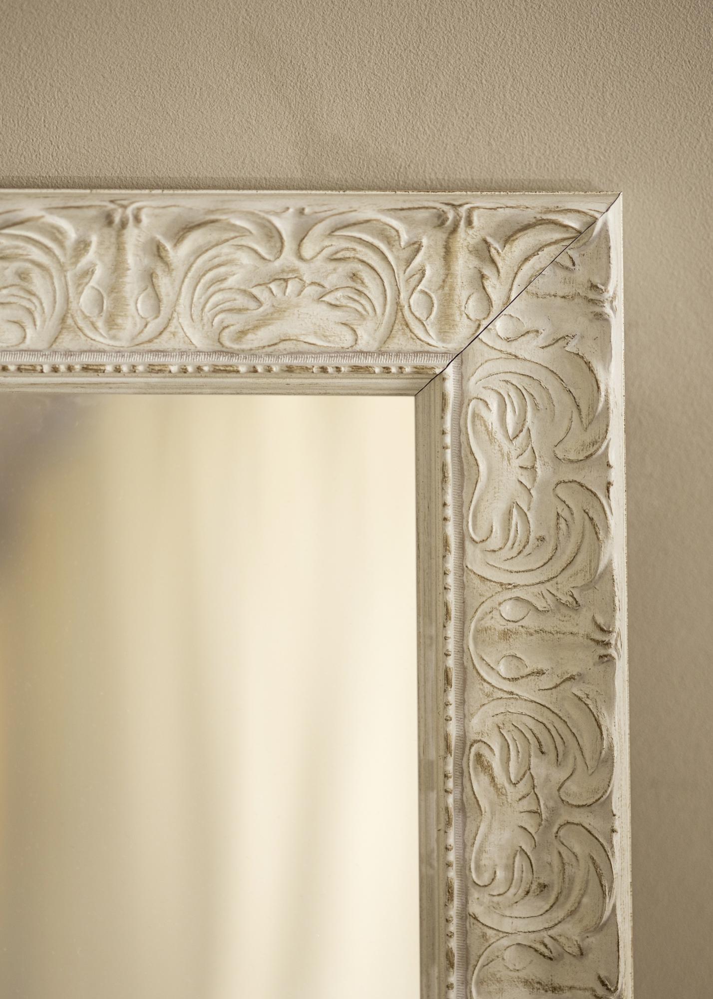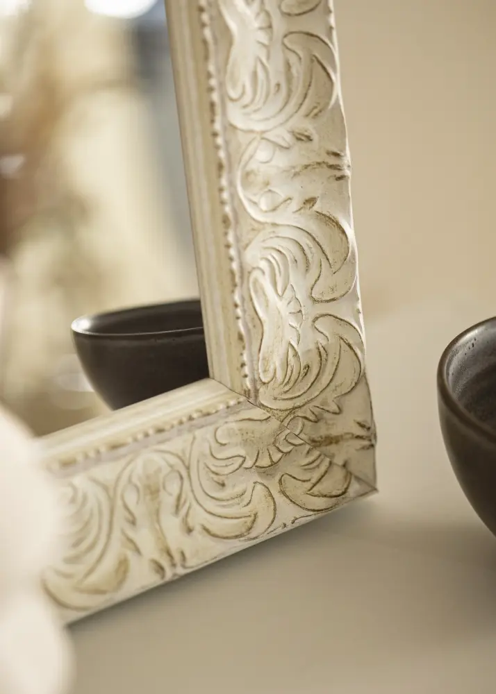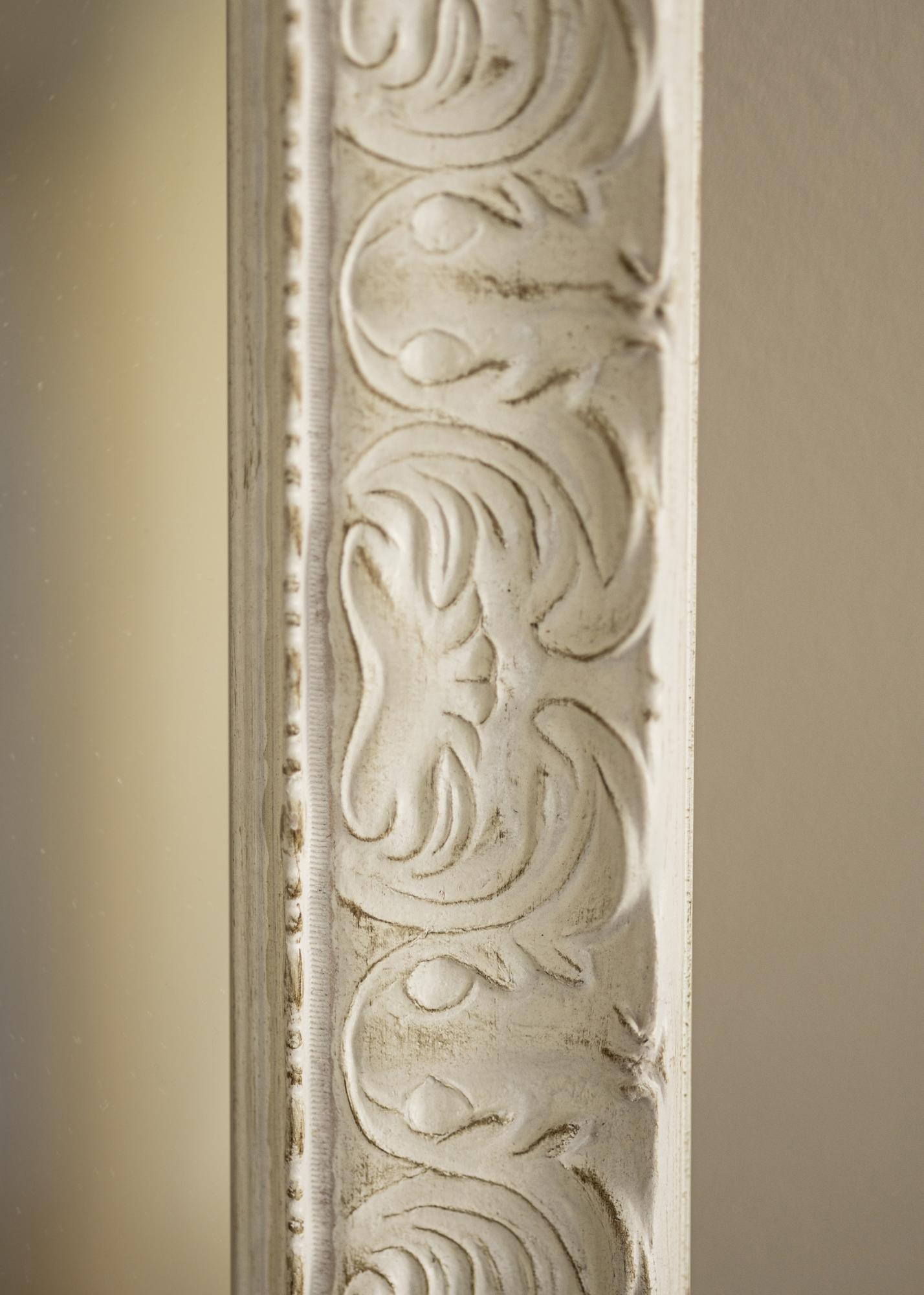 Spegelns antikvita finish med dekorativ relief och subtilt sliten yta ger den en unik karaktär. De utsmyckade detaljerna förstärker dess klassiska uttryck och gör den till ett blickfång i rummet. Oavsett om du har en modern eller traditionell inredning kommer denna spegel att smälta in och samtidigt tillföra något extra.