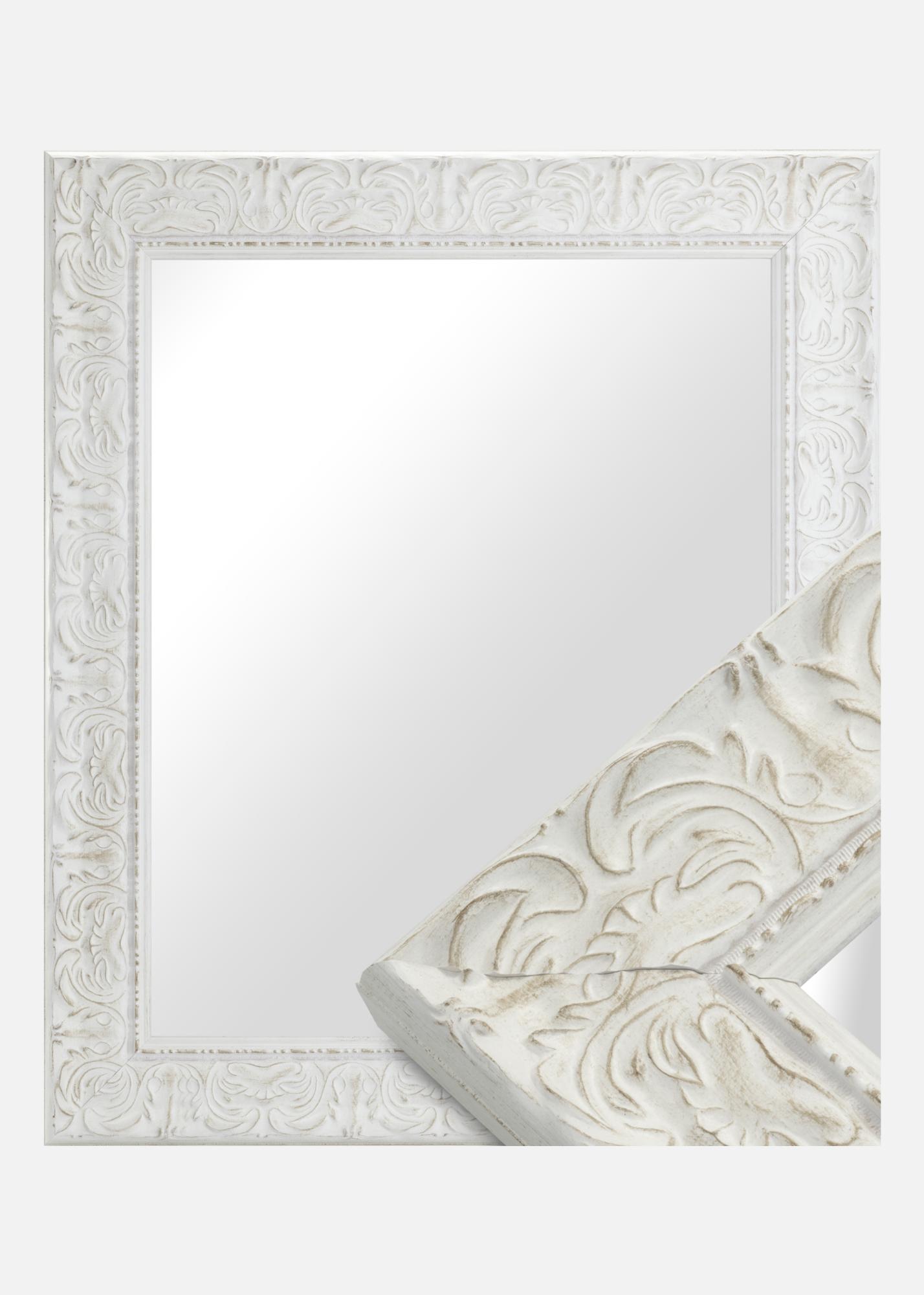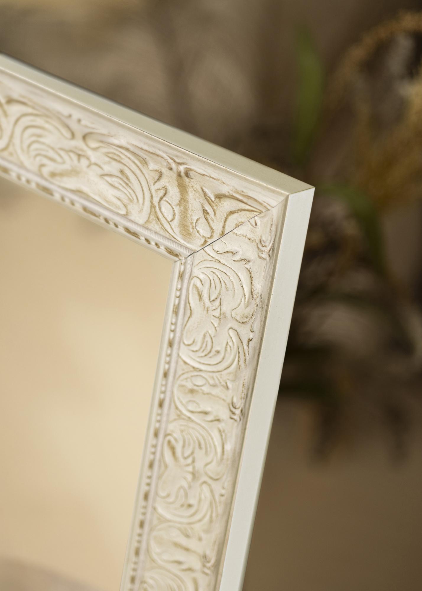 Den vita färgen på spegeln ger ett fräscht och ljust intryck, vilket gör den lätt att matcha med olika inredningsstilar. Ramen är 70 mm bred och har ett djup på 35 mm, vilket ger spegeln en robust och gedigen känsla. Tillverkad av furu, kombinerar den hållbarhet med en naturlig skönhet.
