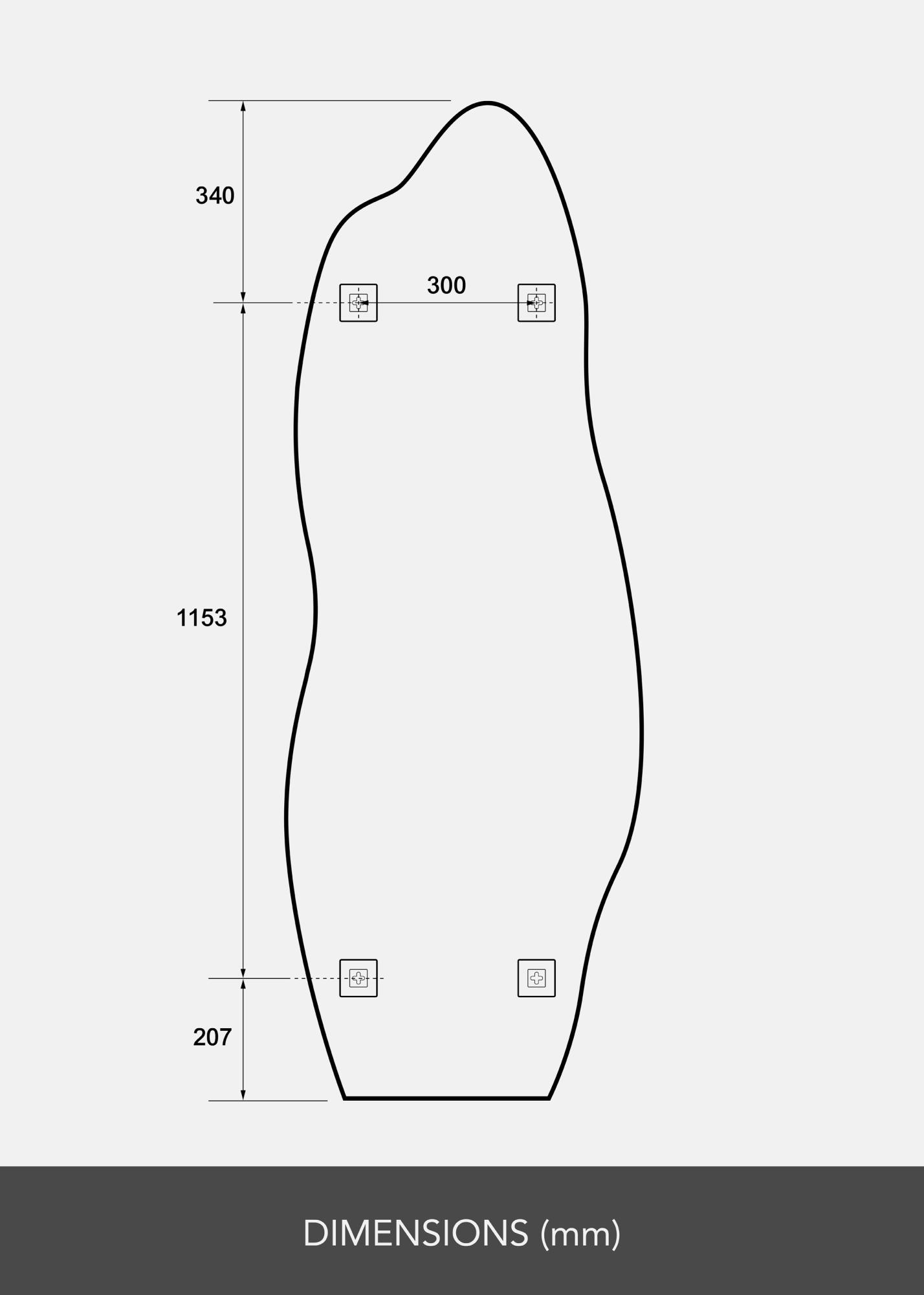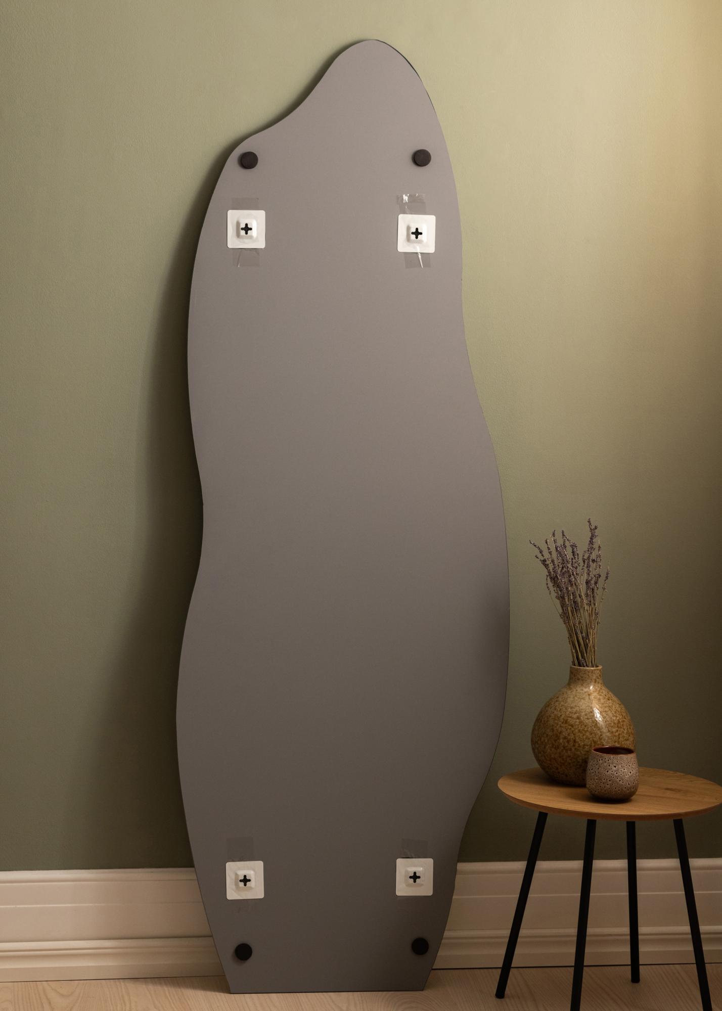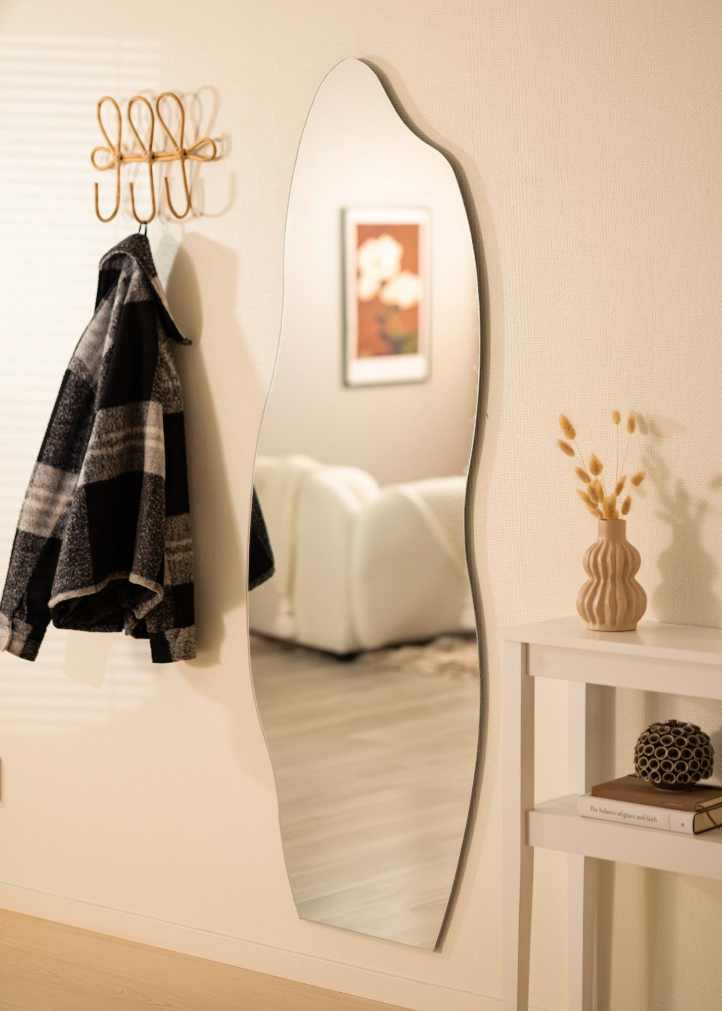 Spegeln har en unik, vågliknande form som är bred vid basen och svänger elegant uppåt. Denna ovanliga form gör den till ett konstverk i sig och tillför en dynamisk touch till din vägg. Den är designad för att vara en central punkt i ditt hem, oavsett om den placeras i hallen, sovrummet eller vardagsrummet.