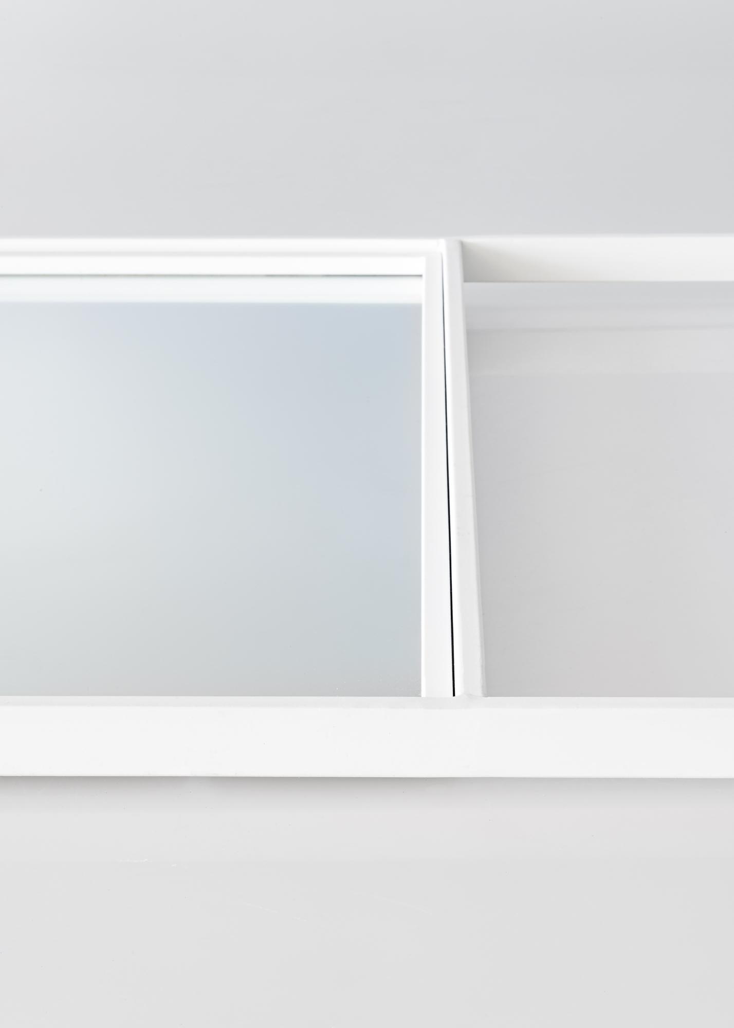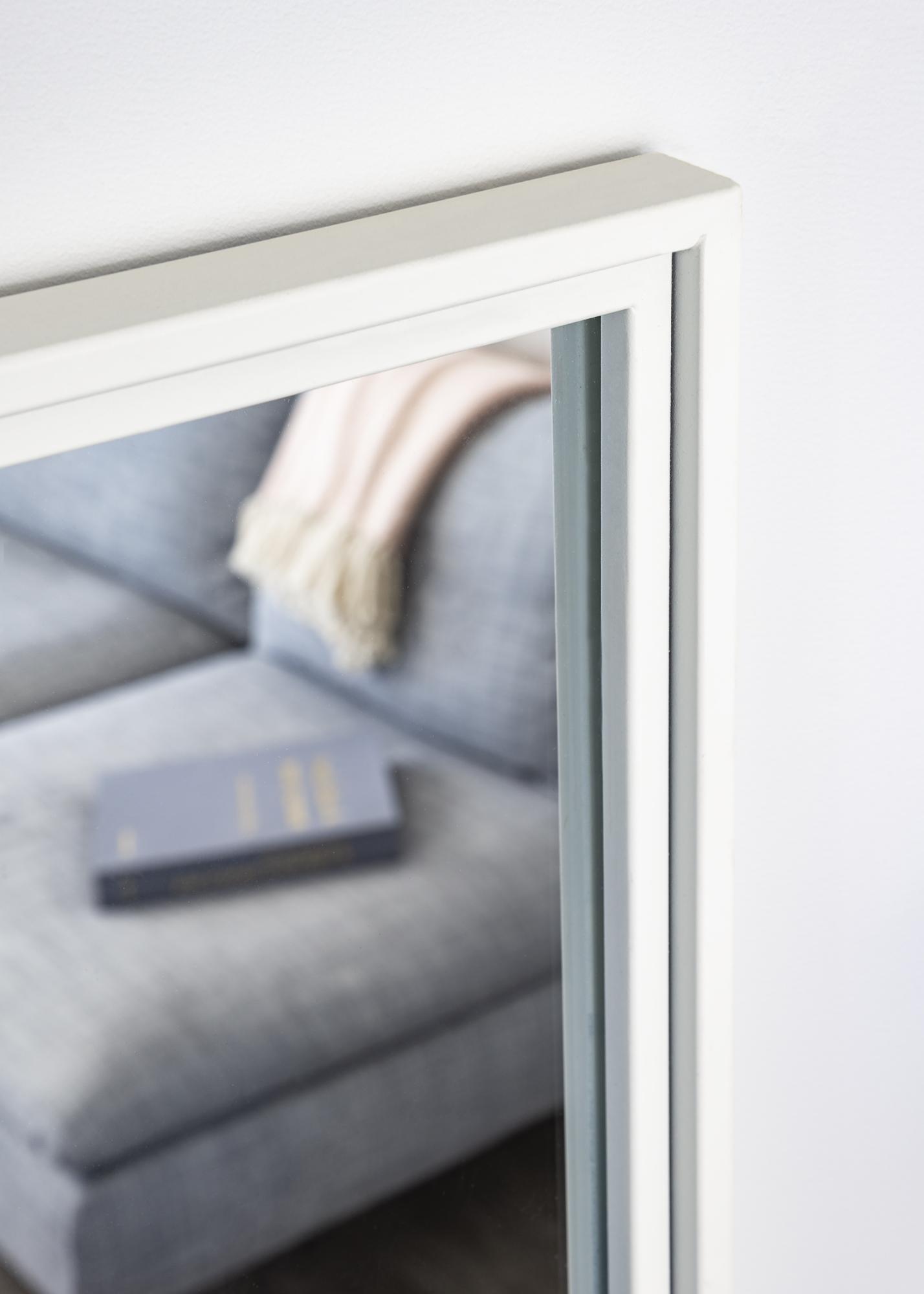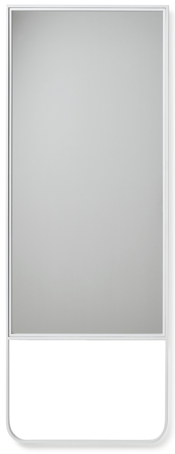 Denna rektangulära spegel har en kreativ och iögonfallande design, samtidigt som den är enkel och stilren. Spegelglaset fyller inte hela ramen i spegelns nedre del, och denna detalj i kombination med den tunna och vita metallramen ger spegeln ett intressant och luftigt intryck.