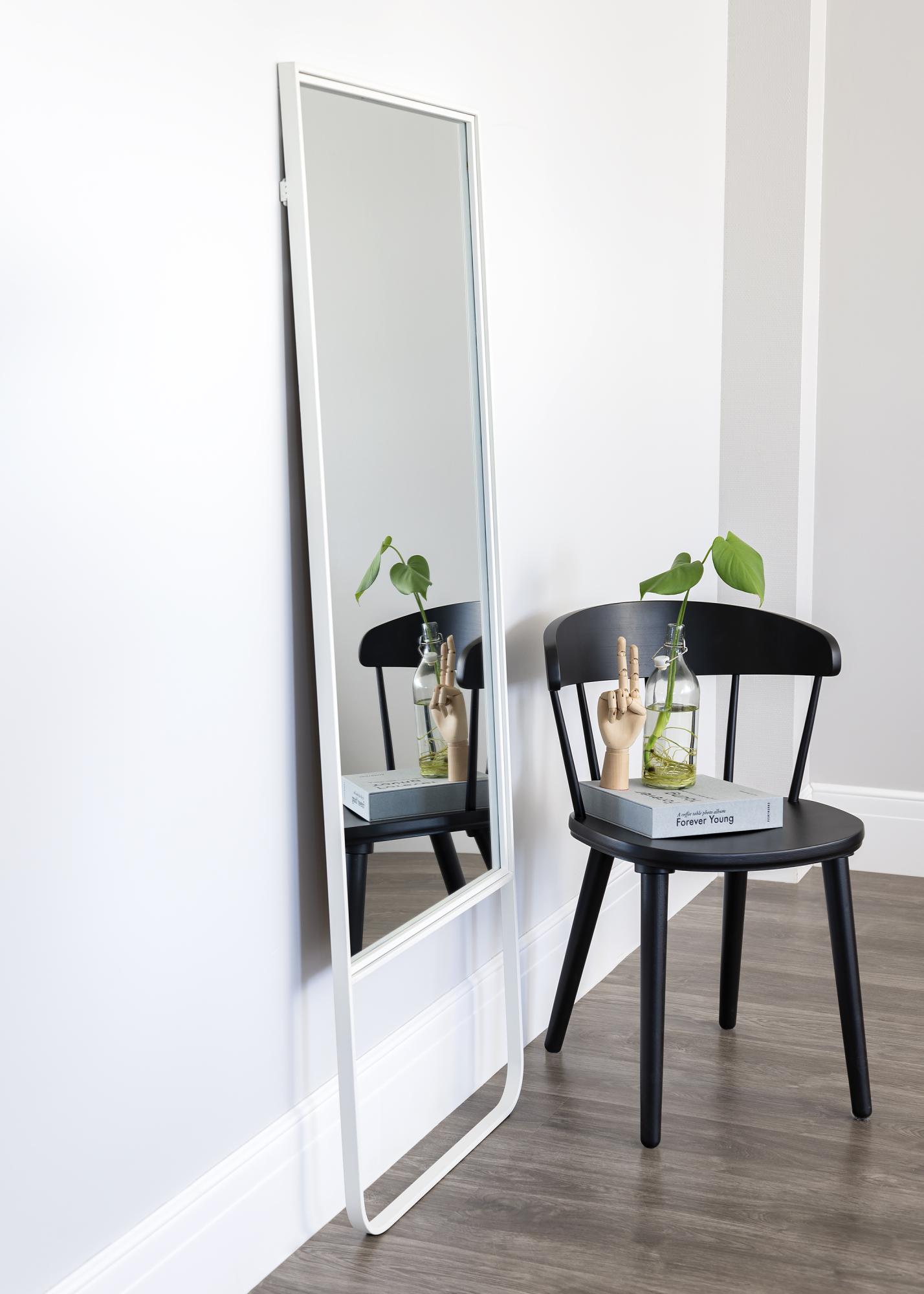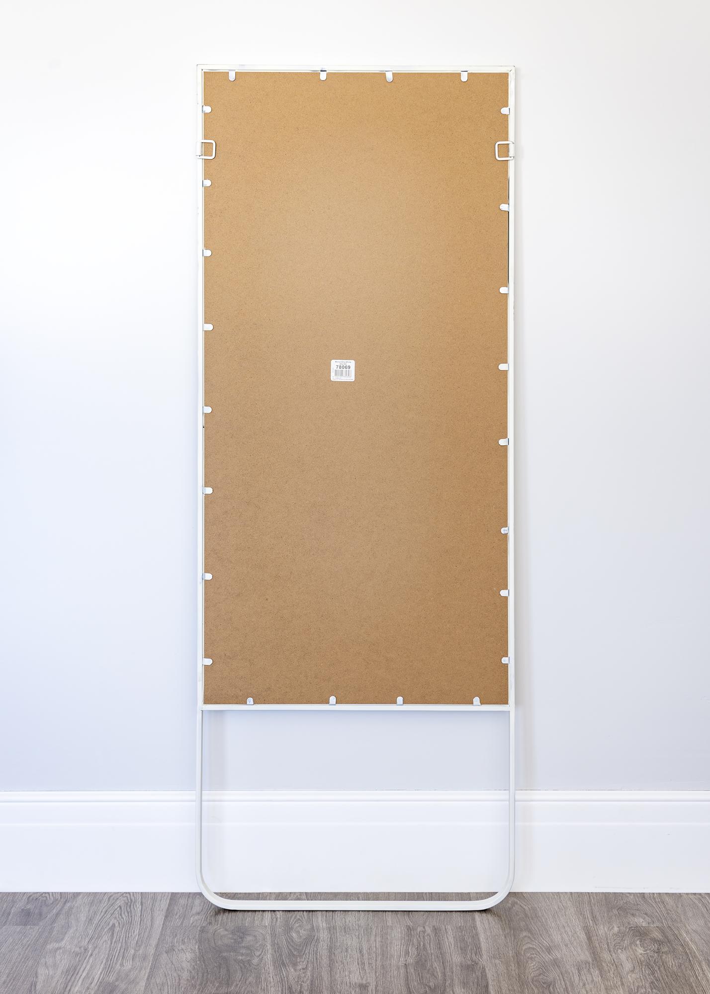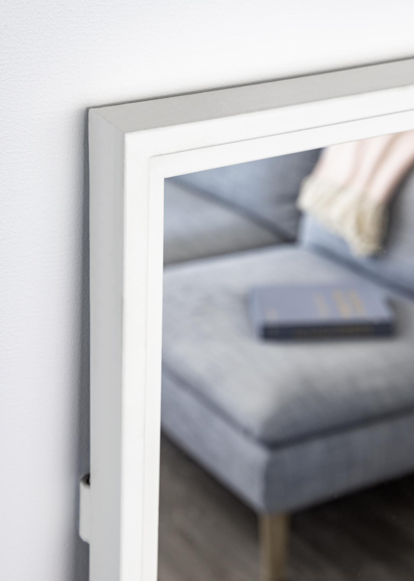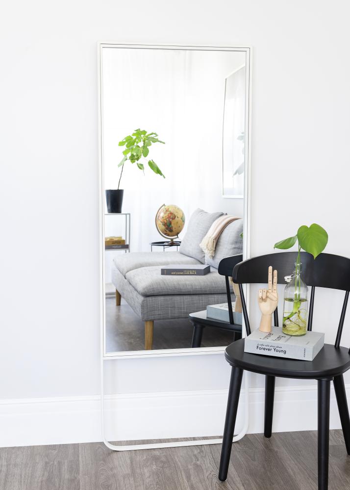 Denna rektangulära spegel har en kreativ och iögonfallande design, samtidigt som den är enkel och stilren. Spegelglaset fyller inte hela ramen i spegelns nedre del, och denna detalj i kombination med den tunna och vita metallramen ger spegeln ett intressant och luftigt intryck.