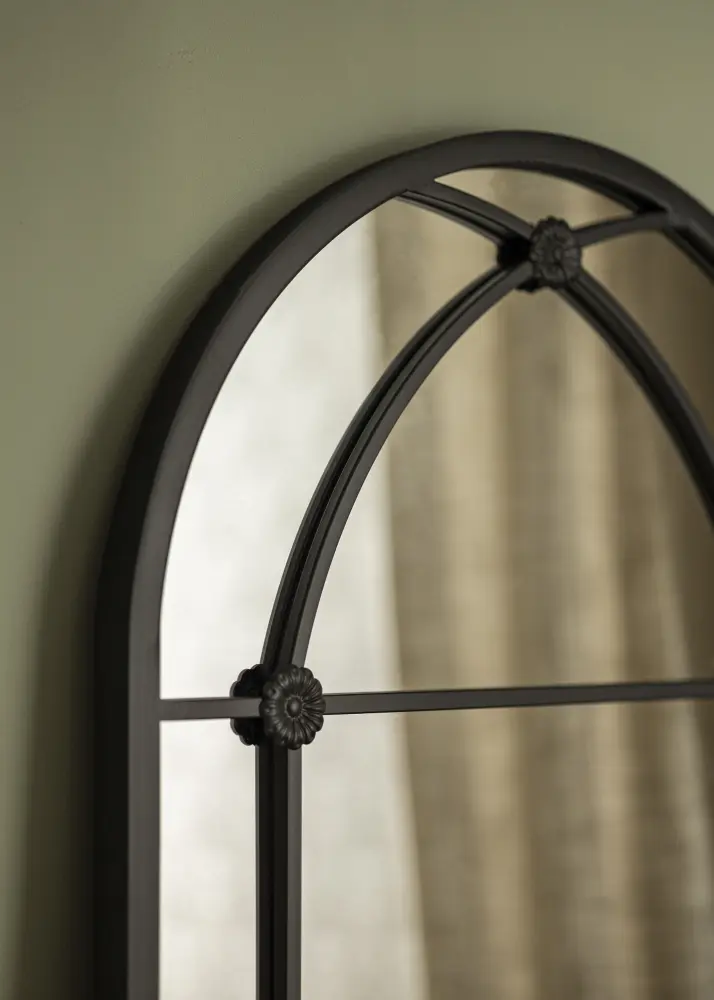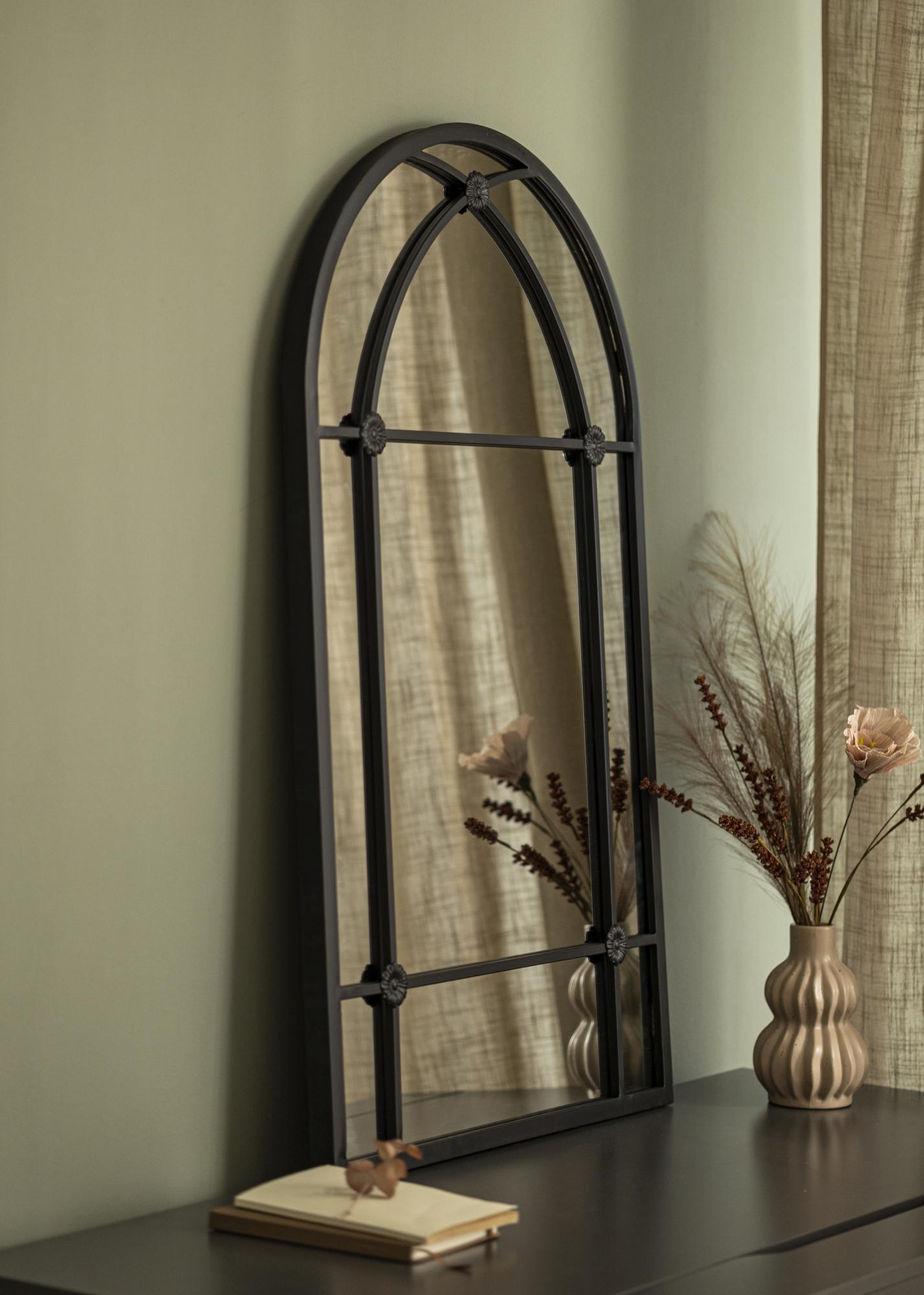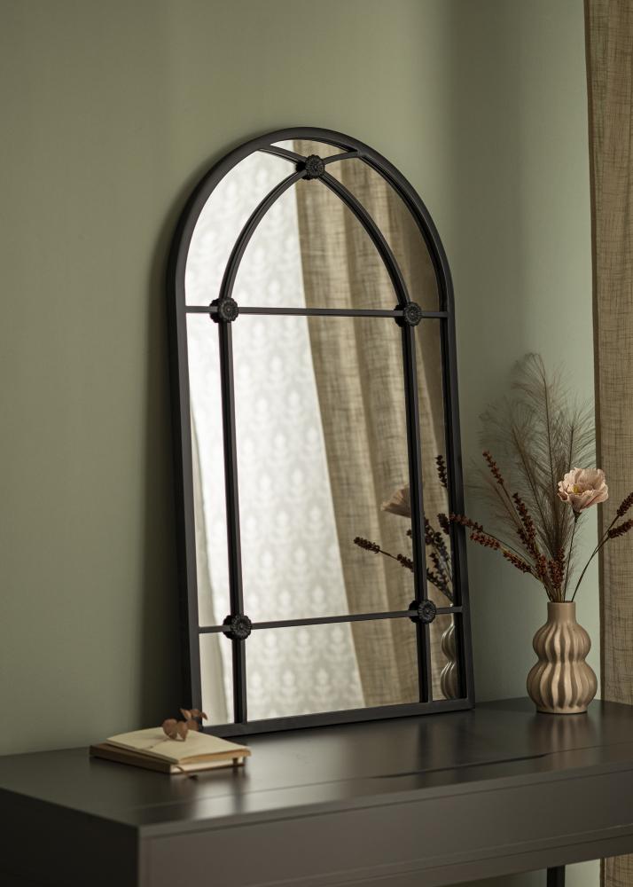 Med sin bågformade siluett och detaljrika järnarbete, påminner spegeln om klassiska fönster som ger en känsla av djup och rymd i rummet. Den är inte bara en praktisk föremål för daglig användning, utan också en konstnärlig inredningsdetalj som fångar blicken och bidrar till rummets atmosfär.