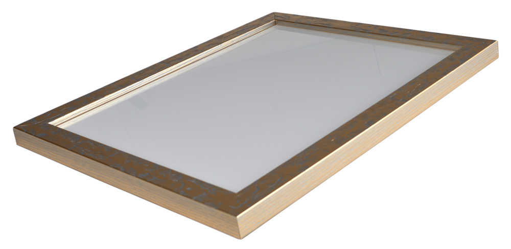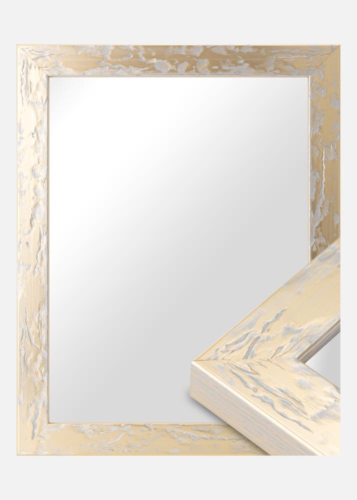 Freja är en vacker guldspegel med en ojämn ådrig yta med silverfärgade ojämnheter. Med sin kombination av silver och guldfärg får Freja en behaglig färgton som drar mer åt silver än guld. Med sin djupa på profil på 30mm kommer Freja Guld ut en bit från väggen vilket ger ett fint djup till spegeln.