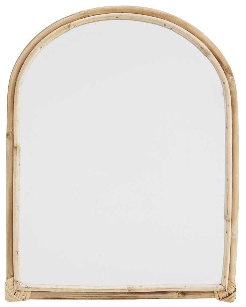 Valvformad spegel från Madam Stoltz, som blir en snygg detalj i hemmets alla rum. Spegeln har en elegant halvoval form med ram i bambu. Kombinationen av bambu och spegelglas blir bohemisk och naturnära, samtidigt som spegeln får en fräsch modernitet kring sig. Väggspegeln har ett mått på 36x47 cm. Den är tillverkad i naturmaterial vilket gör att varje enskild artikel kan variera något i utseende.